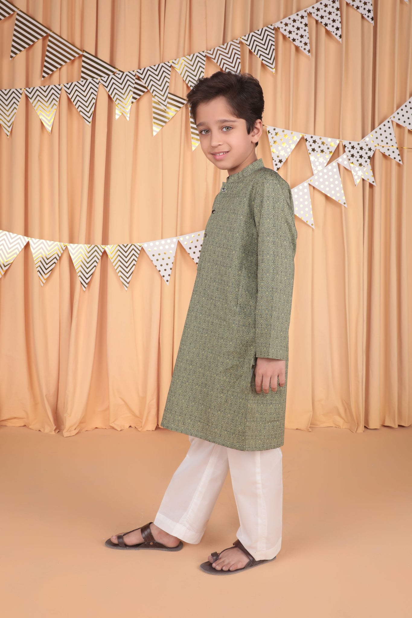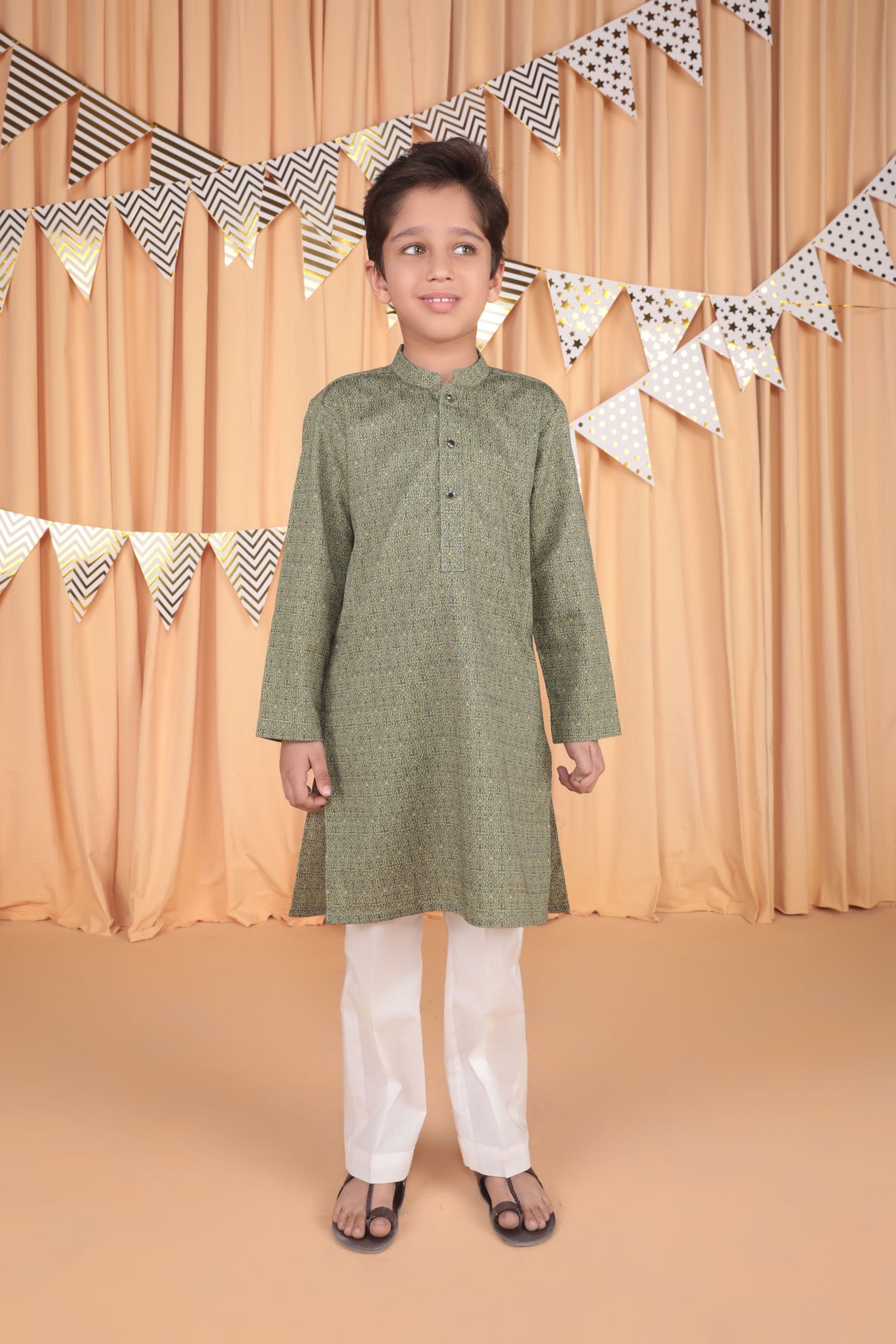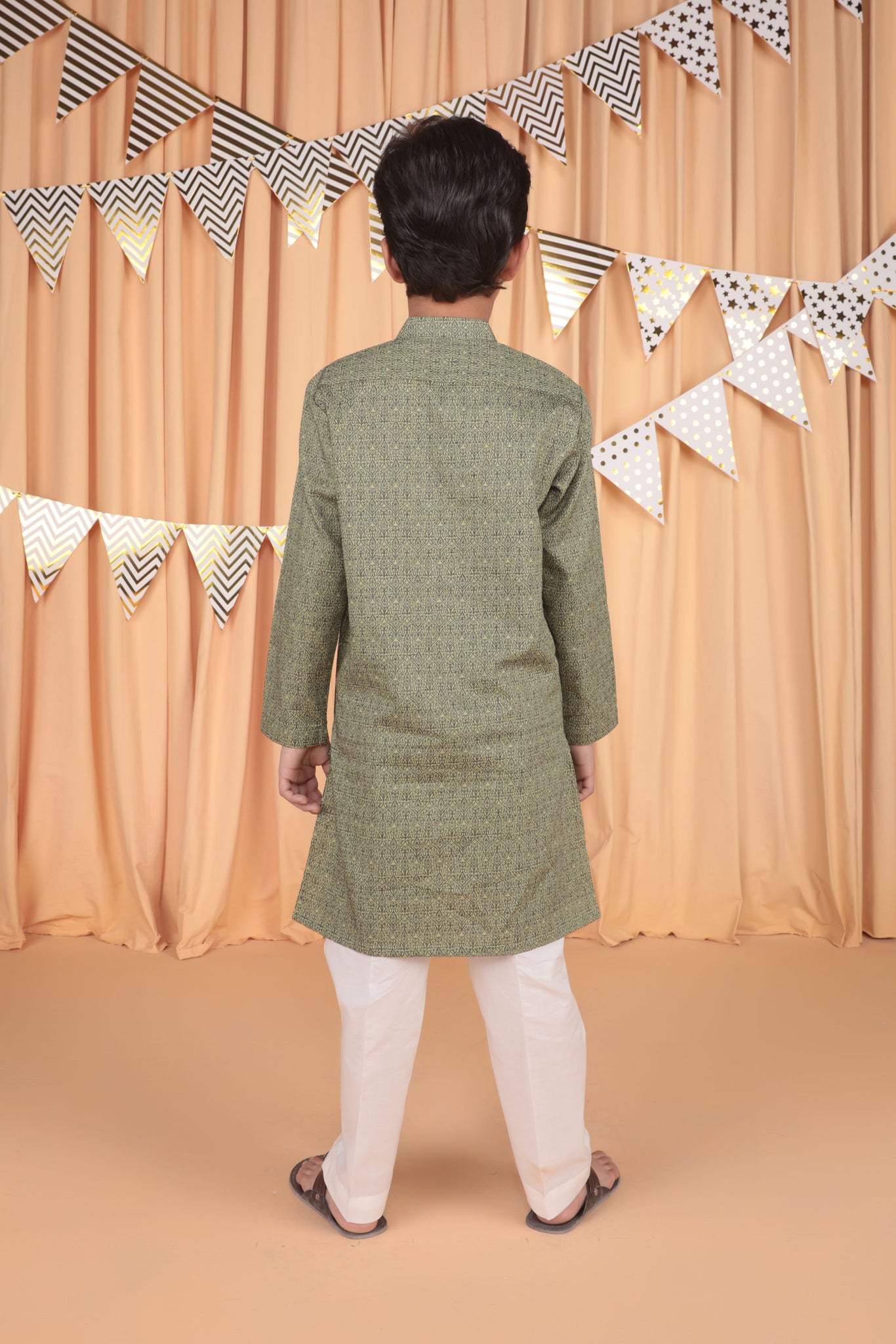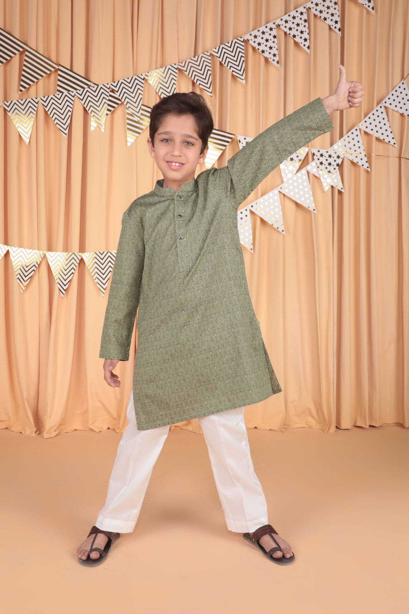 Let your little one stand out from the crowd in this grass green kurta with band collar.