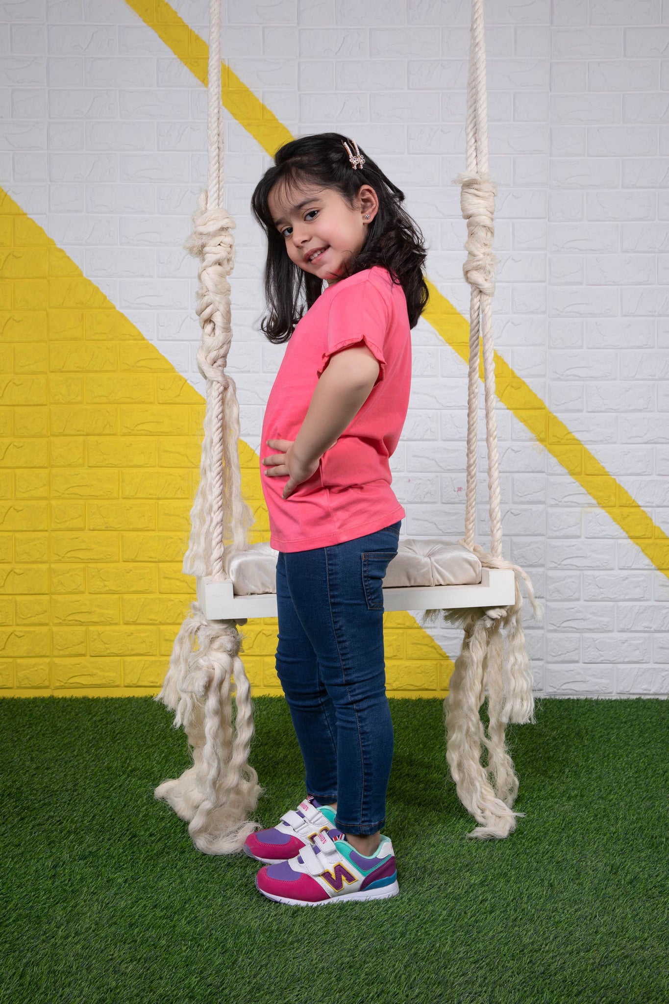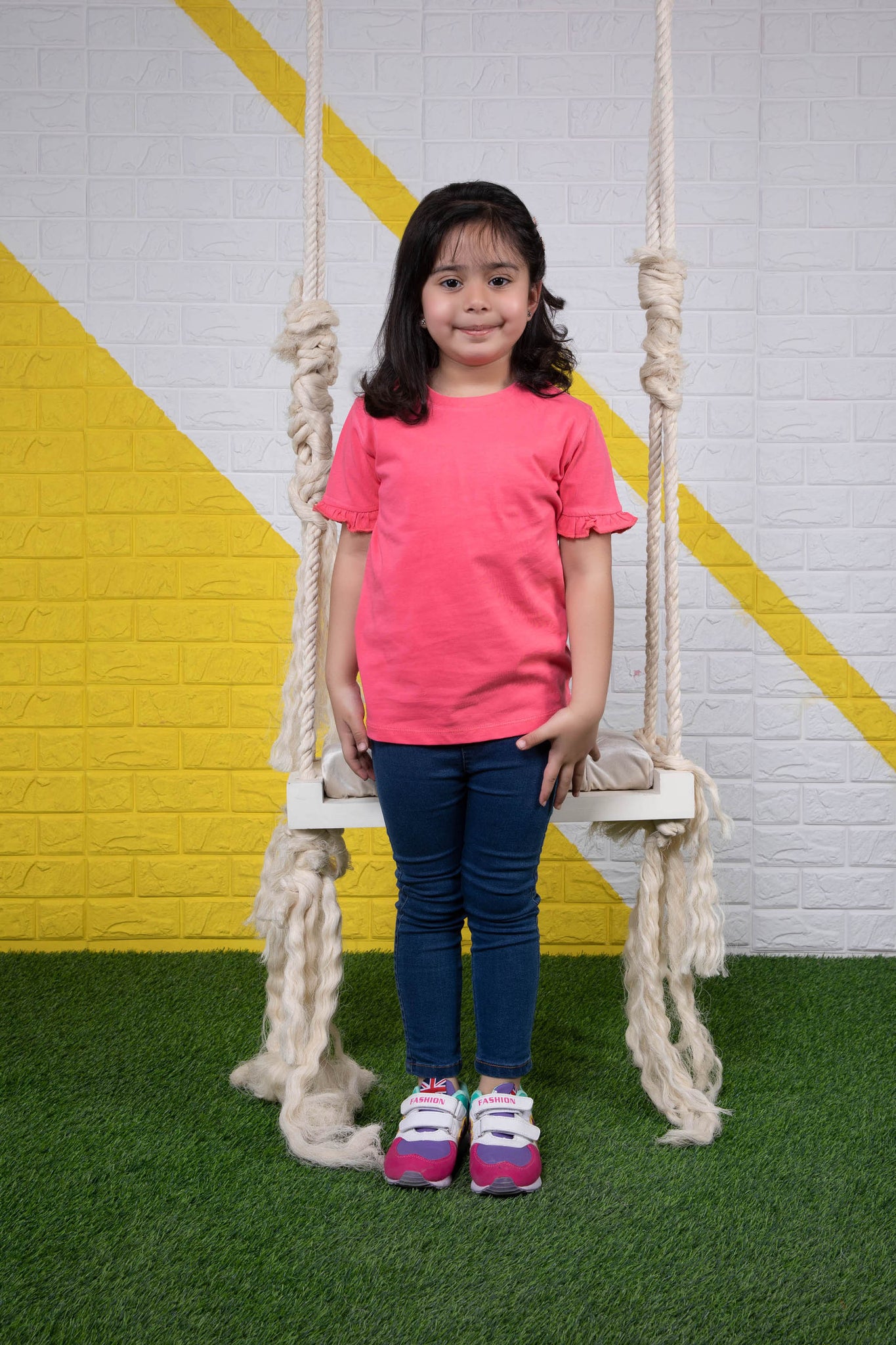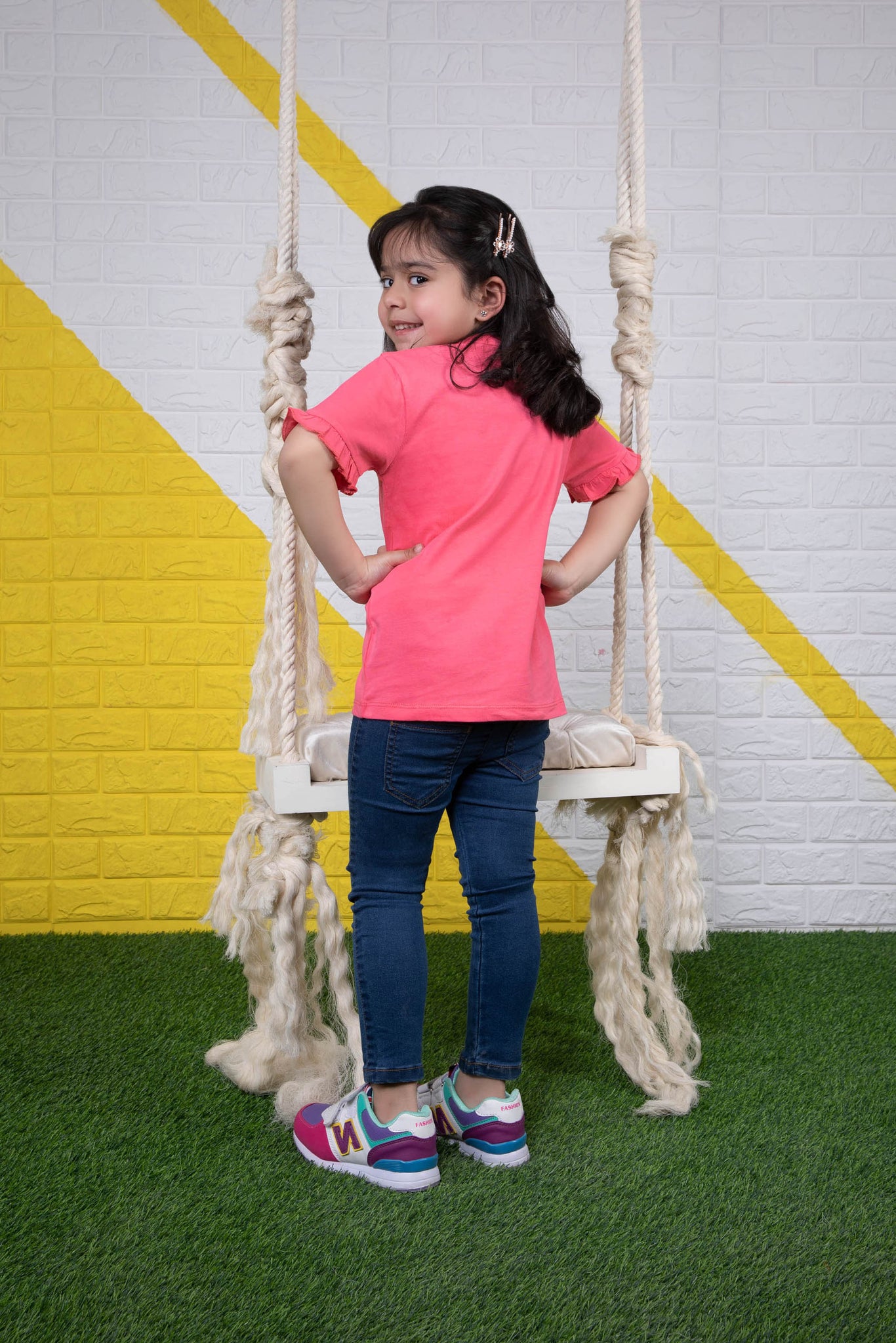 Girls Jersey Round Neck T-Shirt Round neck printed t-shirt with ruffled sleeves.