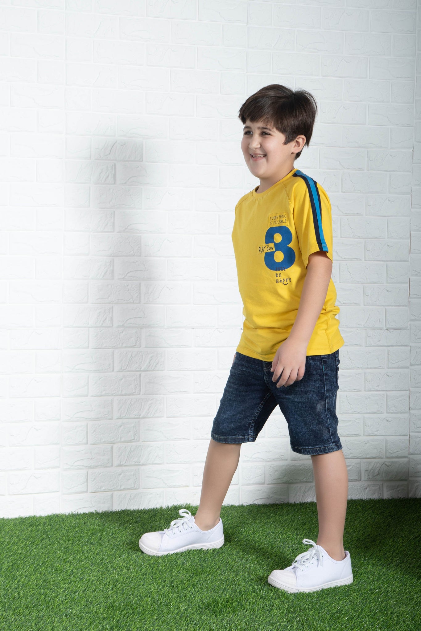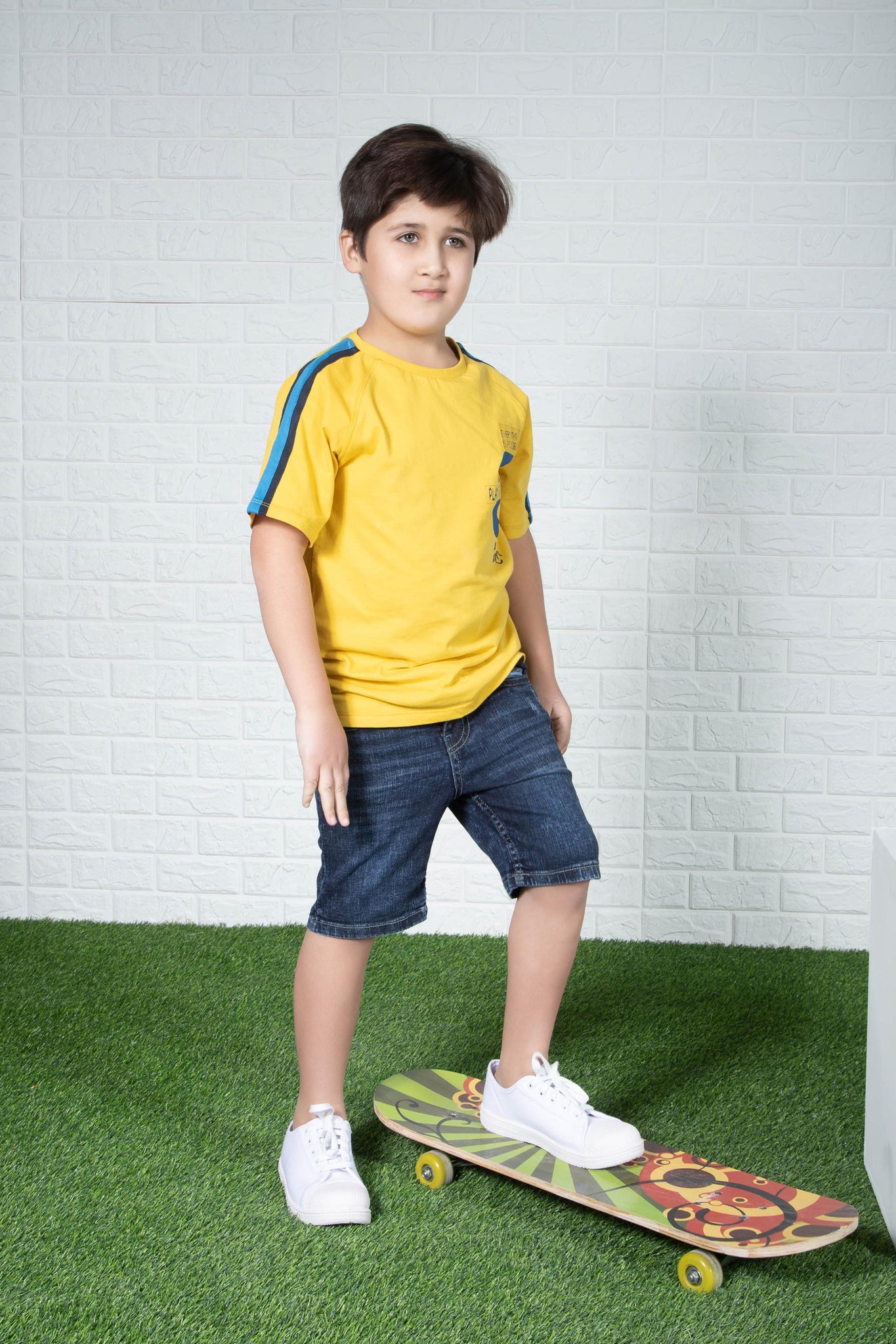 Denim shorts with elastic waistband and adjustable front drawstring, featuring cuffed hem.