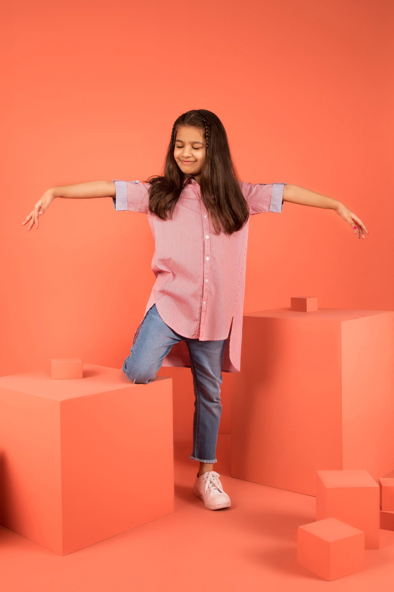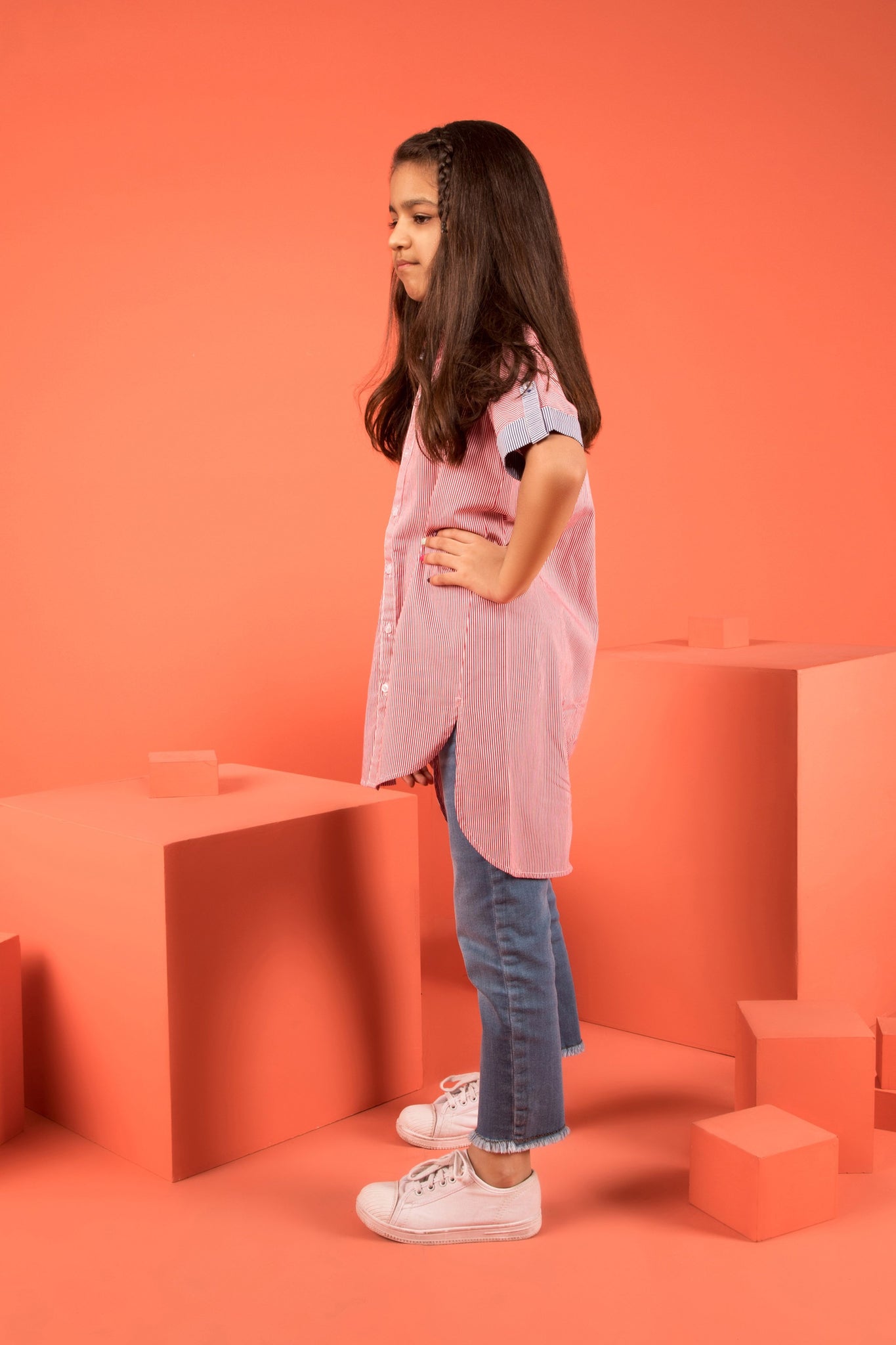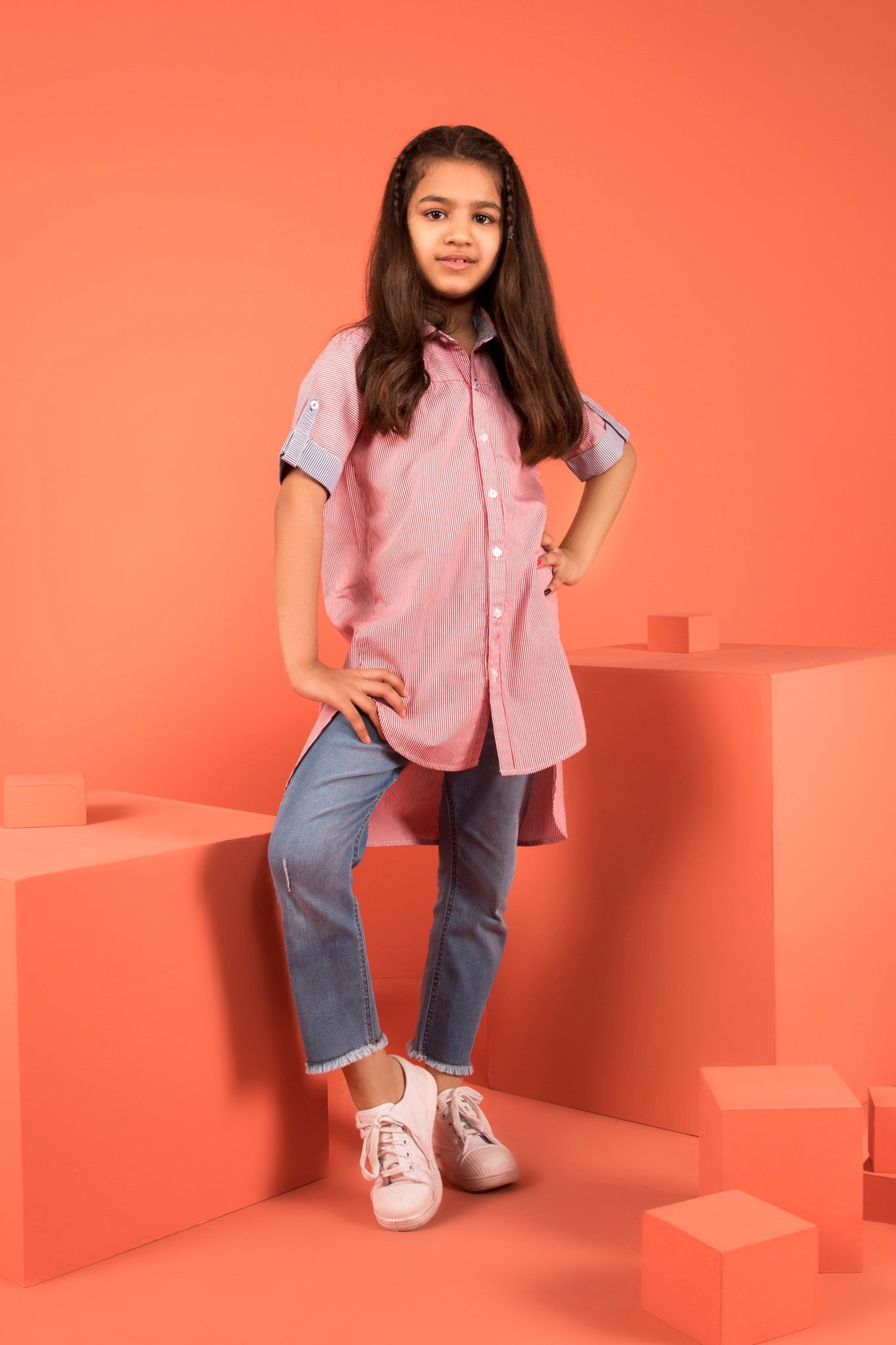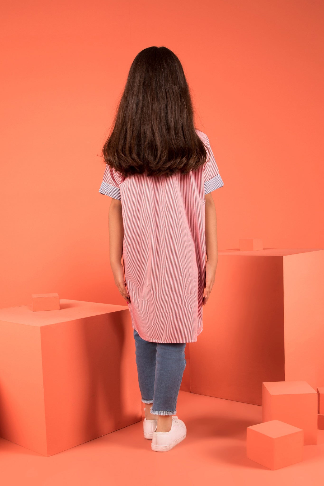 Loose- fit long buttoned-down shirt with short sleeves. Point collar and curved hem with long back.