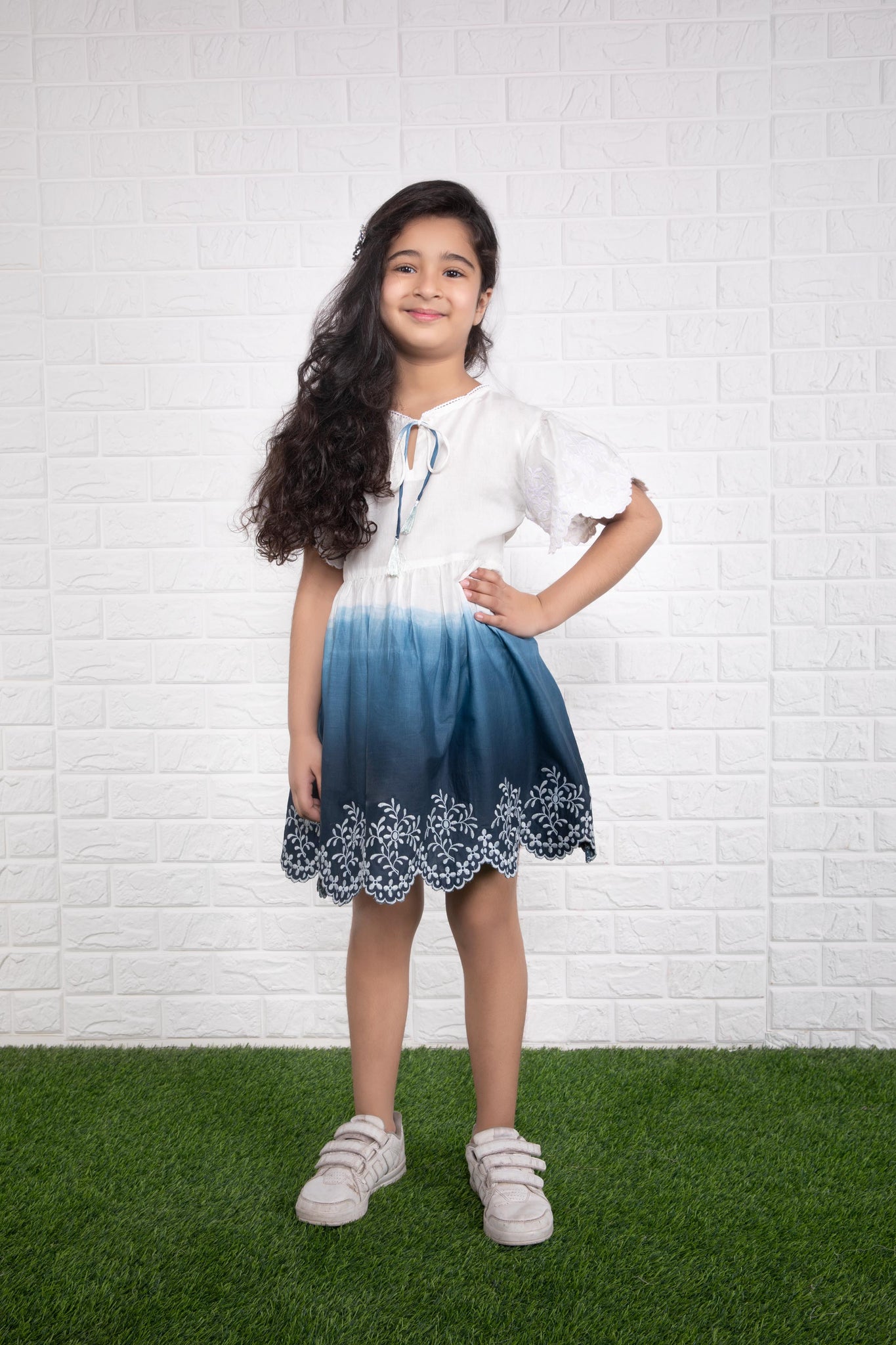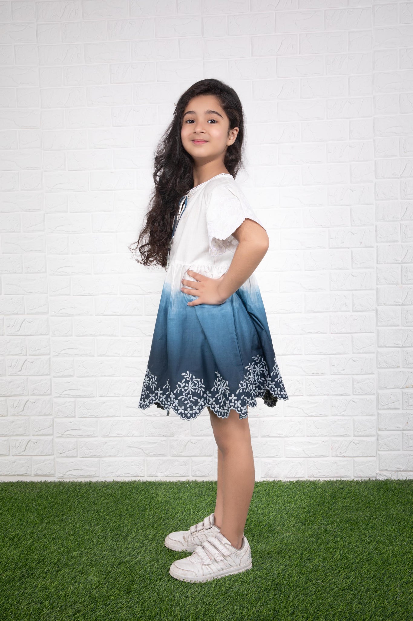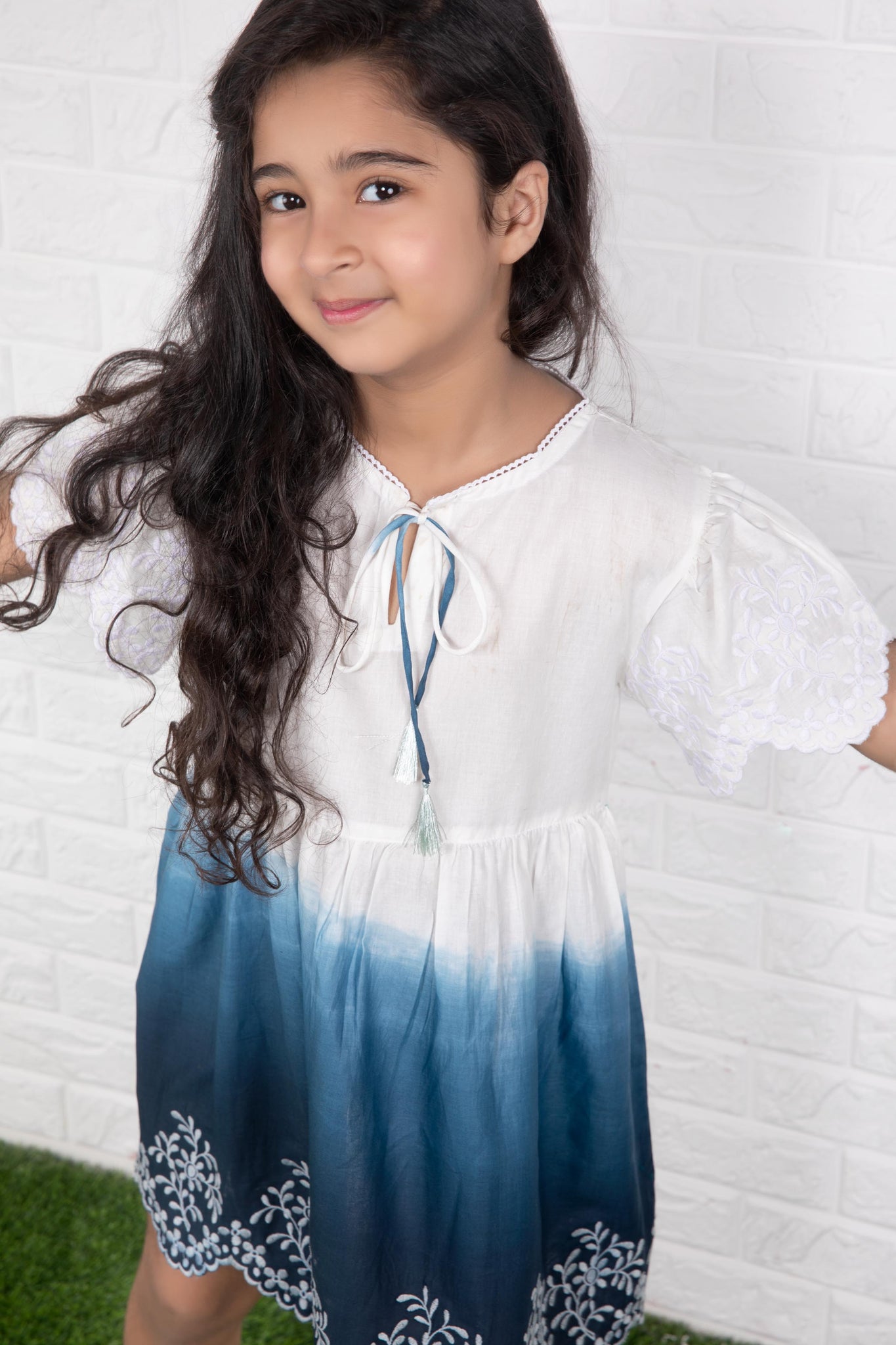 Round neck dress with lacey sleeves. Elastic waistband to accentuate the waist.