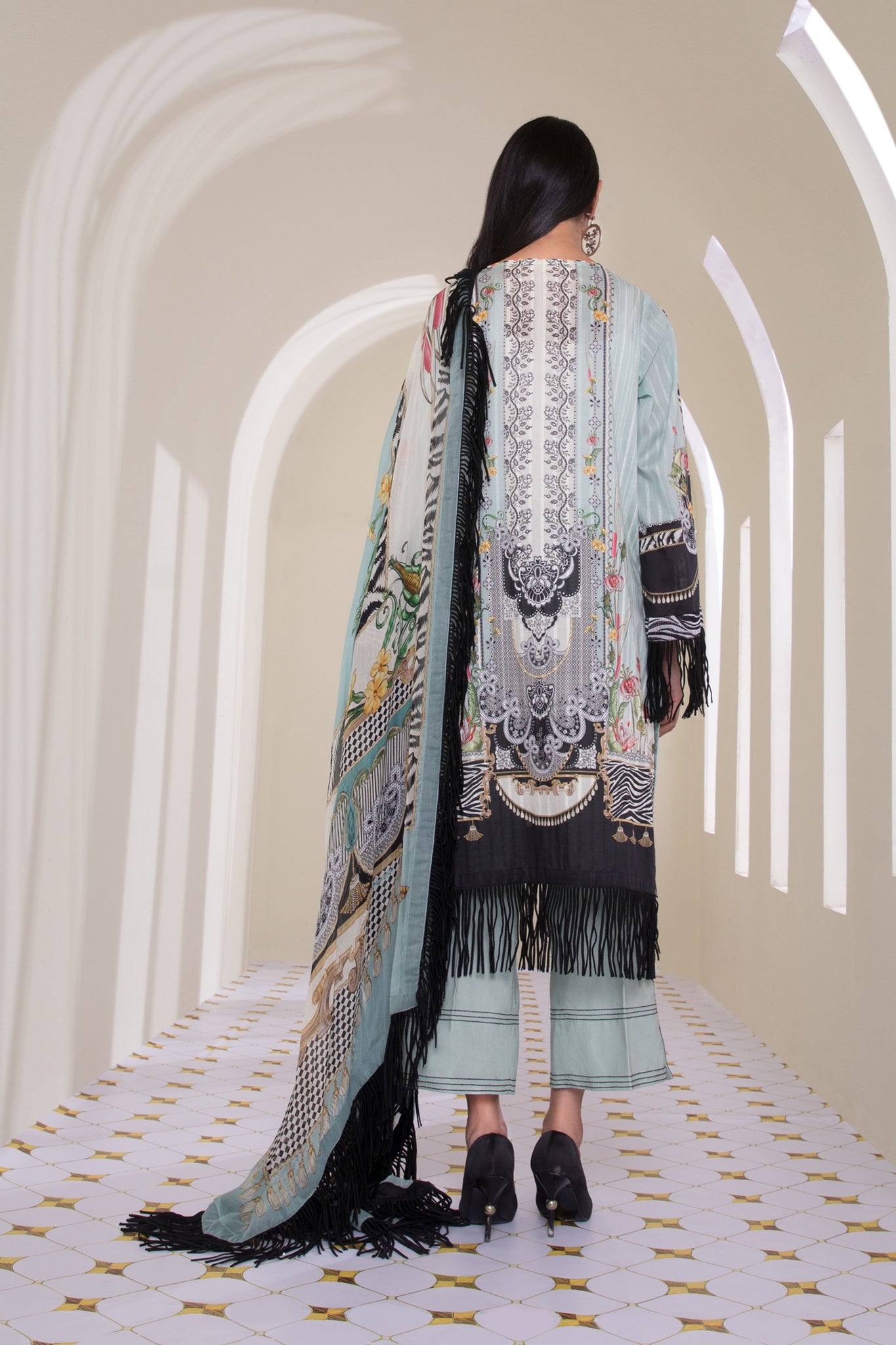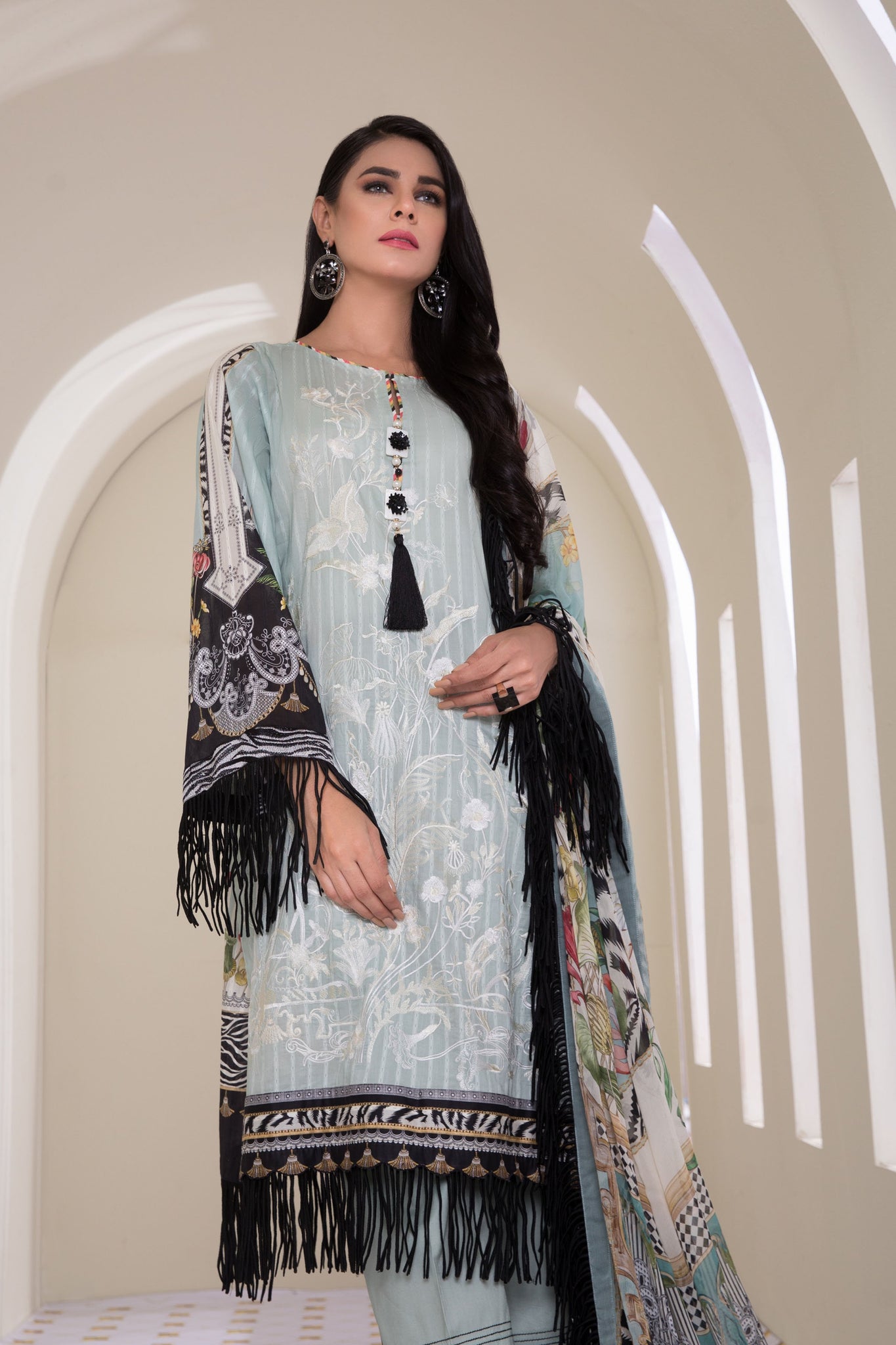 This icy blue ensemble showcases ivory embroidery and to add a hint of black to the look, embroidered pattis are also part of this unstitched three-piece.