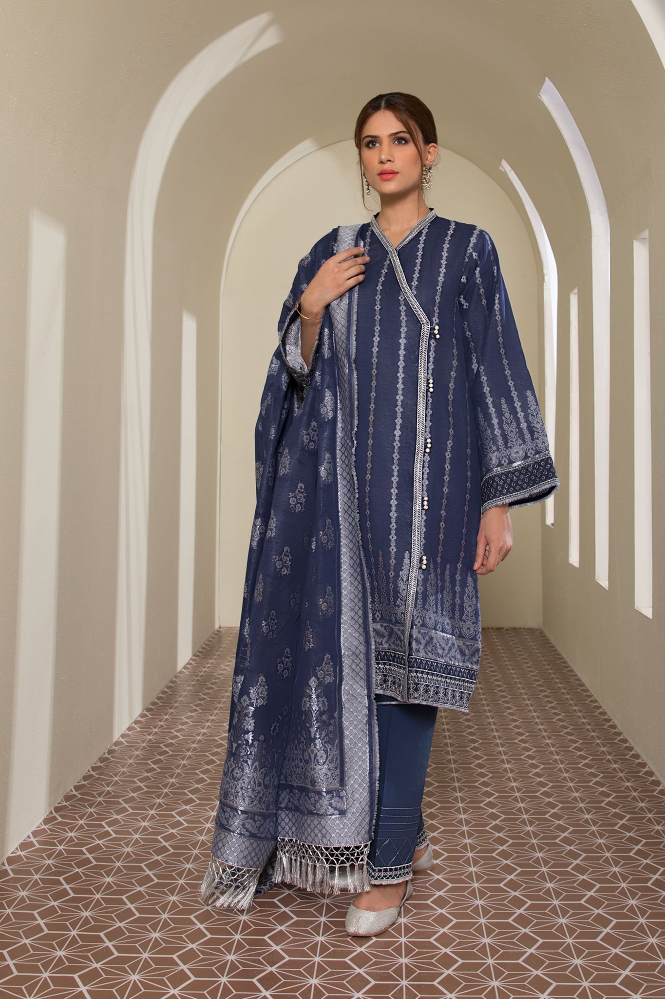 A dreamy blue ensemble, encrusted in fine jacquard material for a traditionally regal appeal.
