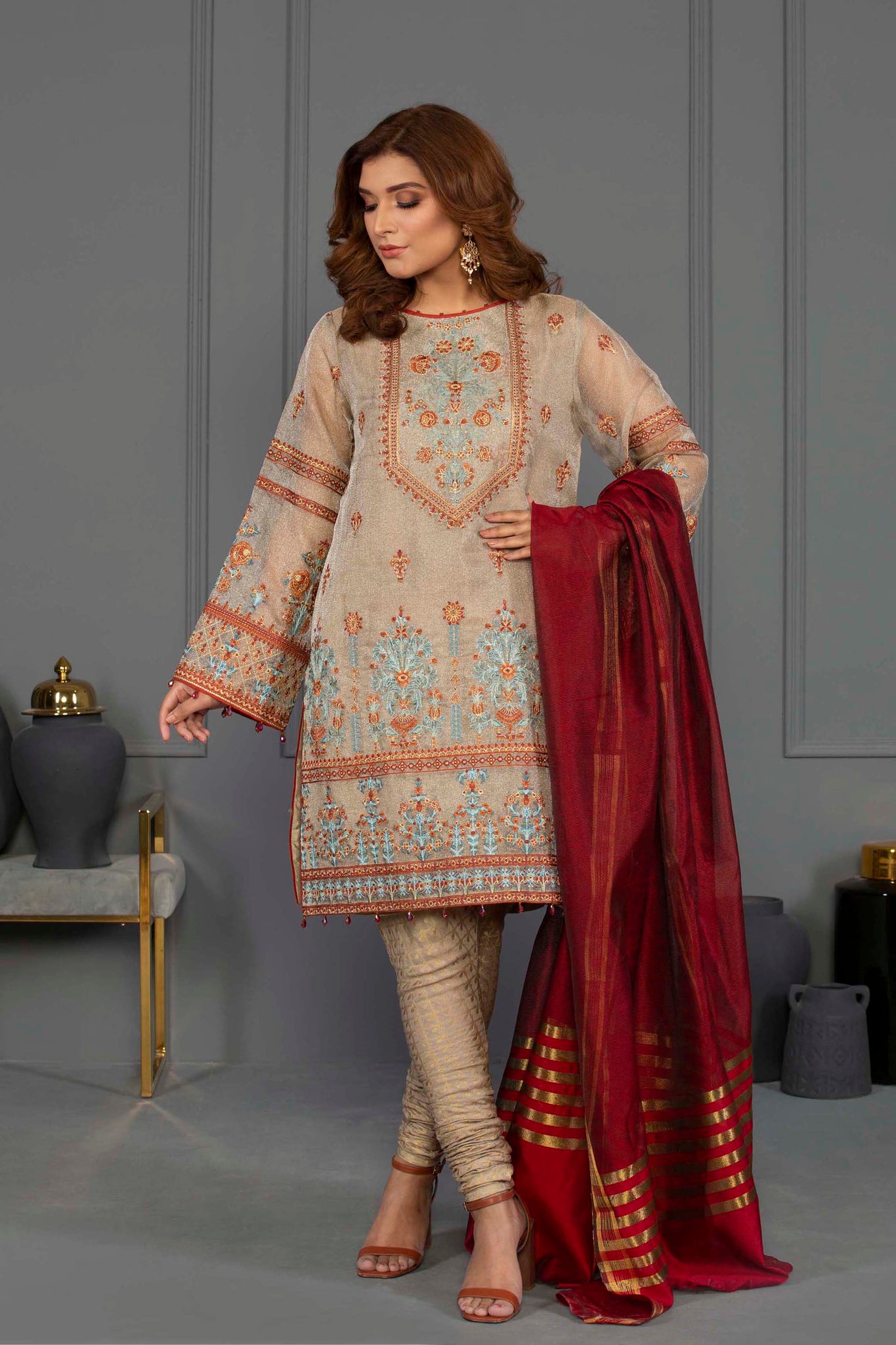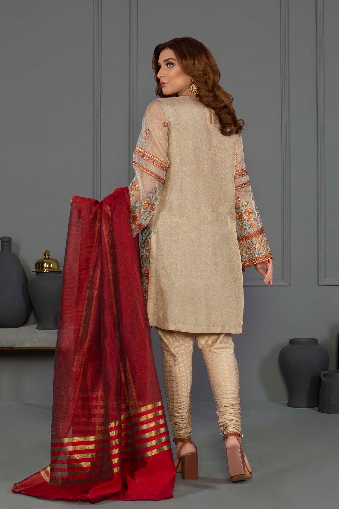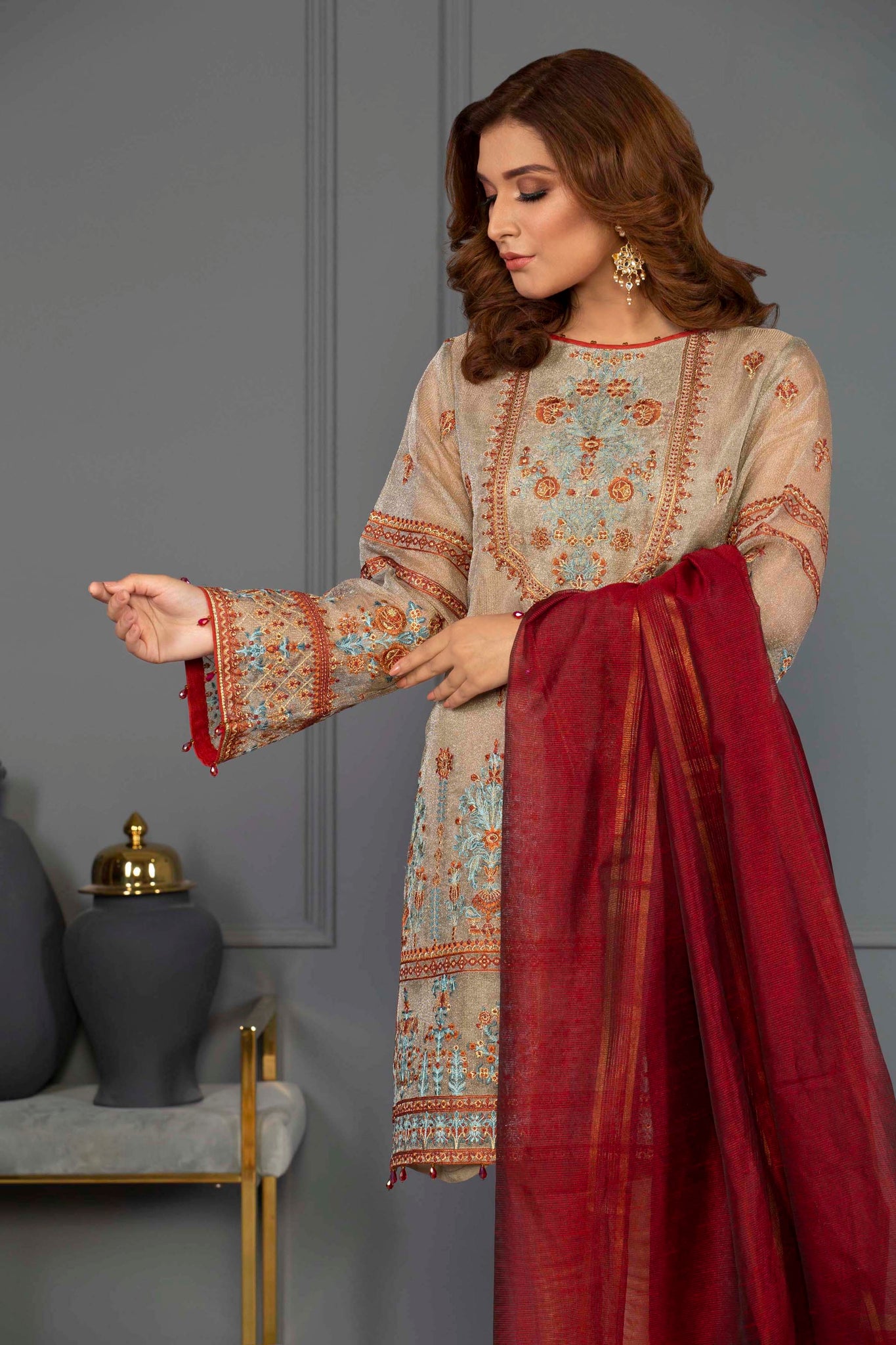 Combining the warmth of red with the delicacy of gold in this alluring unstitched three-piece, the rich, feminine hue is chic to wear both day and night.