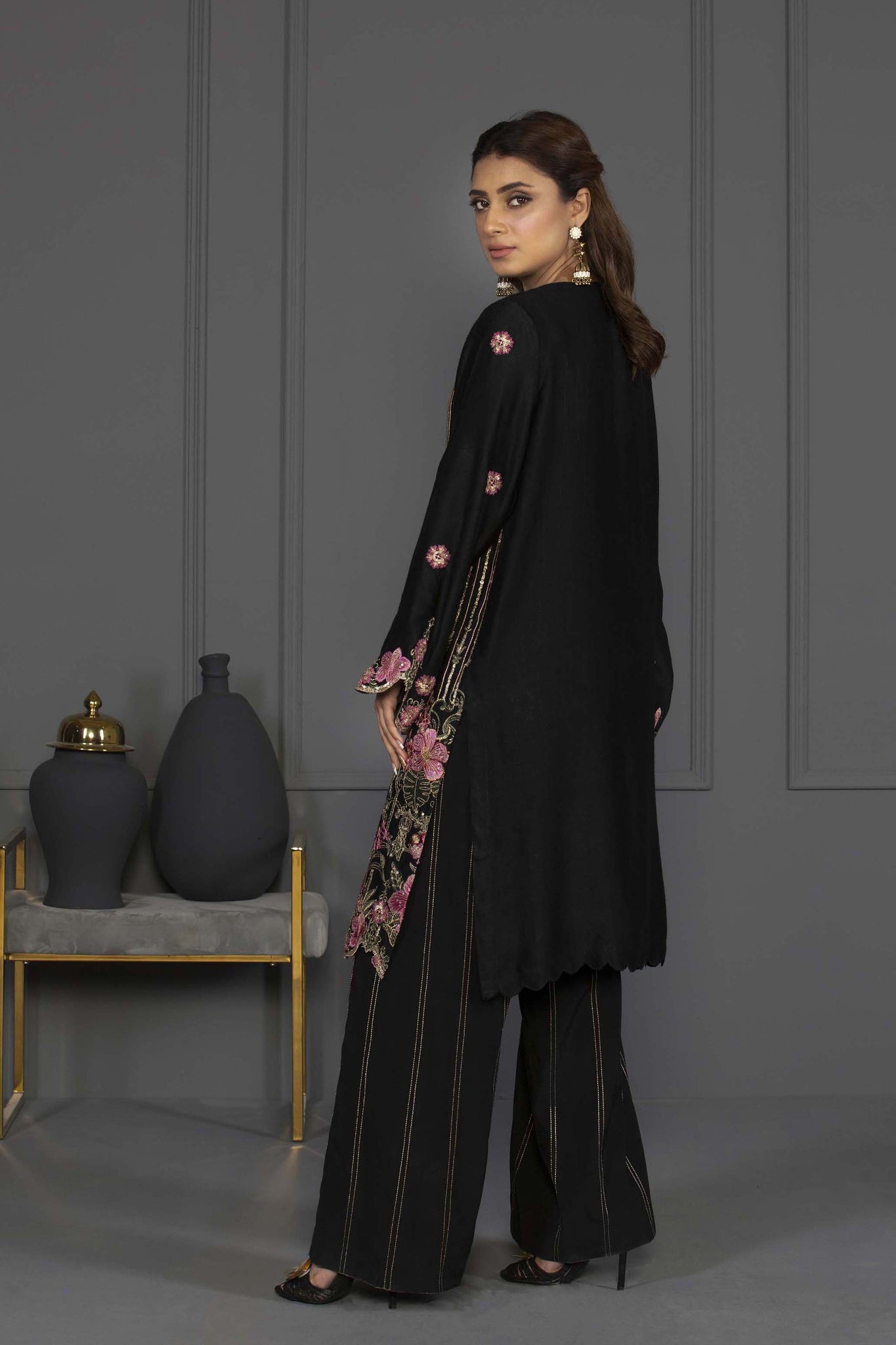 Dark hued, monochromatic touches with subtle shades of pink and the glimmering effect makes this ensemble an outstanding piece.