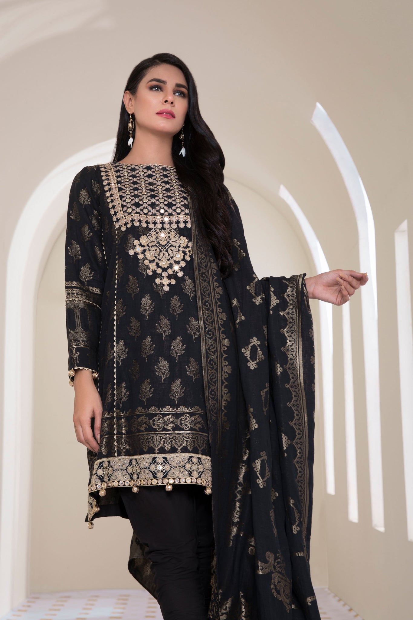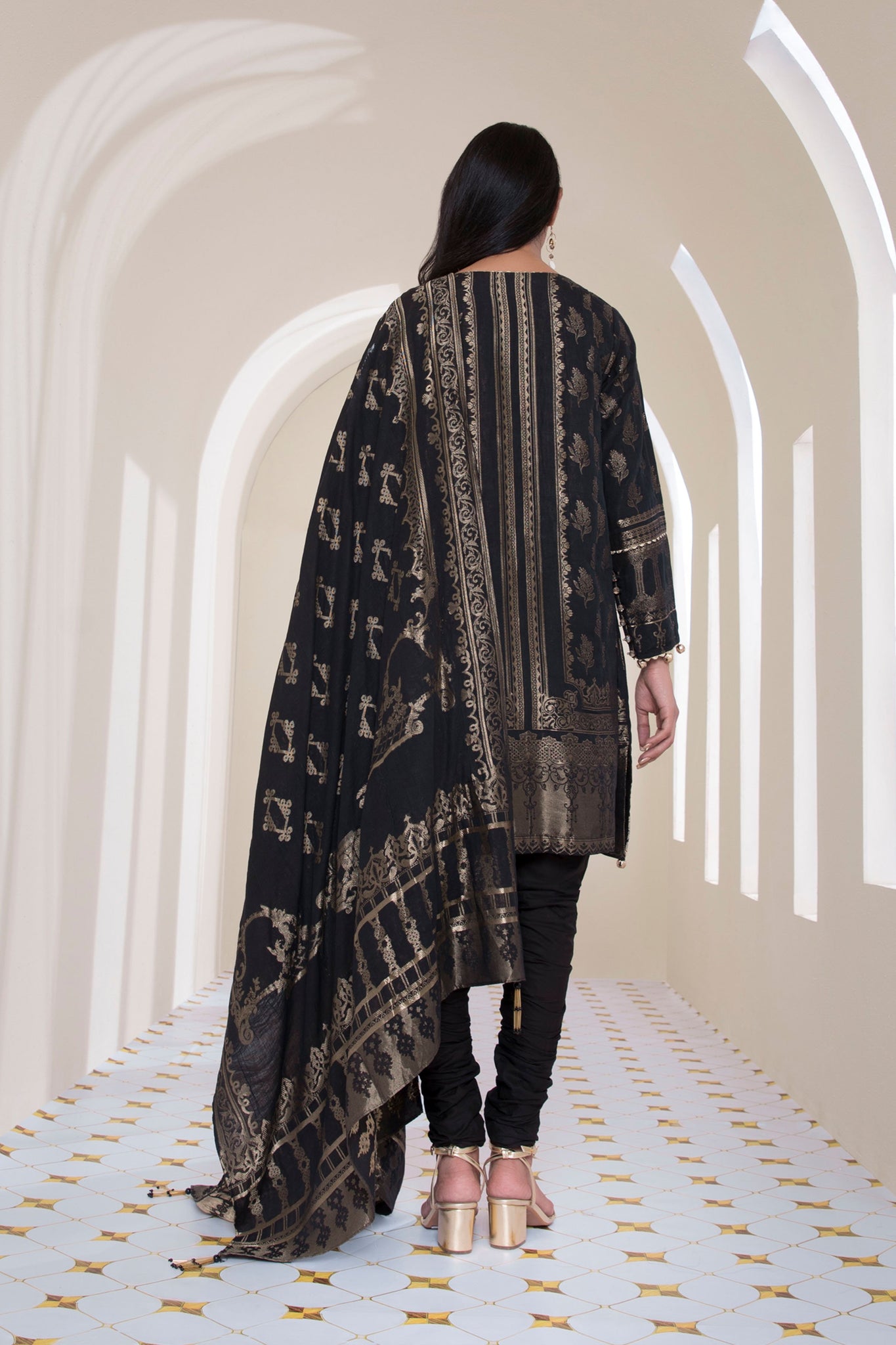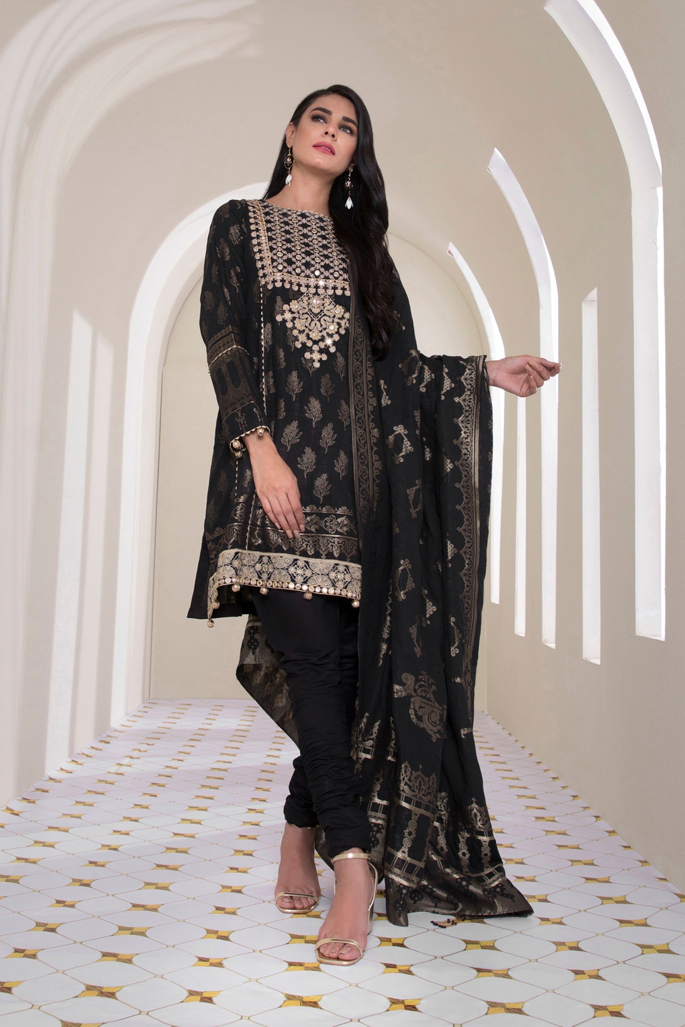 This ivory and black look is a celebration of sophisticated style. The three piece ensemble consists of an embroidered jacquard shirt, a glossy jacquard dupatta and dyed cotton trousers.