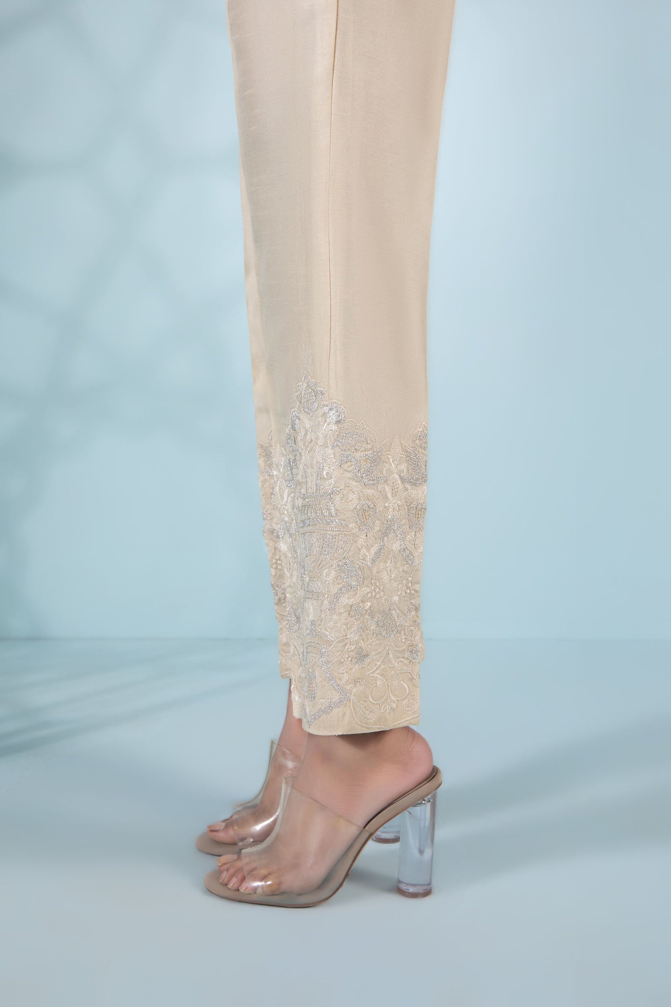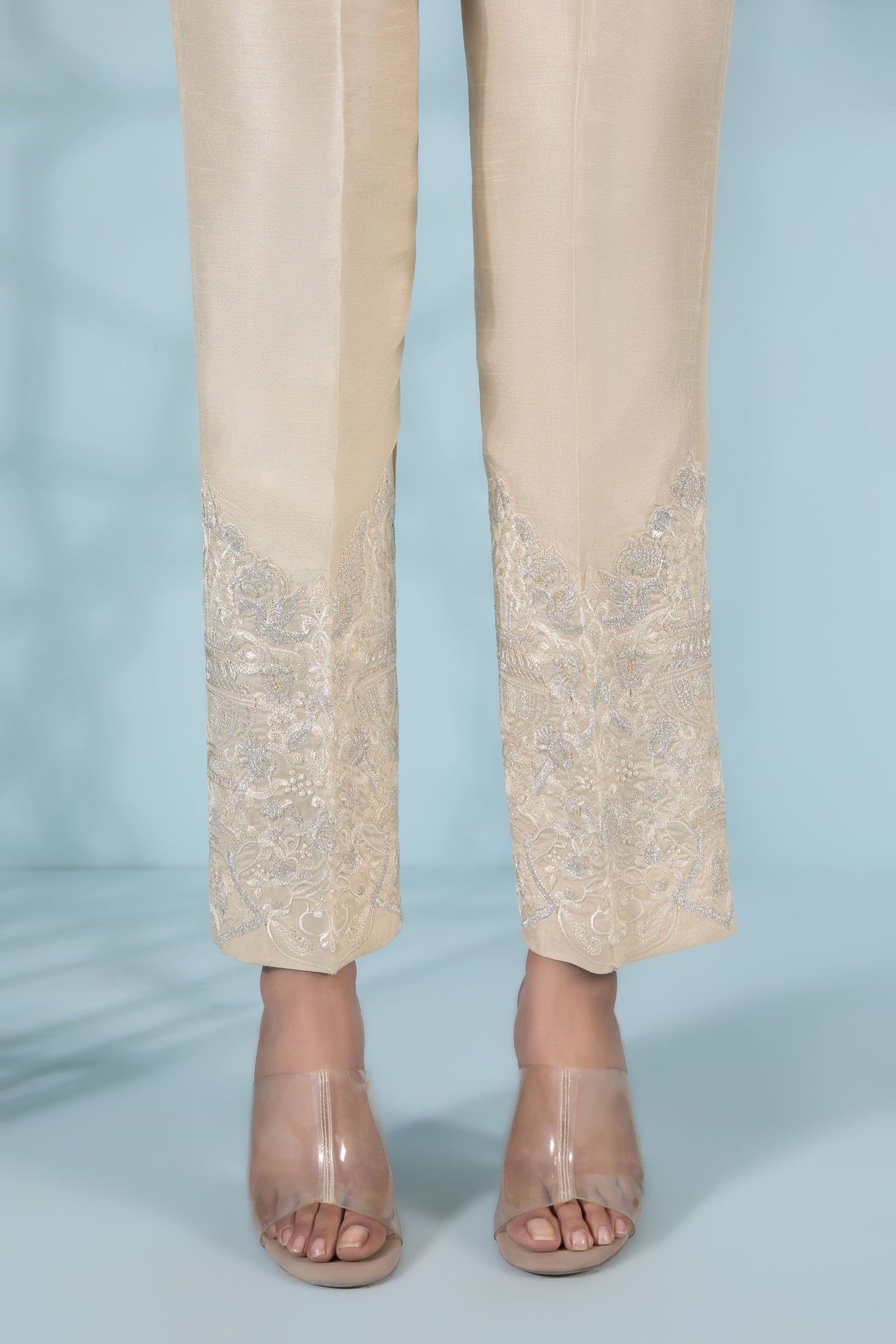 Raw silk cigarette trousers in a cream hue with dazzling silver embroidery along the hem.
