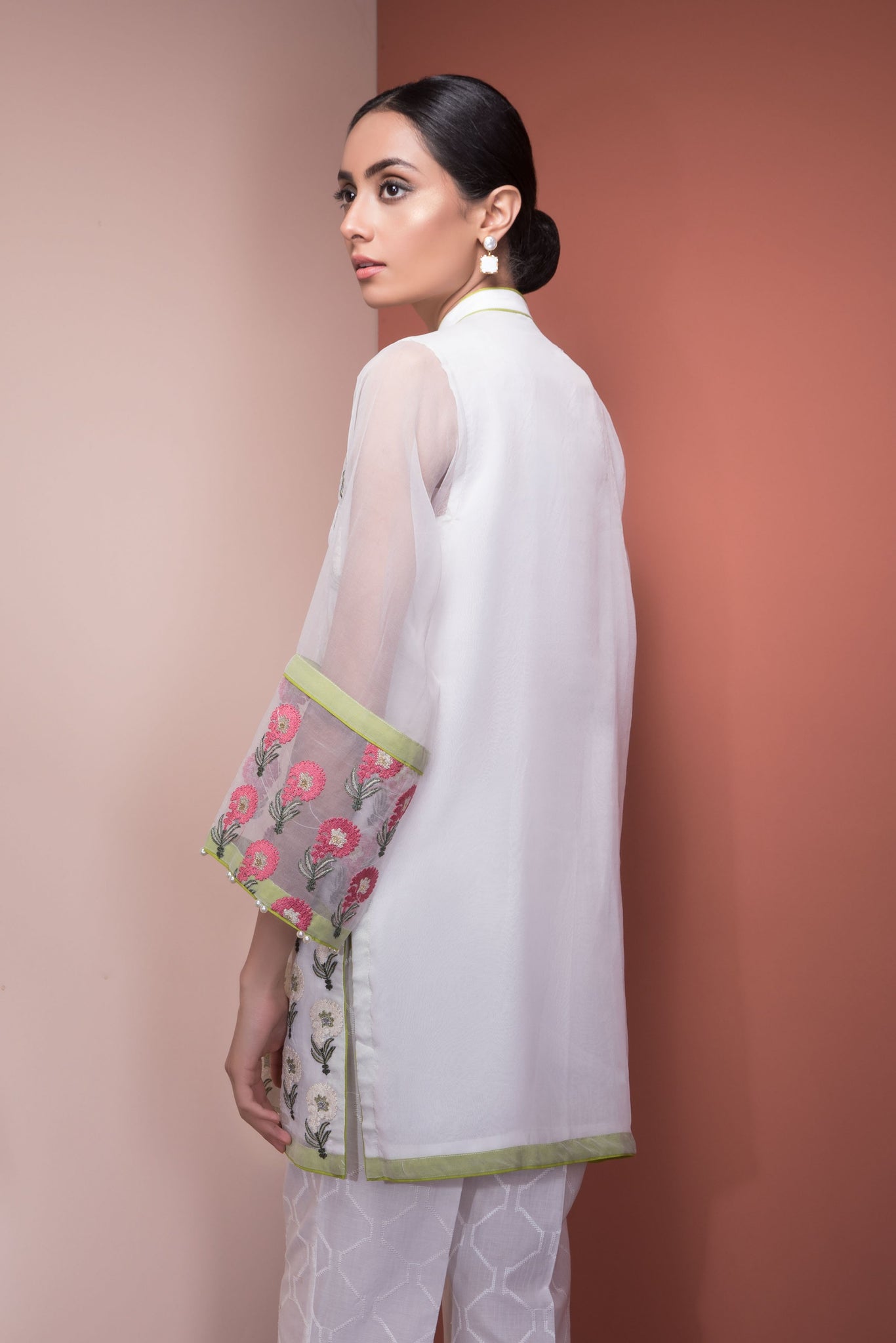 Embroidered Front, Plain Back, Full Sleeves With Embroidery, Ban Neckline With Placket