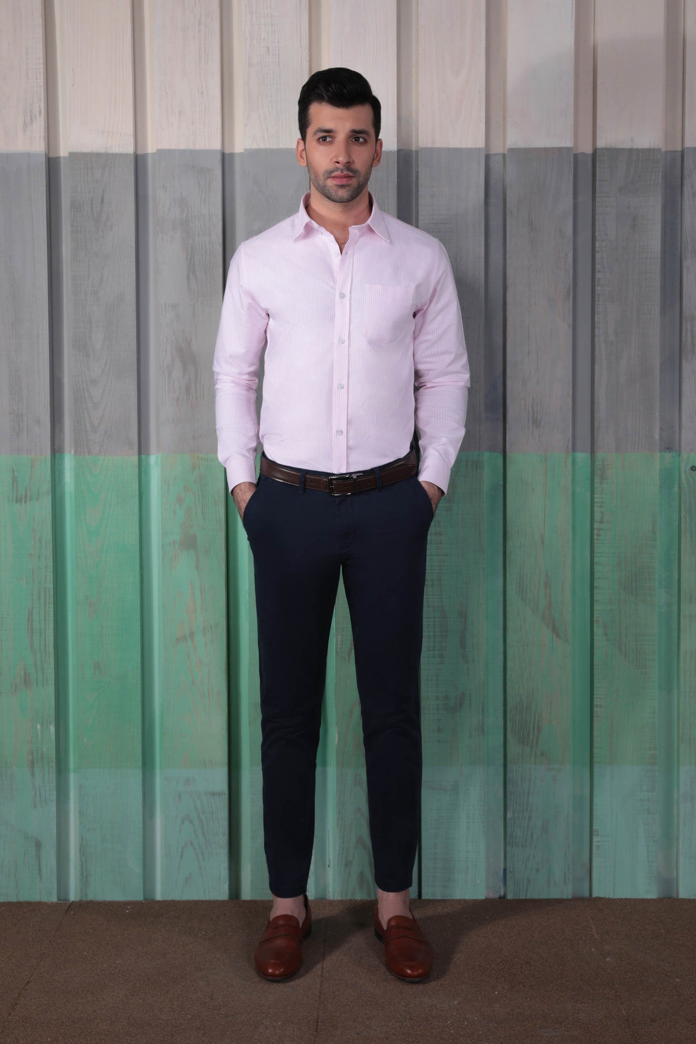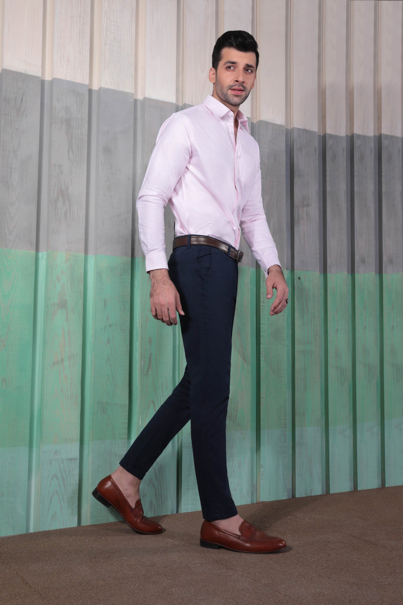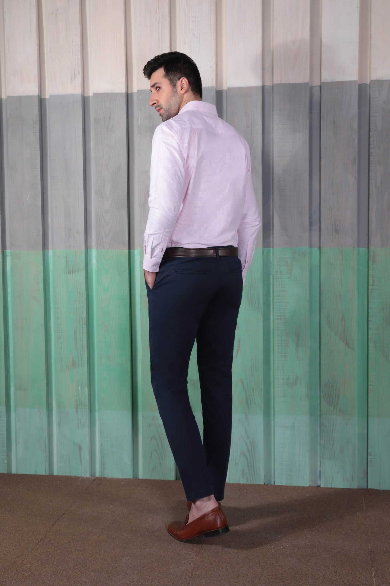 Slim Fit Chinos Slim fit navy trousers in a sumptuous satin finish.