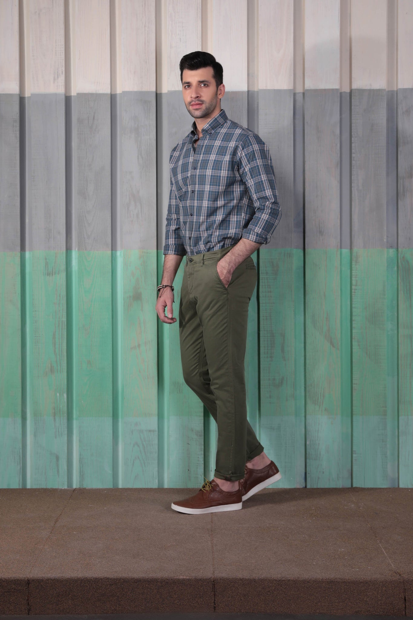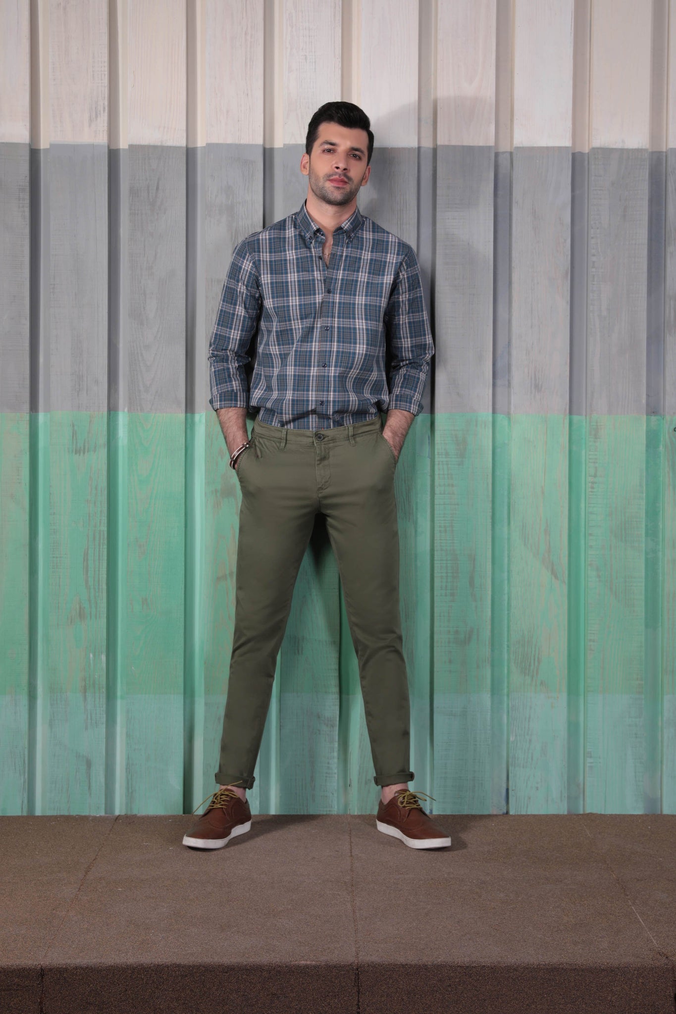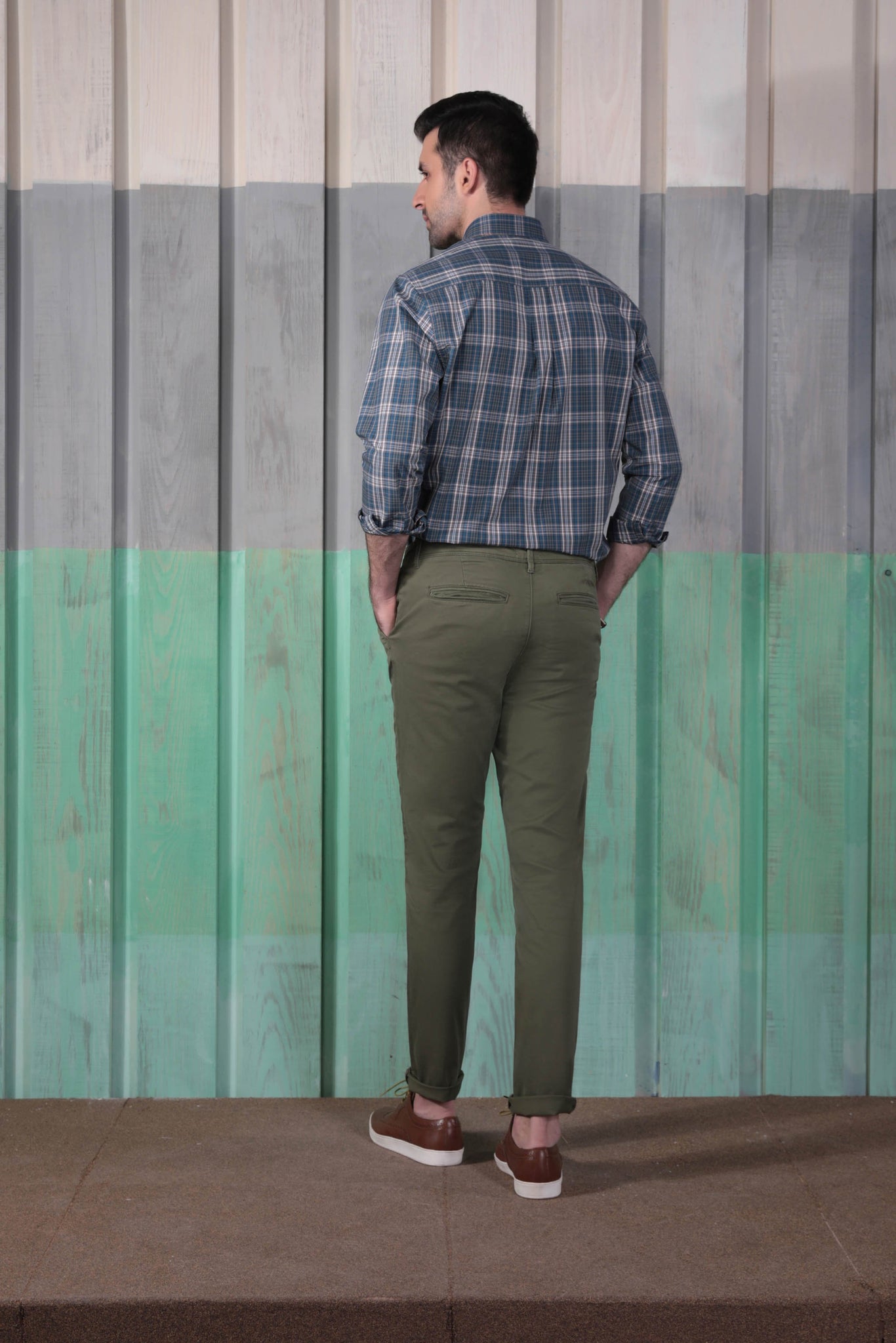 A rich olive green hued satin and a stylish slim fit make these trousers a must-have piece.