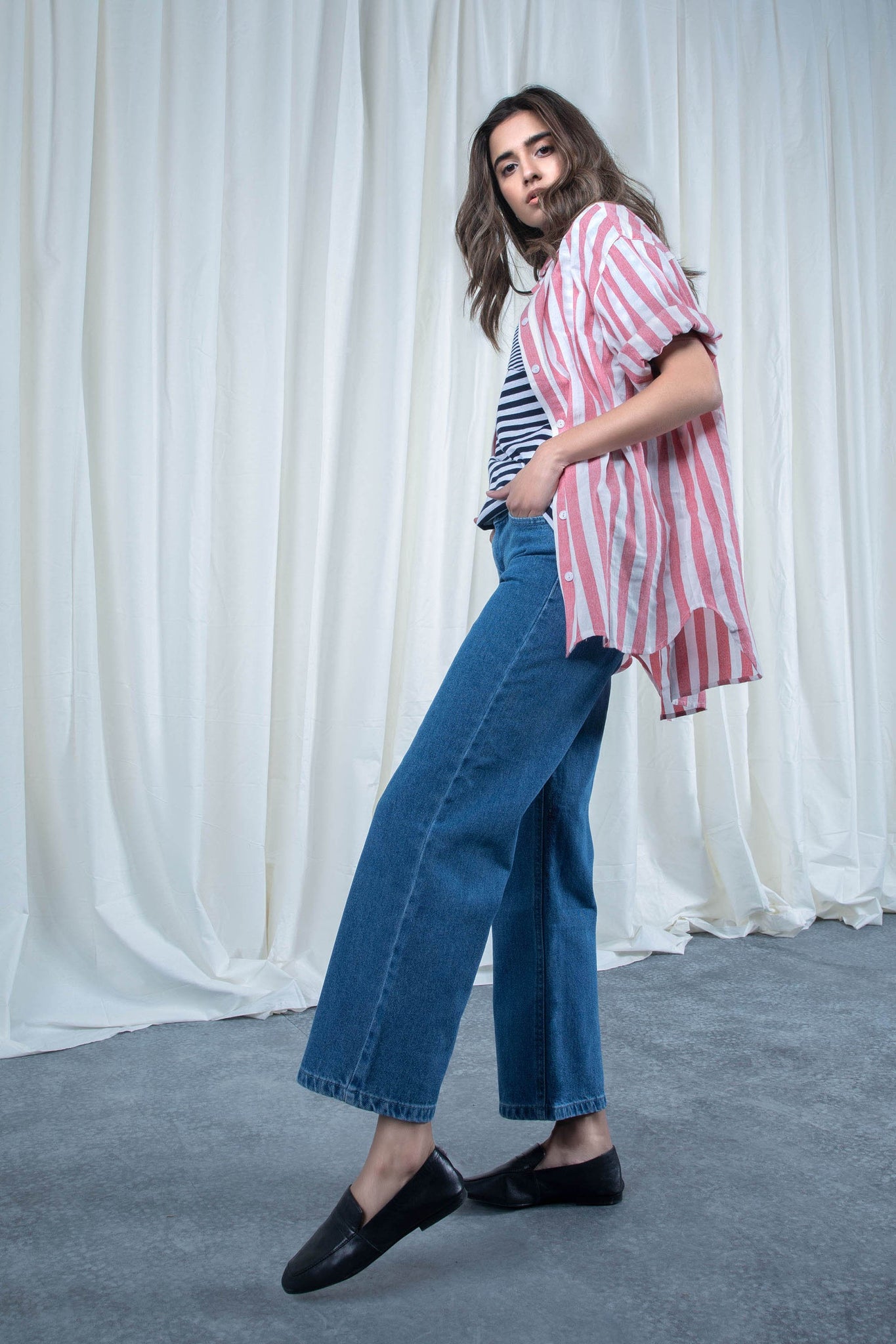 High-waisted culotte jeans with four pockets. Wide leg. Front zip. Button closure.