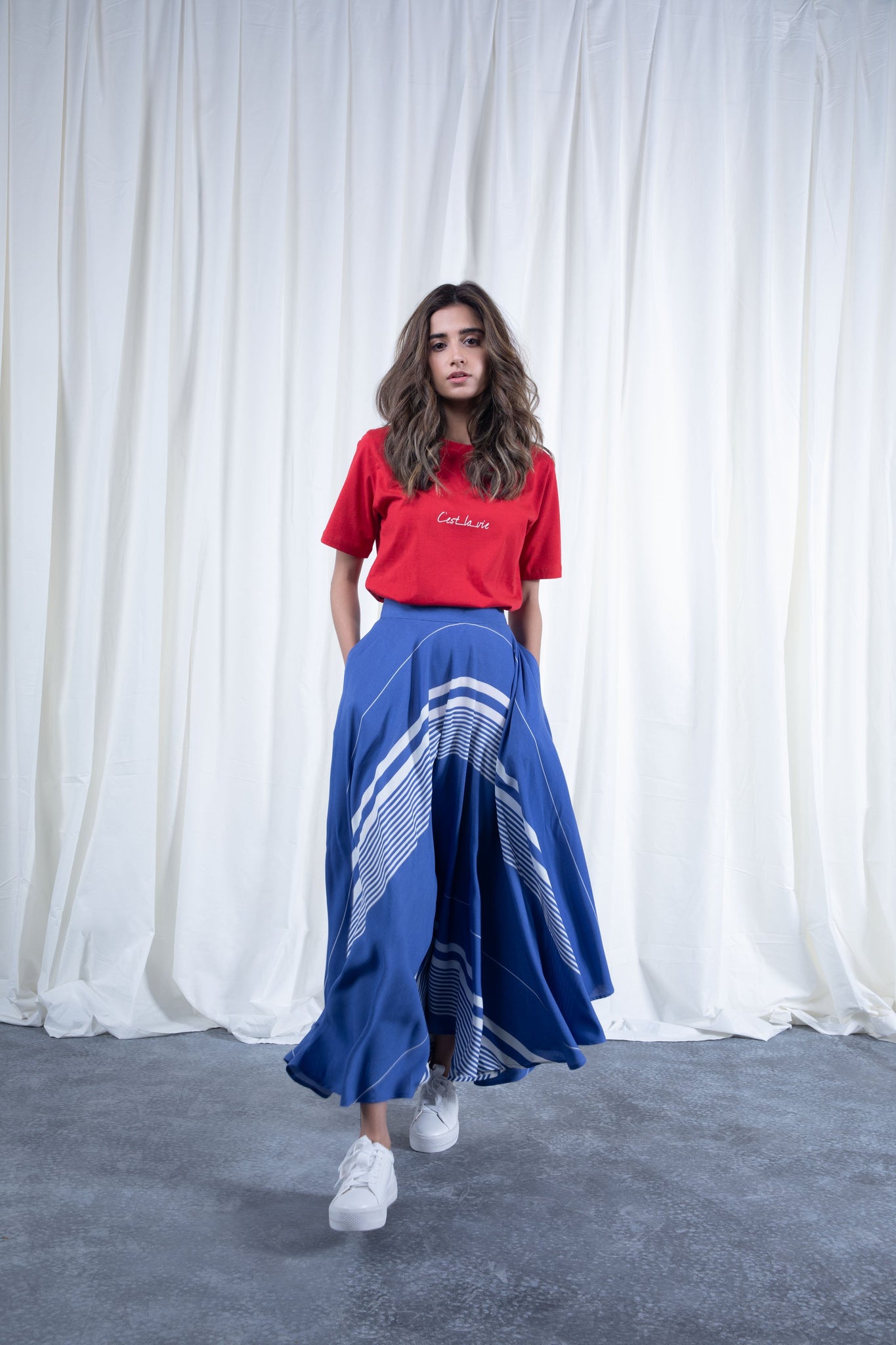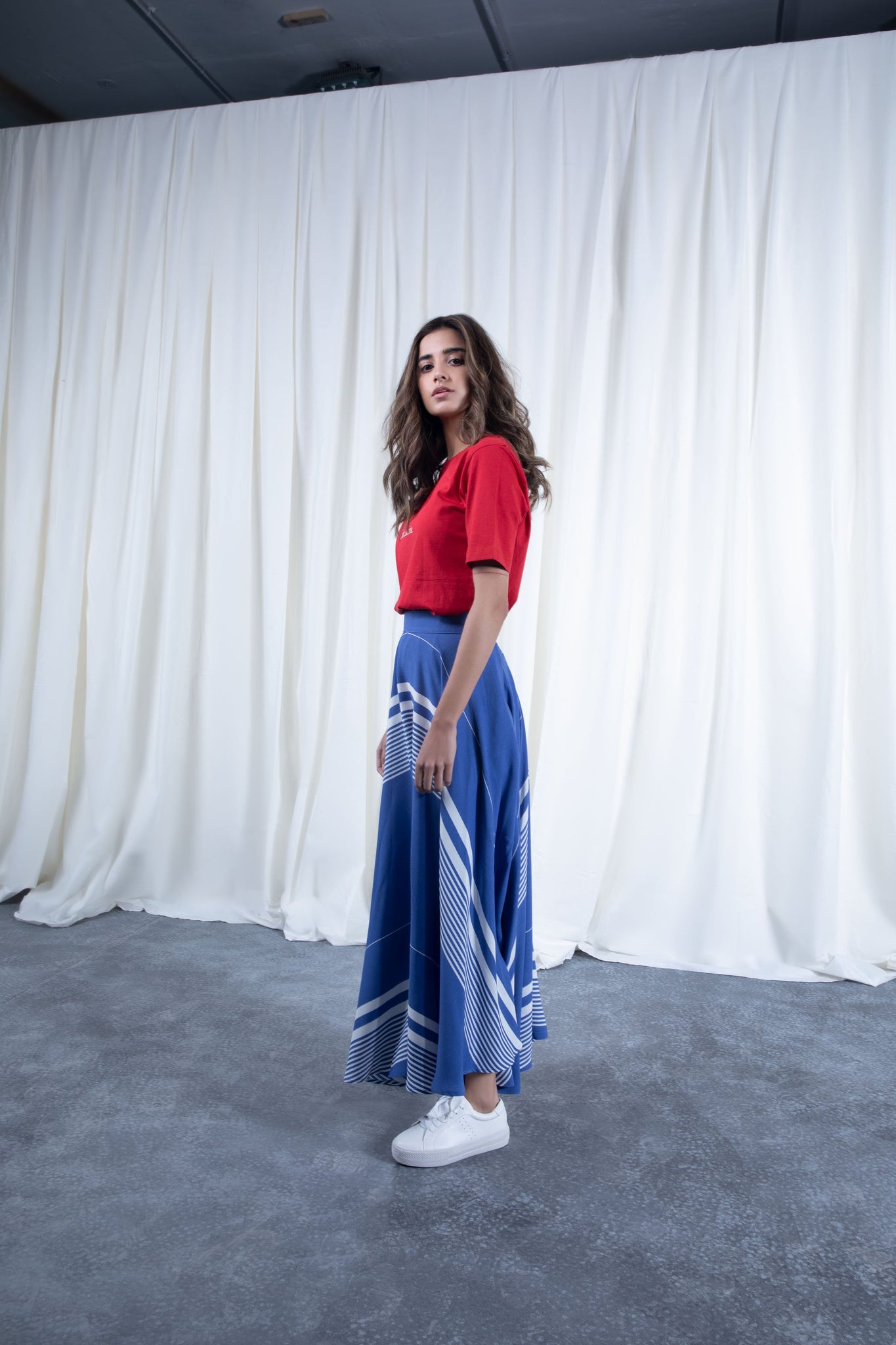 Sapphire's midi skirt features sharp pleats from the top to the hem of its A-line silhouette, plus a pull on waistband for an effortless attire.