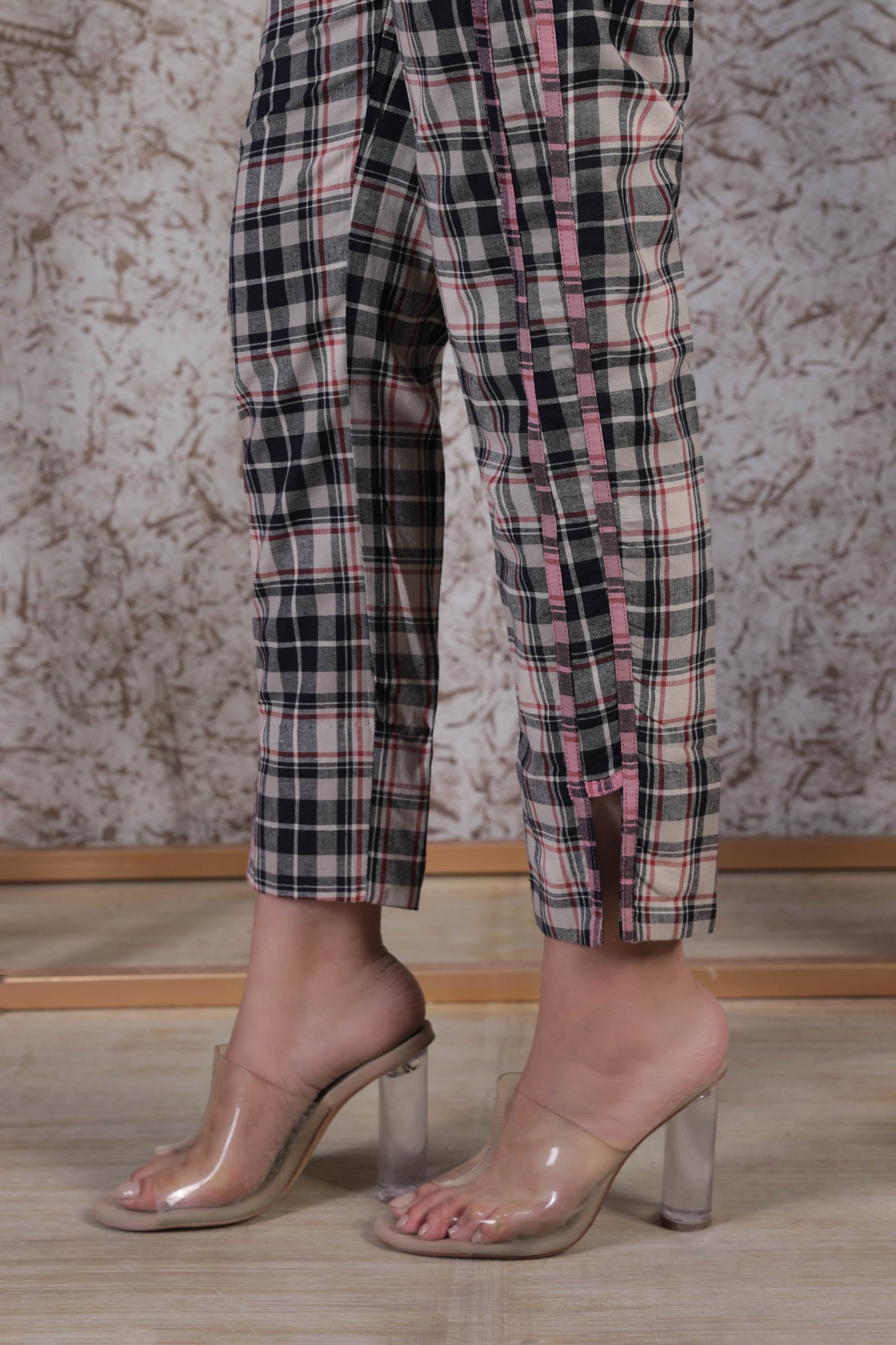 These multi coloured chequered cotton pants come in yarn dyed fabric and a cigarette cut.