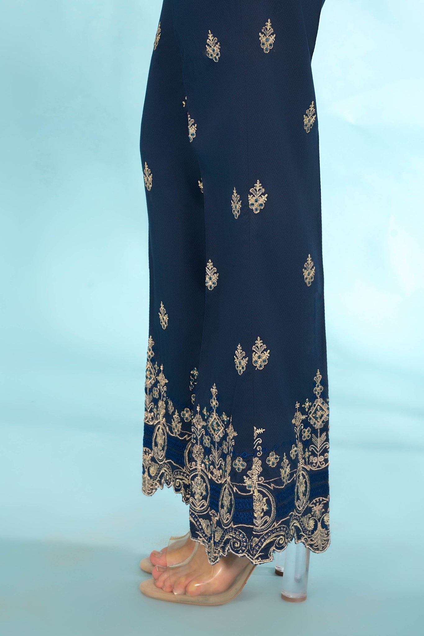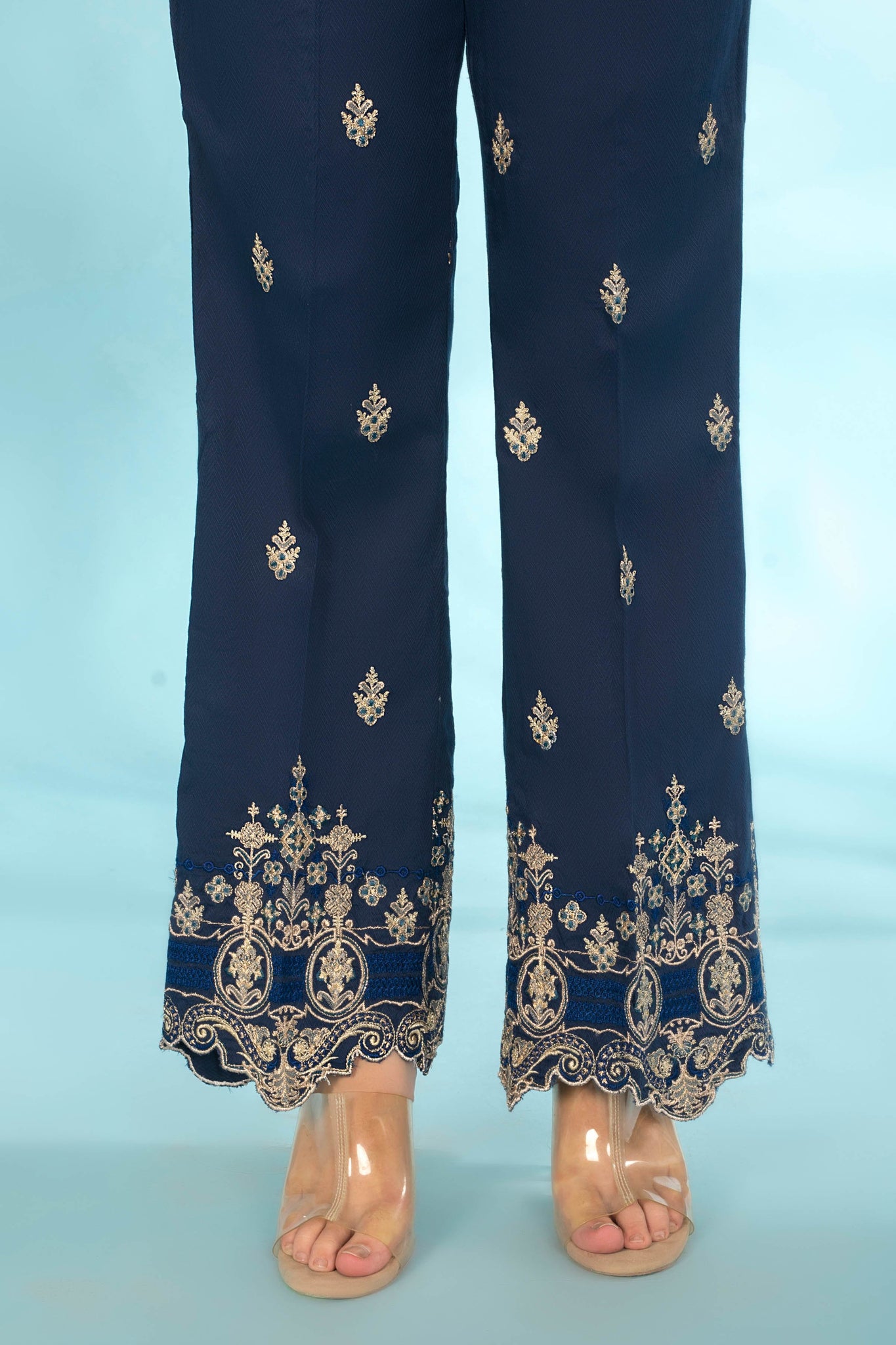 Cotton boot-cut pants in the hue of blue with exquisite embroidery detailing at the hem.