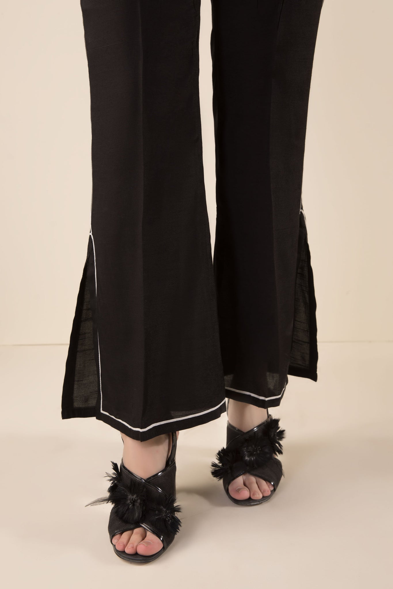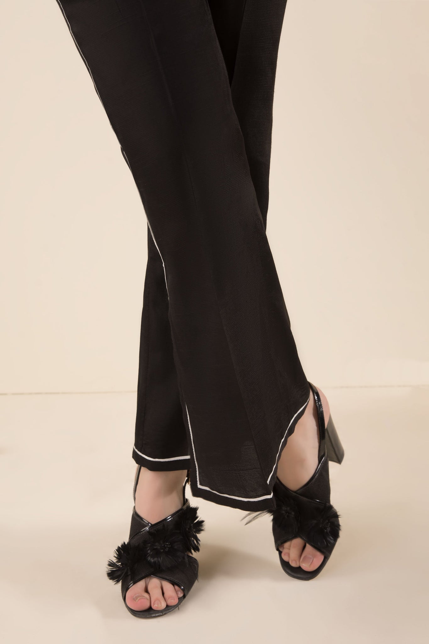 Black boot cut trousers in raw silk with graphic contrasting piping.