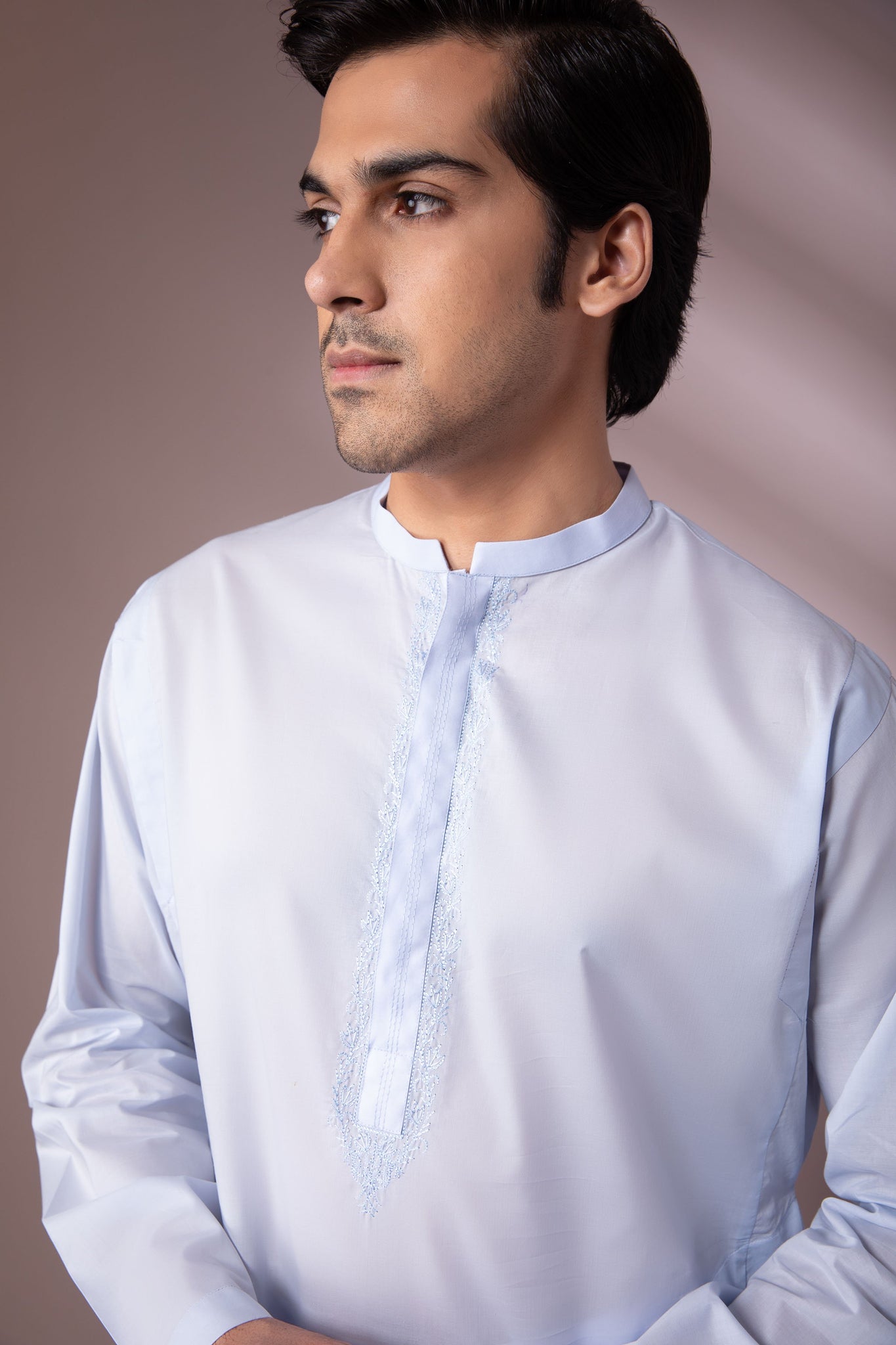 Embroidered Front, Plain Back, Full Sleeves, Band Neck