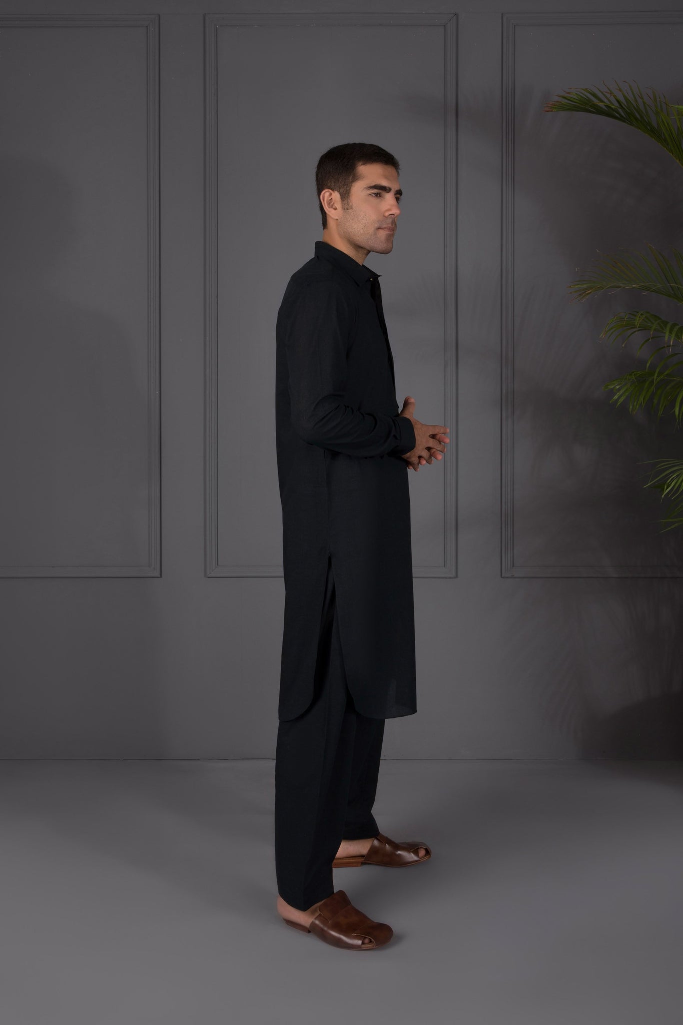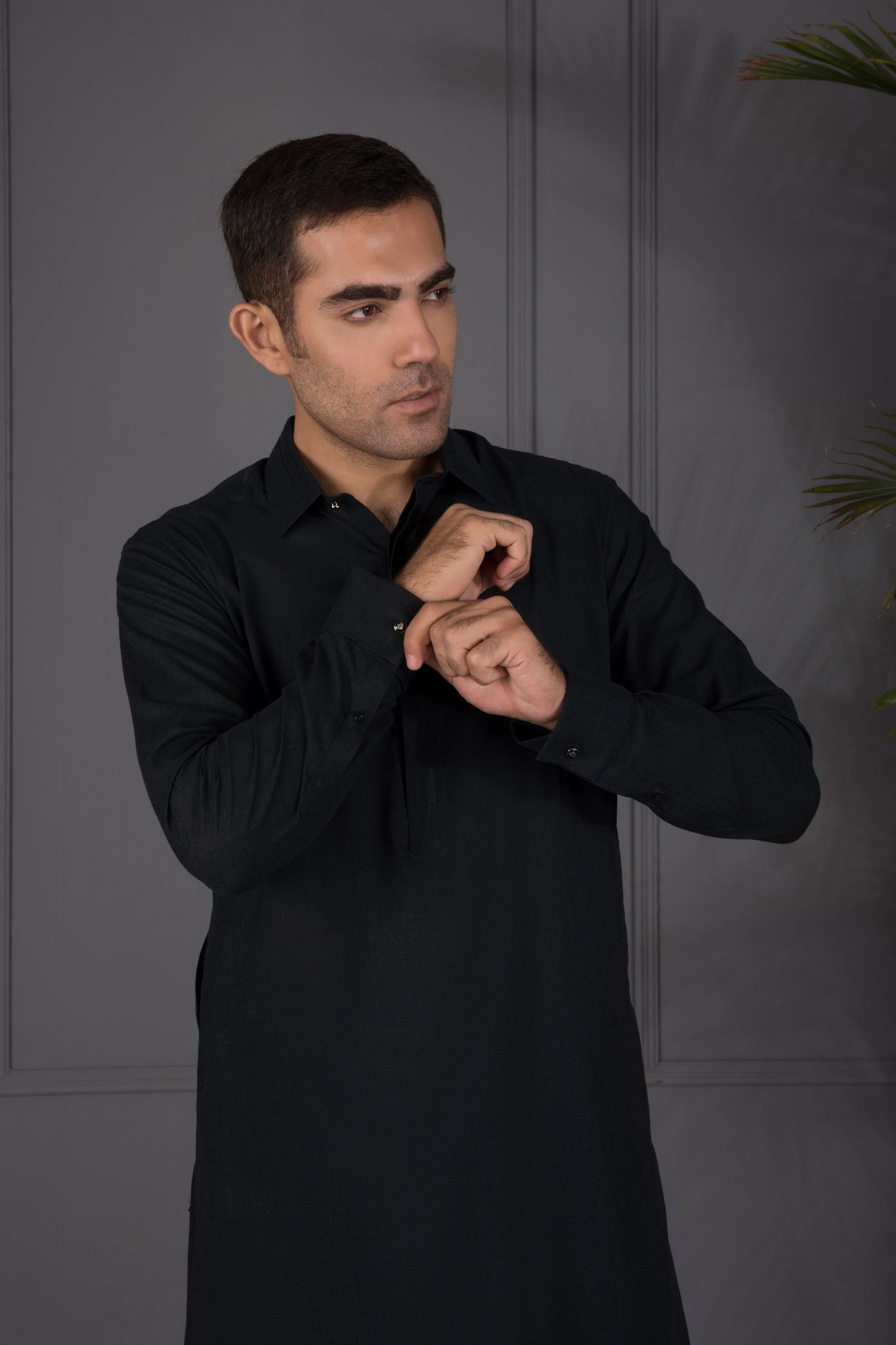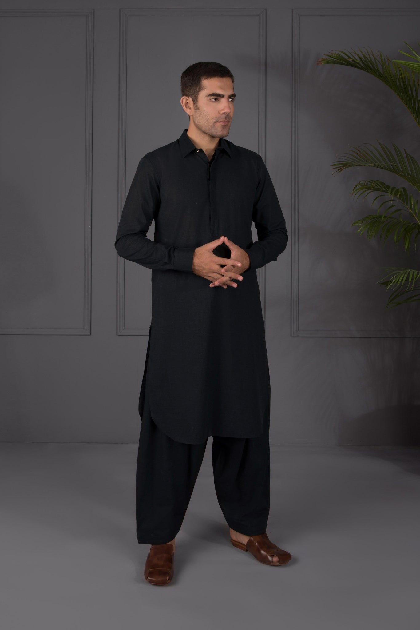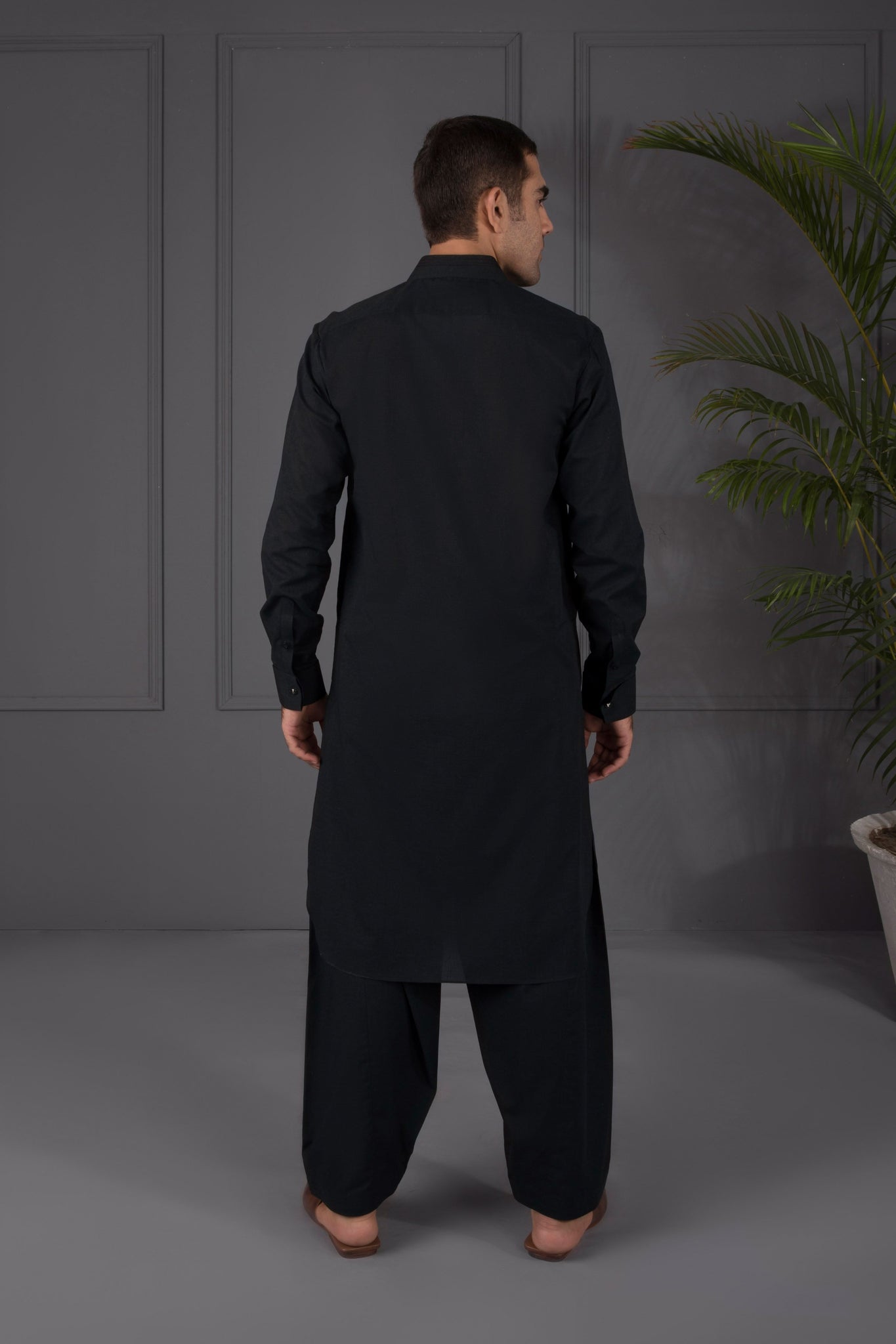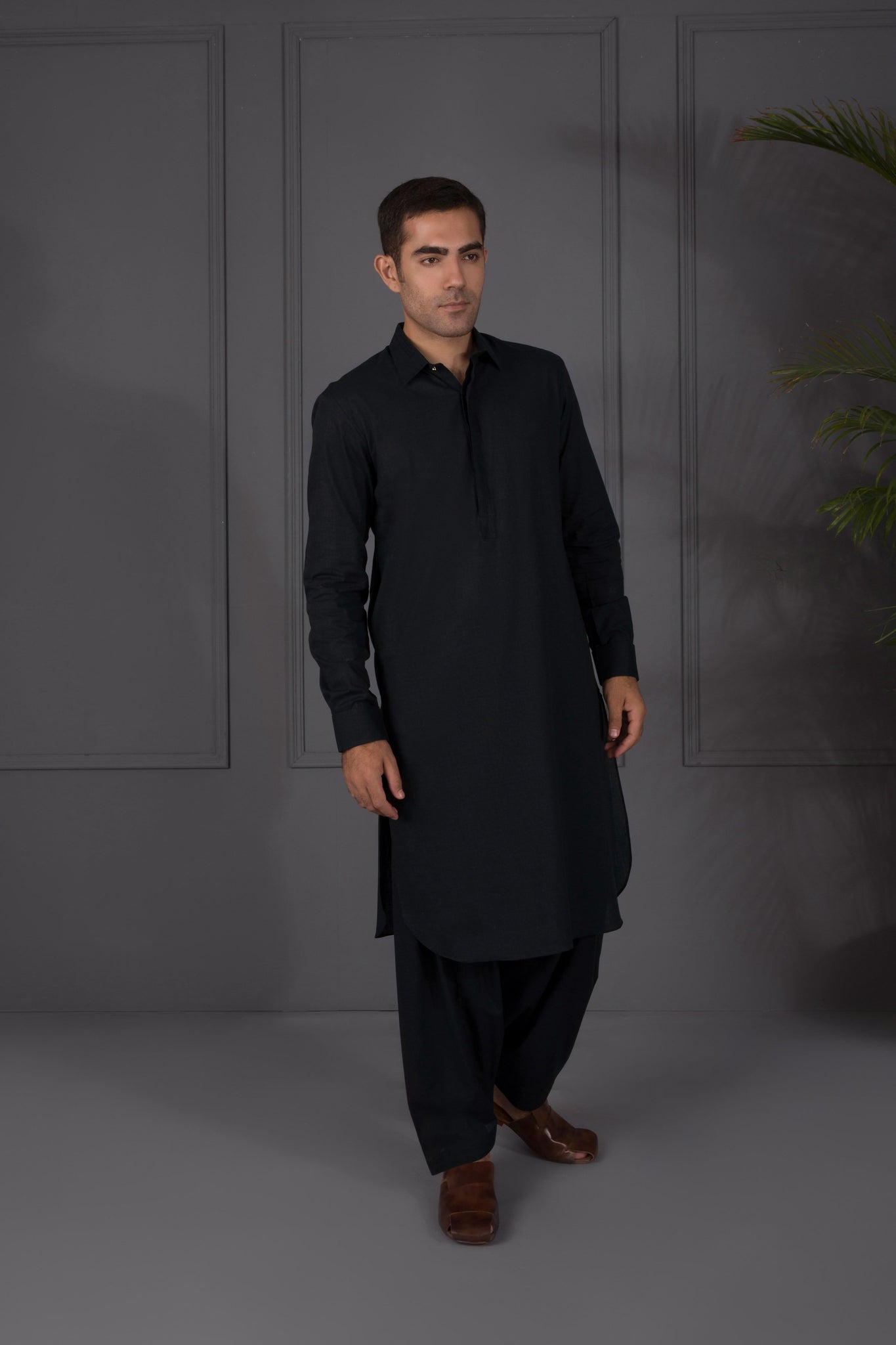 Plain Front, Plain Back, Full Sleeves with Cuffs, Collared Neck, Plain Shalwar