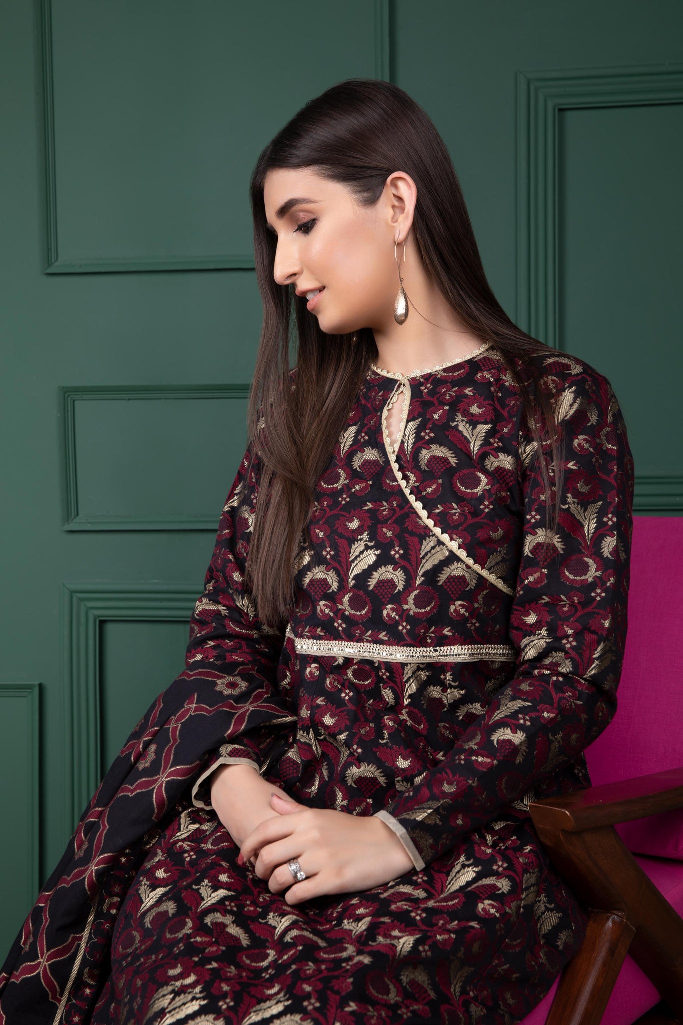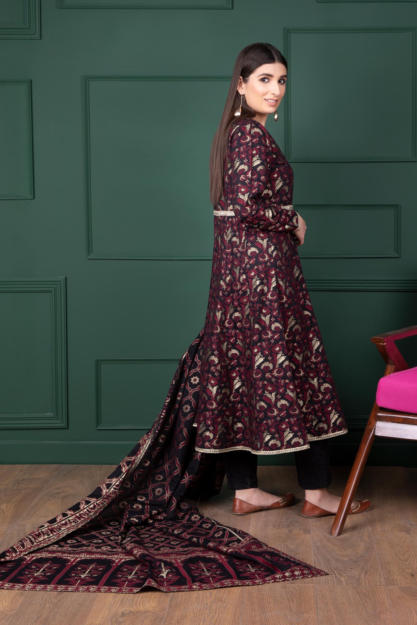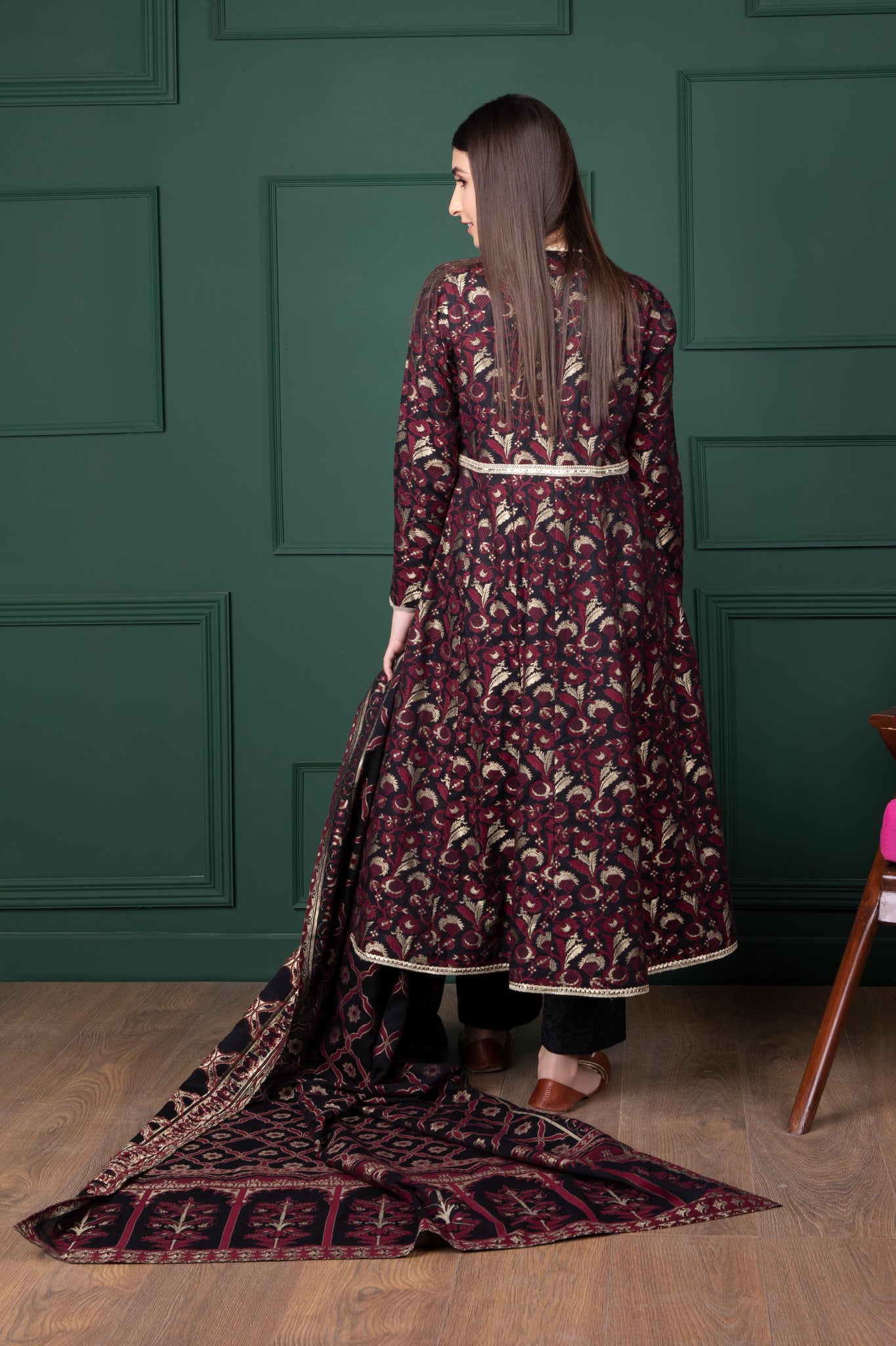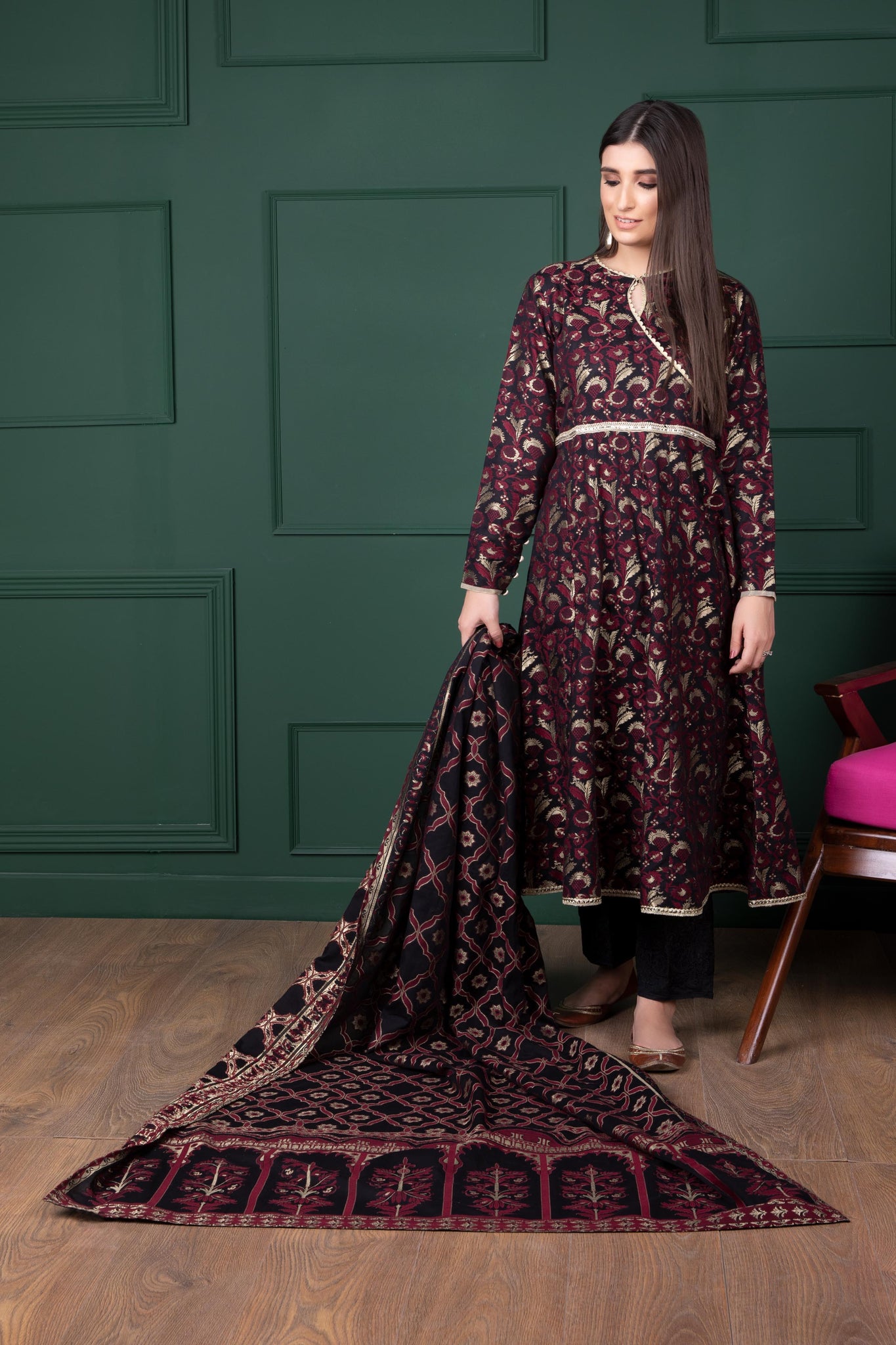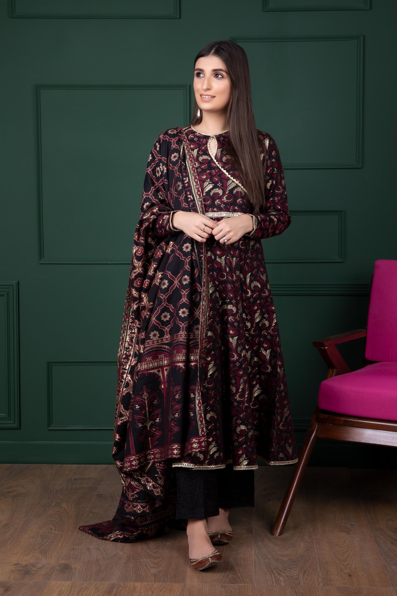 This stitched two-piece printed apparel is crafted in lustrous jacquard fabric making it perfect to wear at all your fancy gatherings.