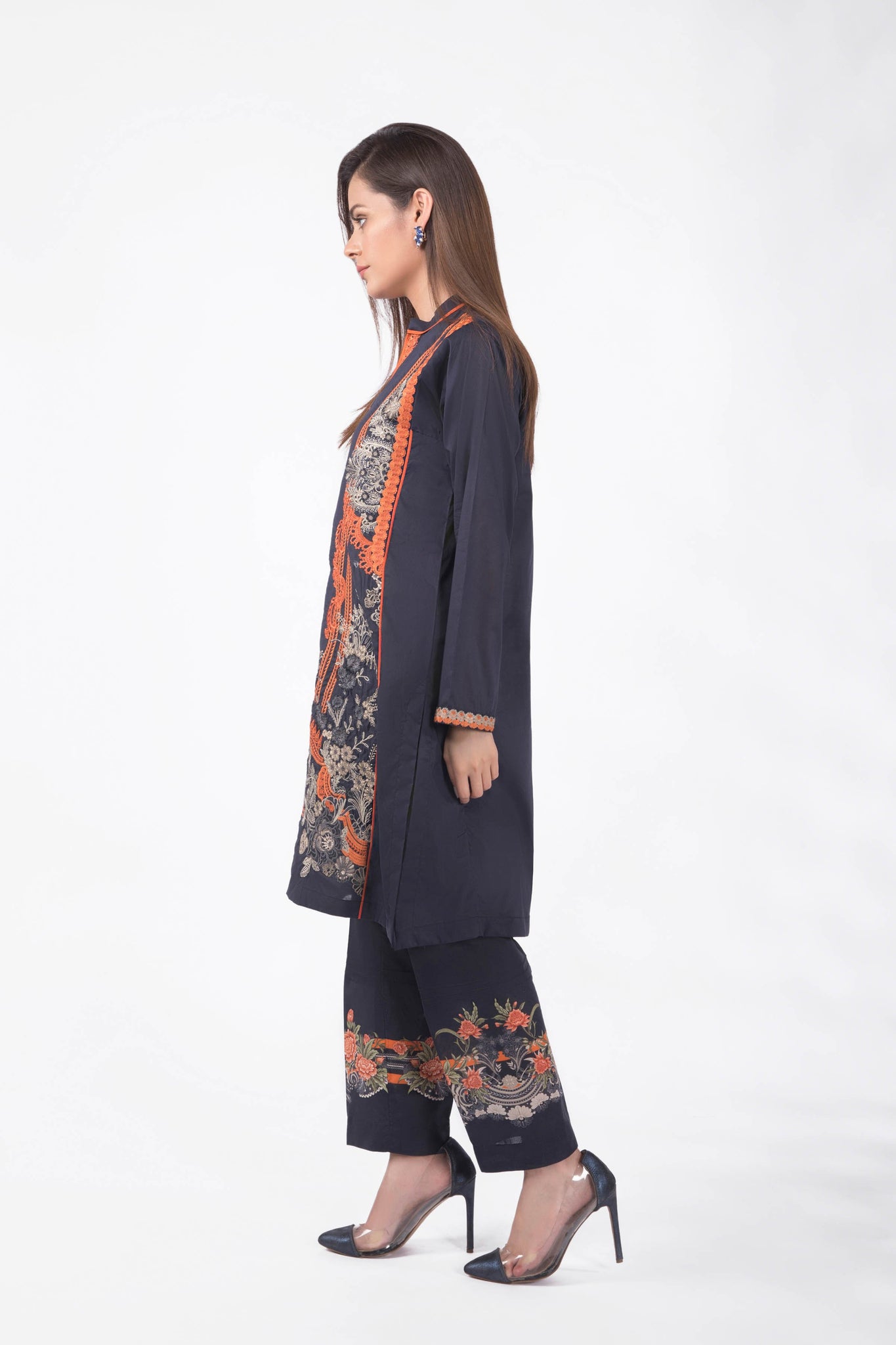 This embroidered two-piece is suffused in a sundaze blaze on a midnight blue canvas to keep your guests in awe.