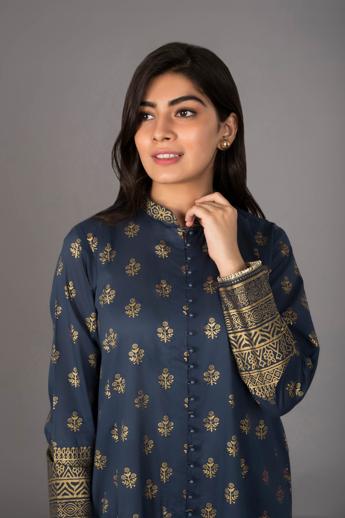 Midnight blue kurta with buttons down the neckline and a modern silhouette to create a startling ensemble .