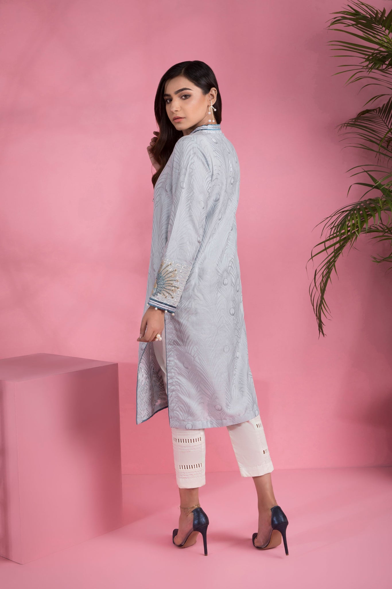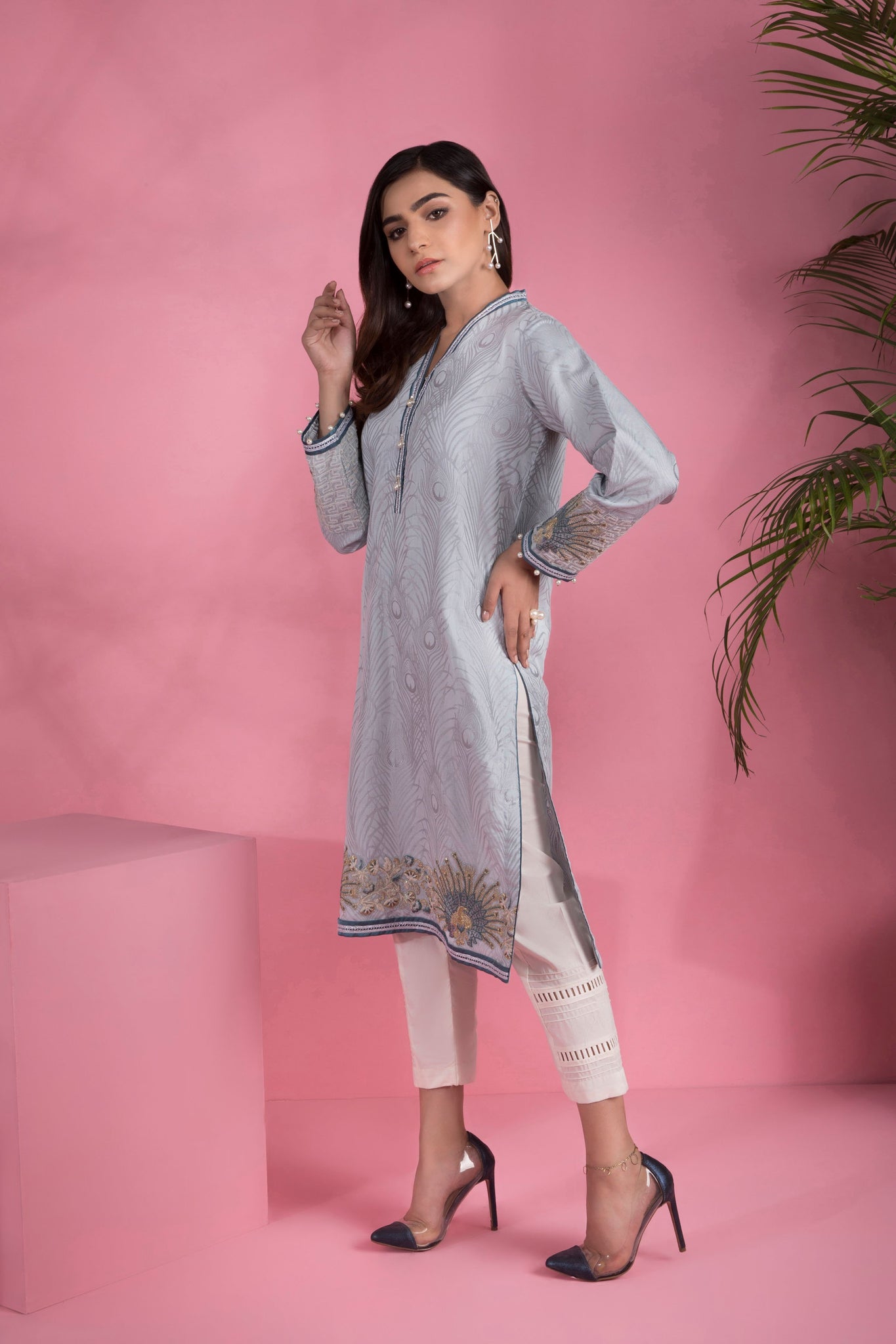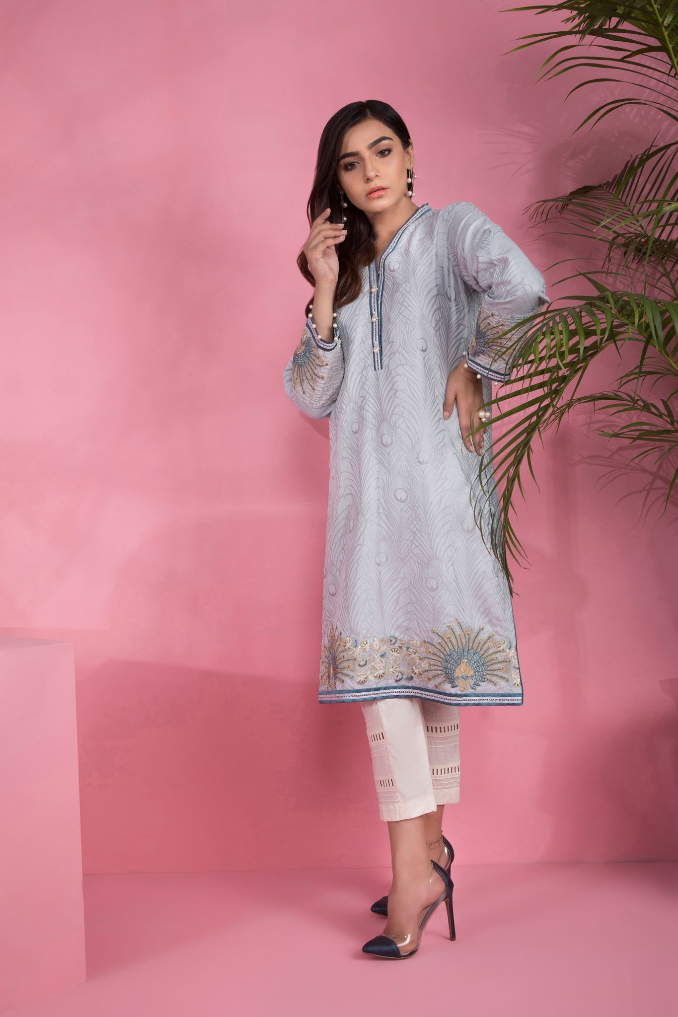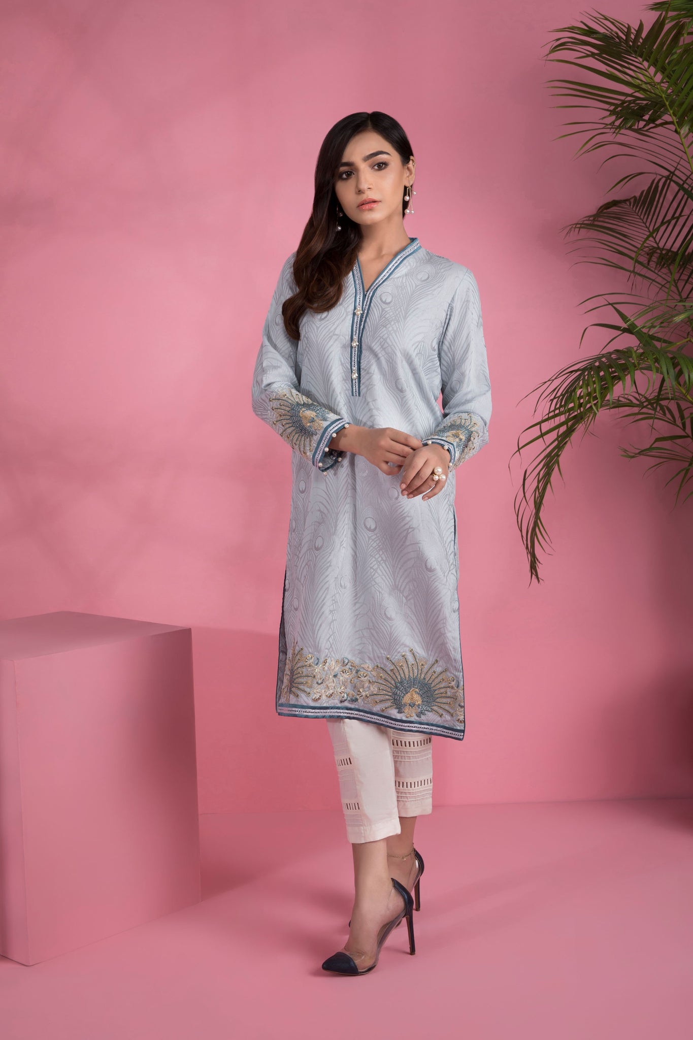 Embroidered Front, Plain Back, Full Sleeves with Embroidery, Y Neckline