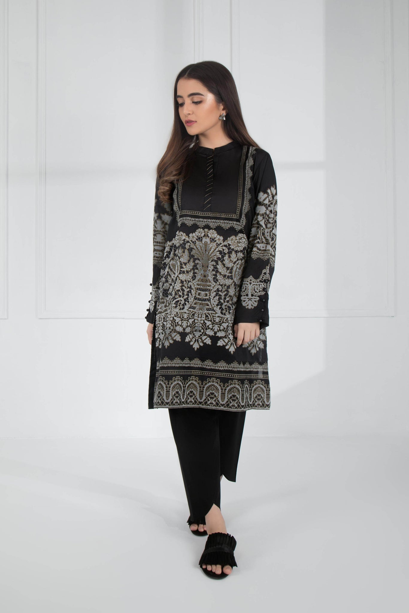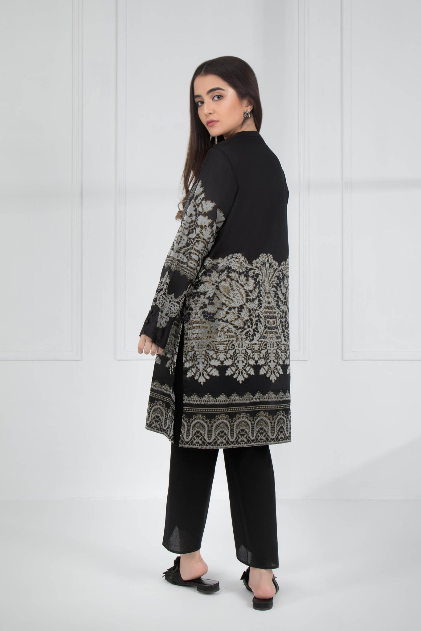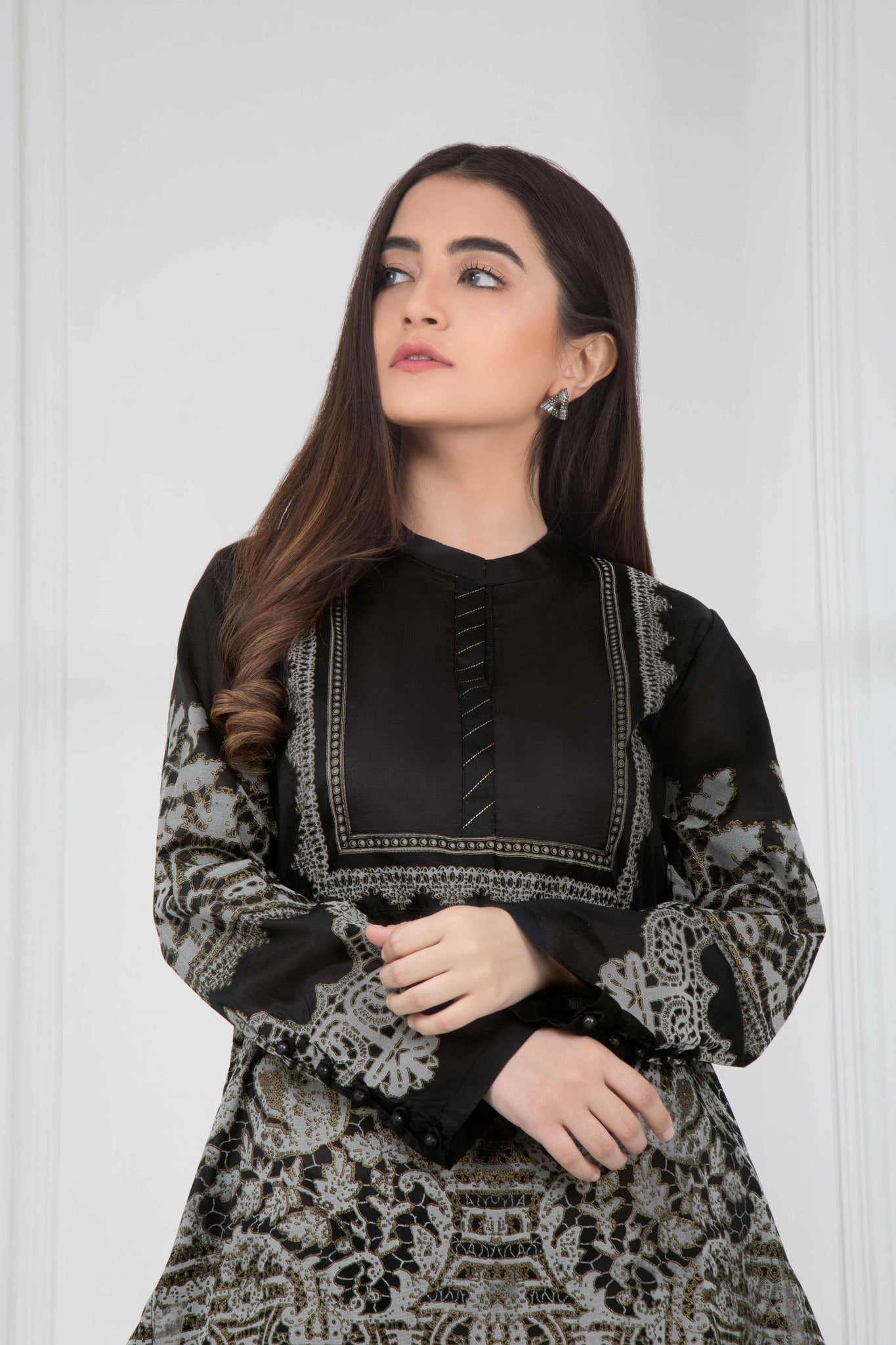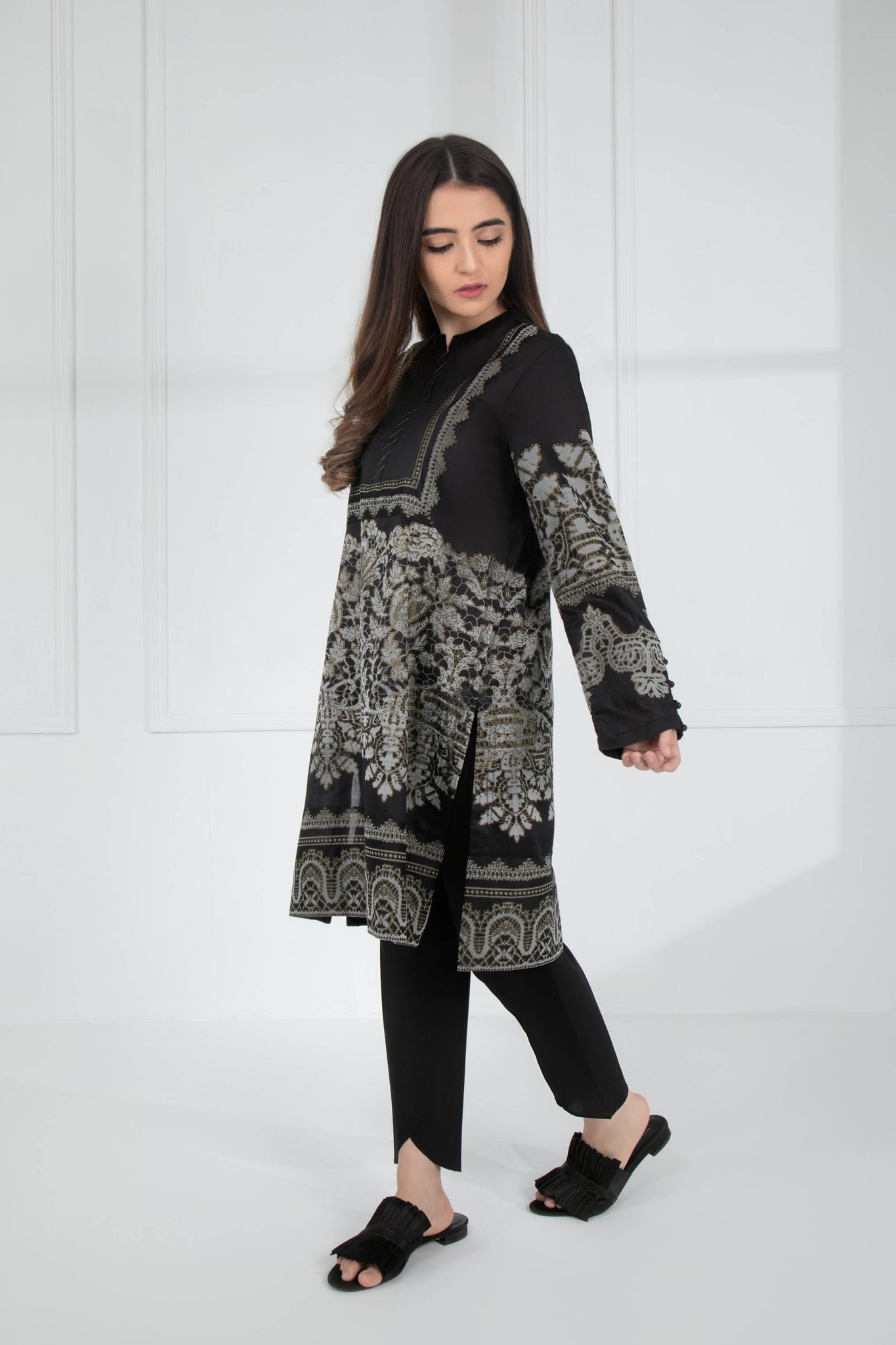 Printed Front, Printed Back, Full Sleeves, Band Neckline with Split