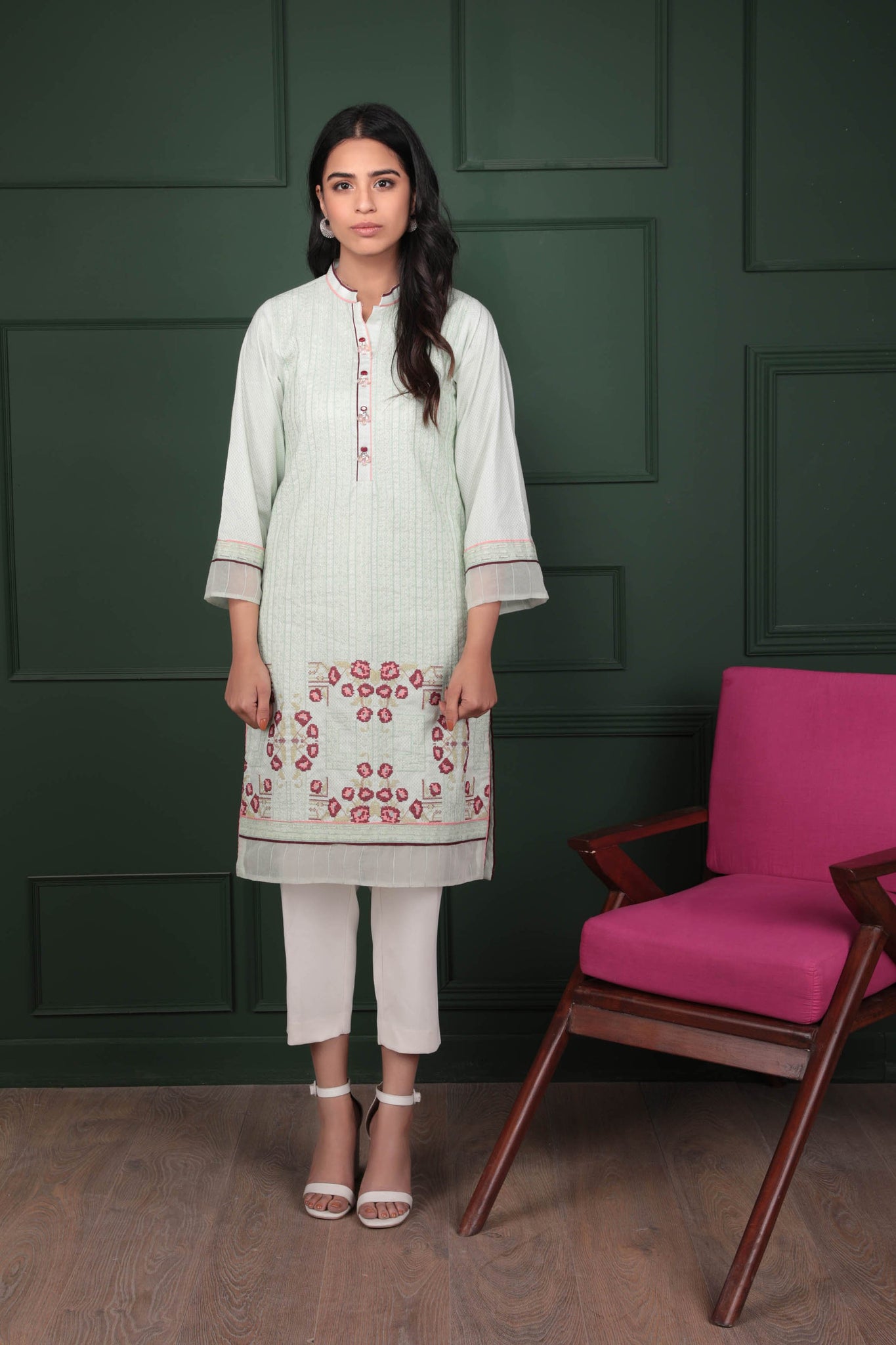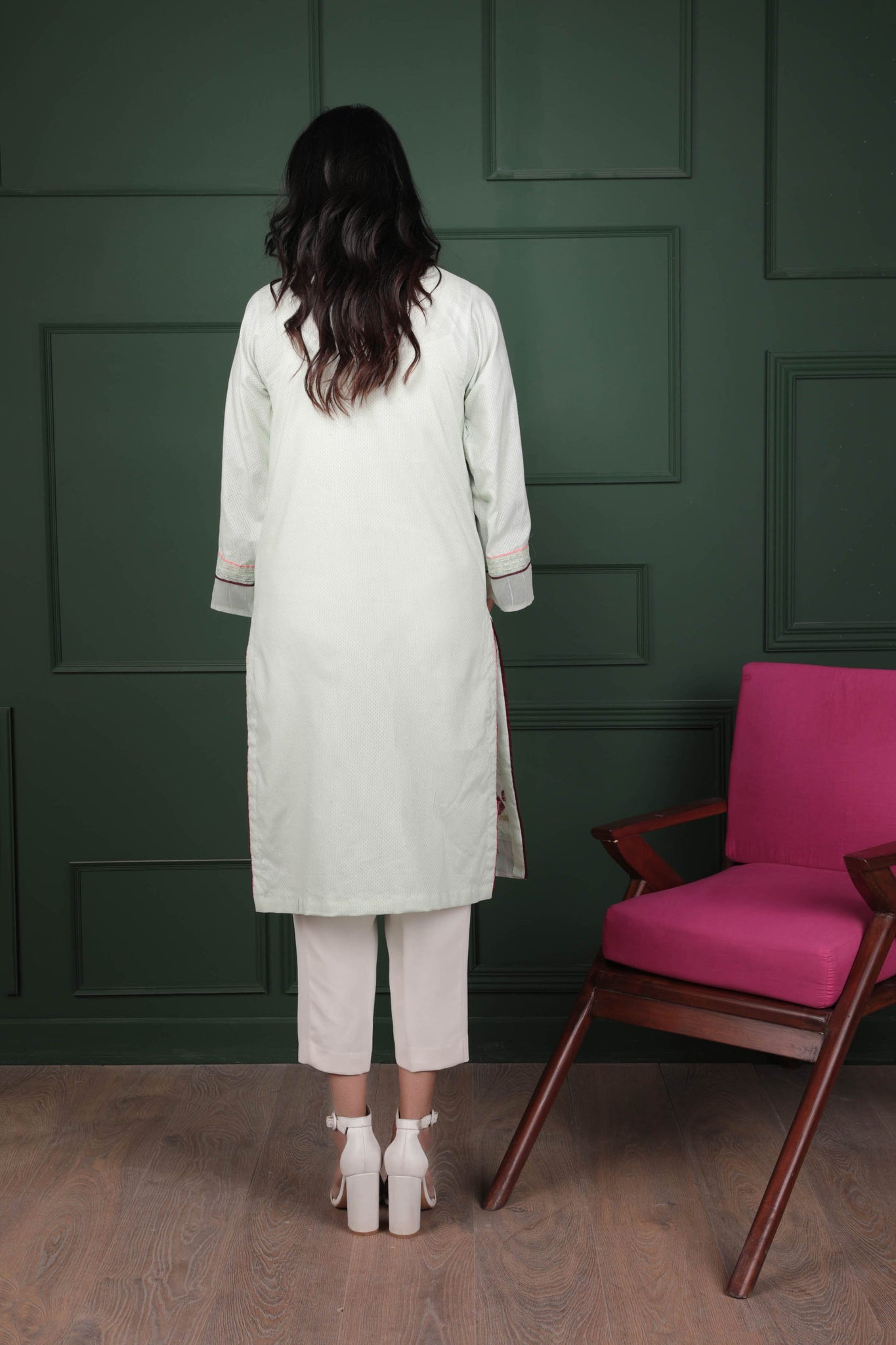 Embroidered Front, Plain Back, Full Sleeves, Band Neckline with Placket
