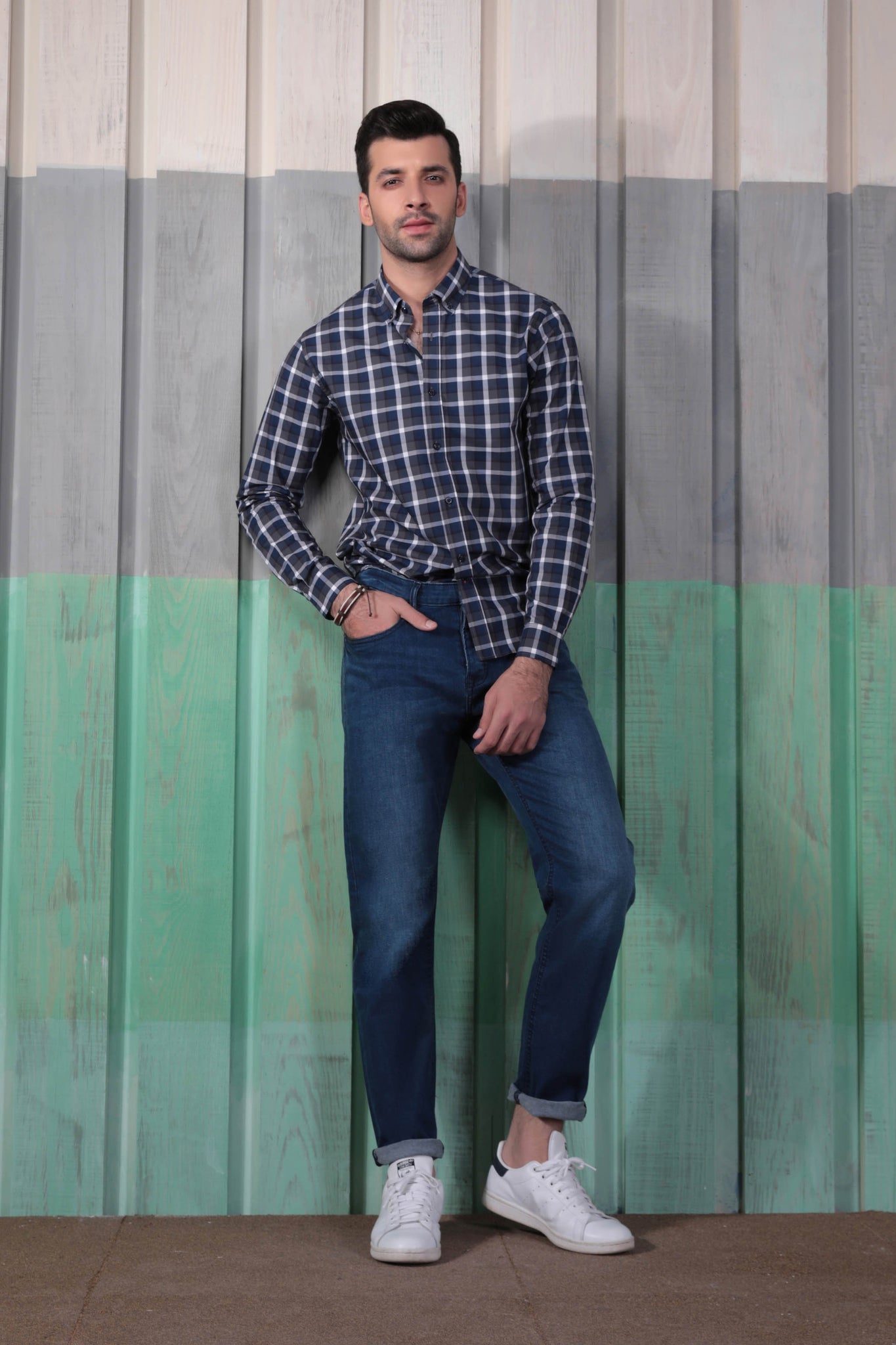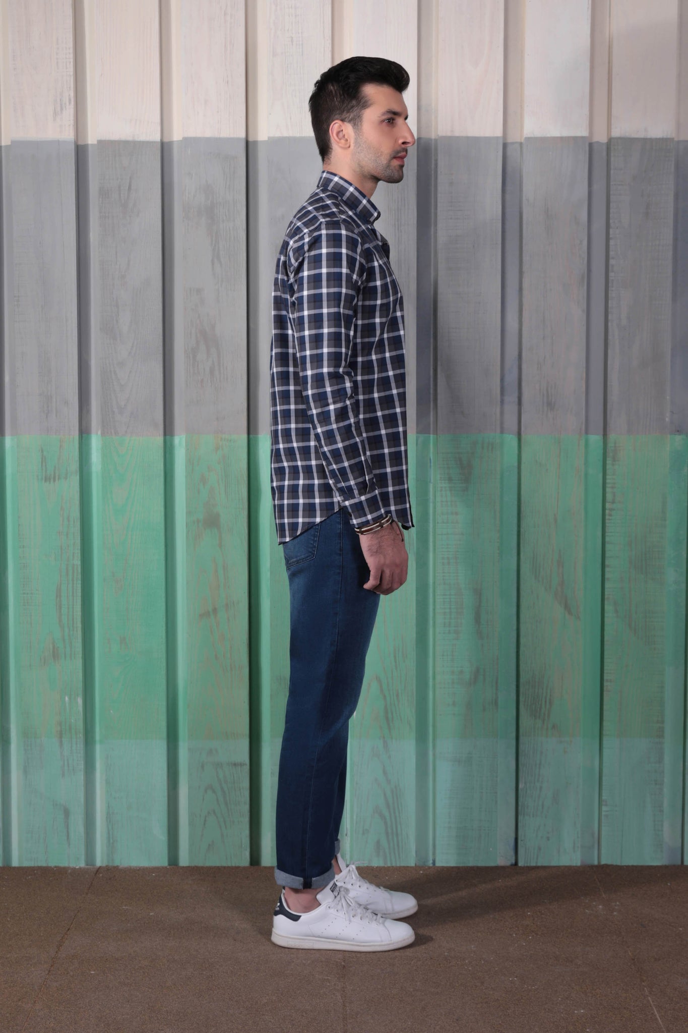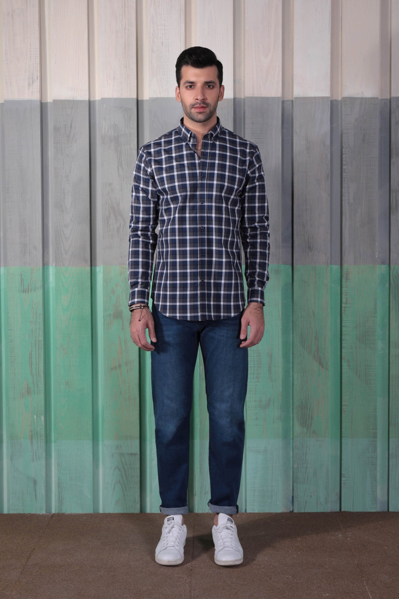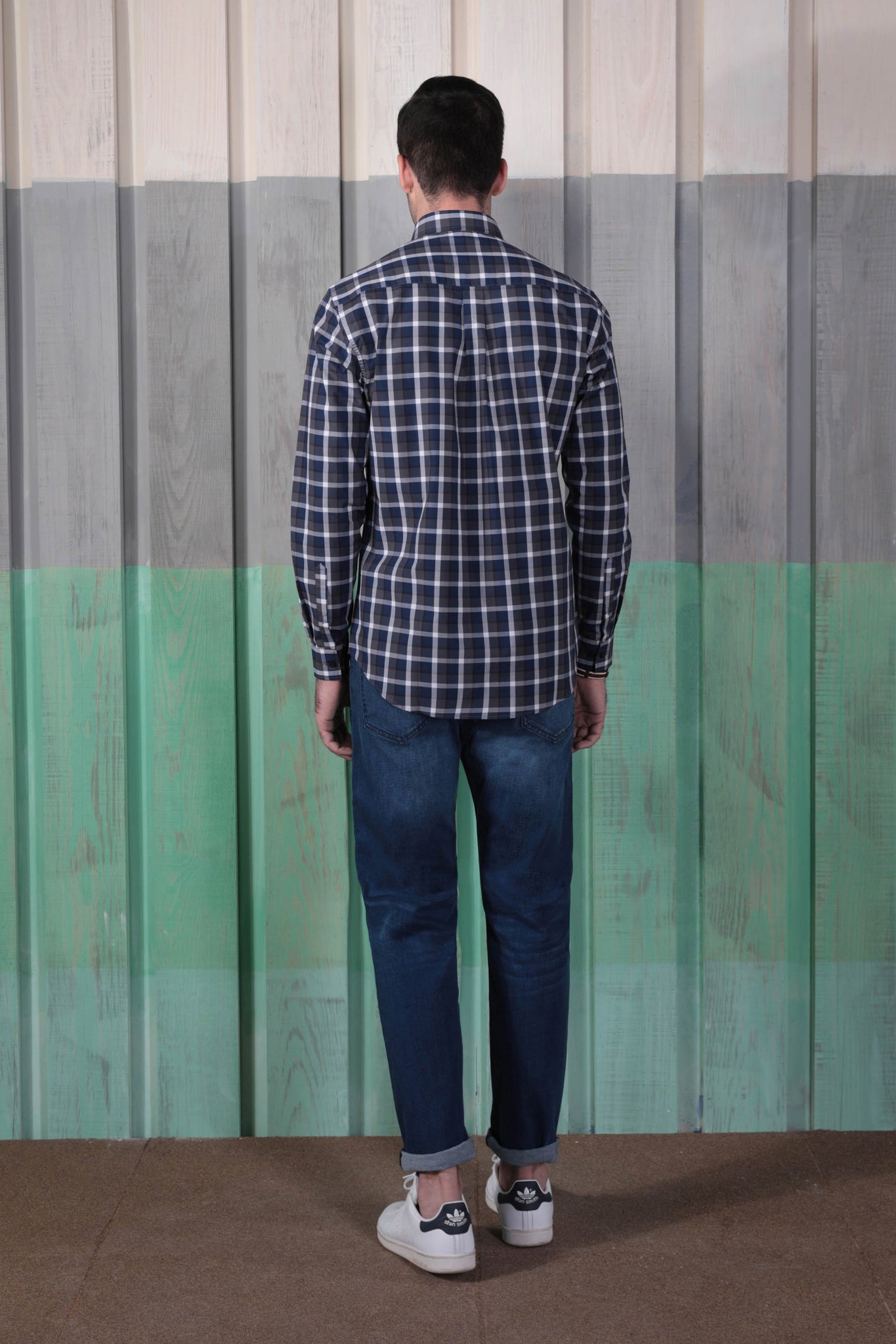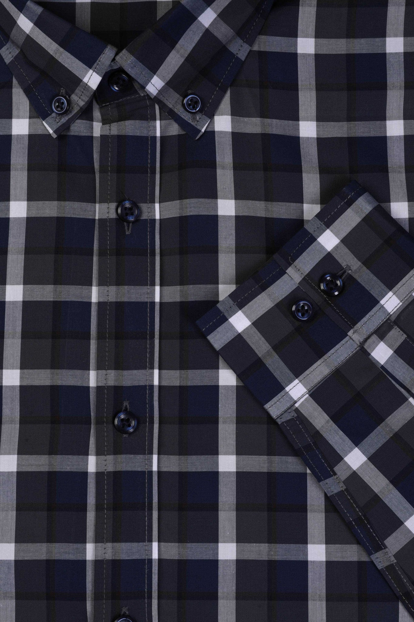 Deep blue-black checks with a hint of white make this poplin shirt perfect for winter.