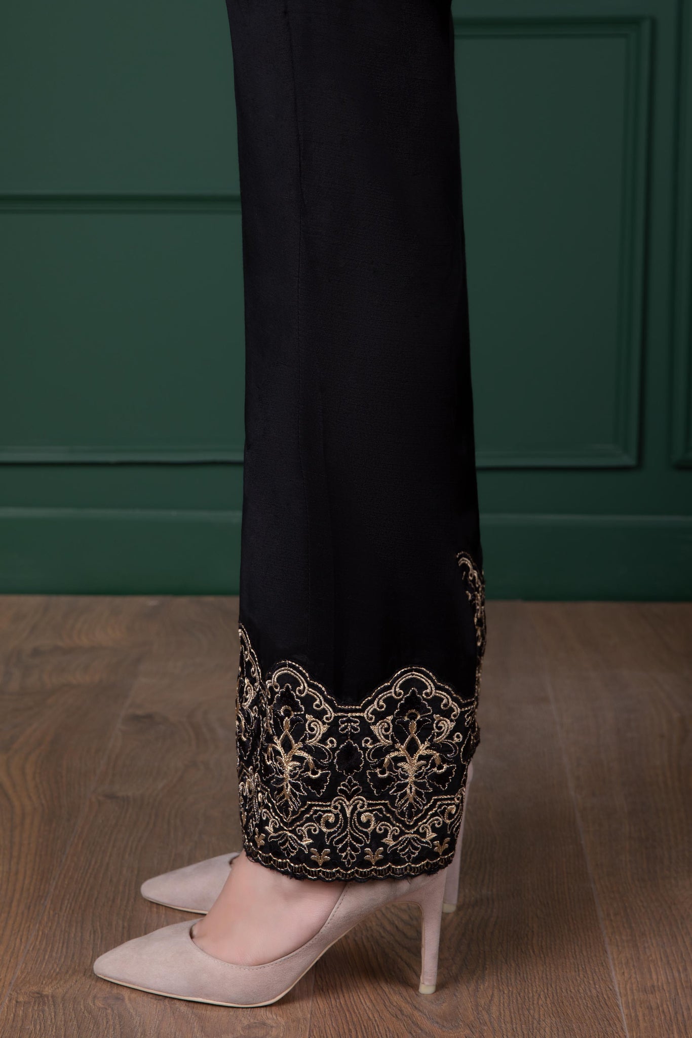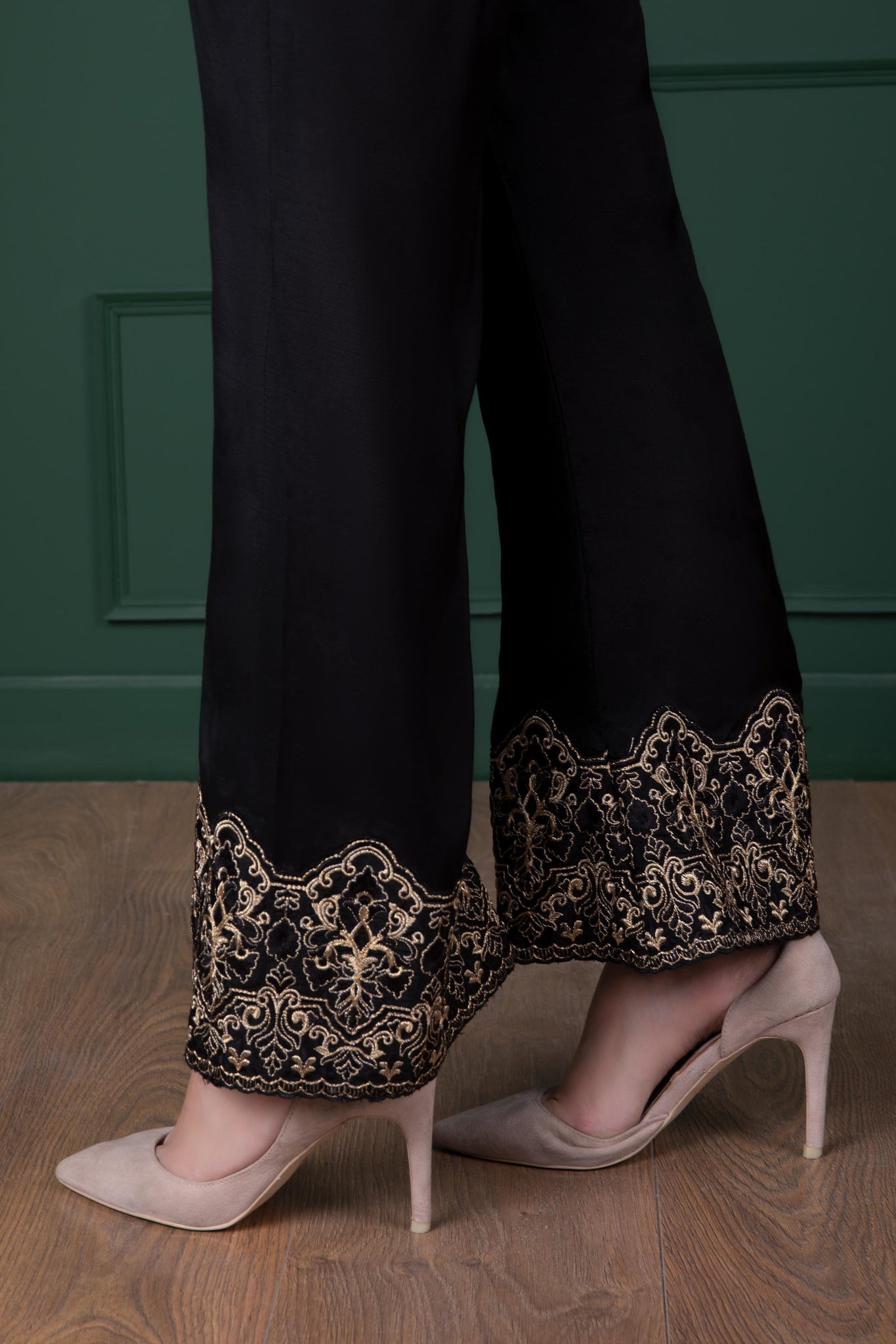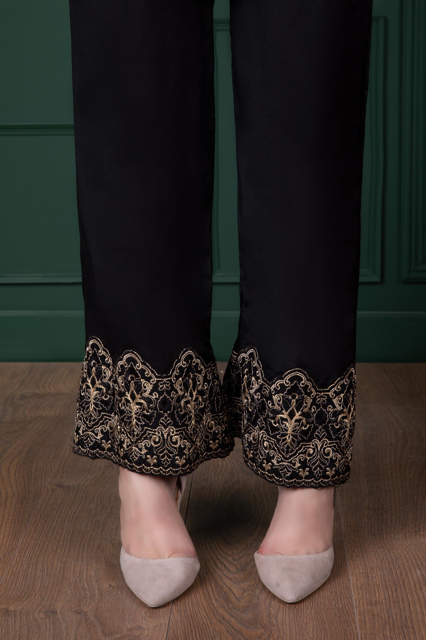 Black silky bootcut pants featuring stunning mud-brown embroidery at the hem.