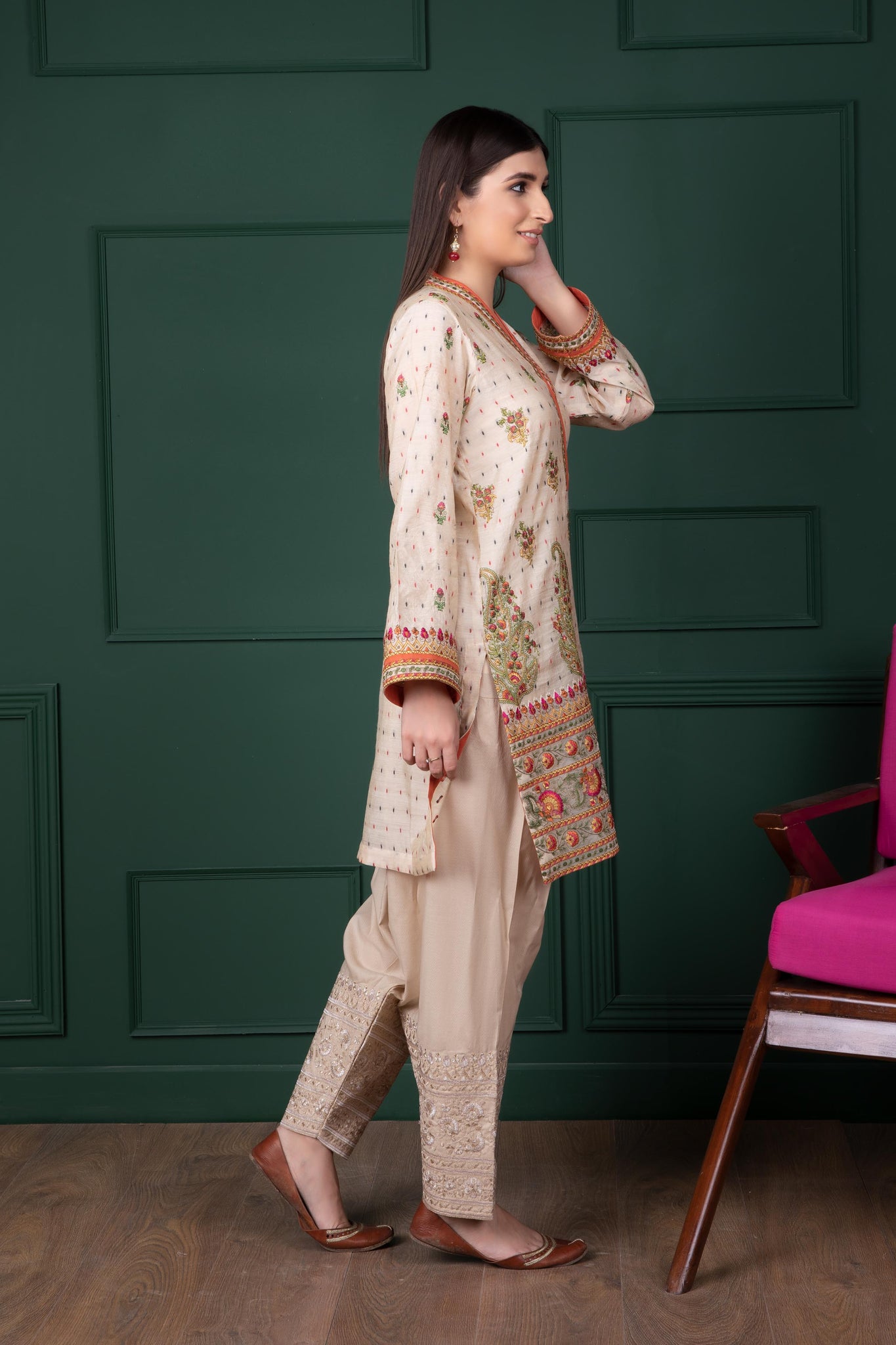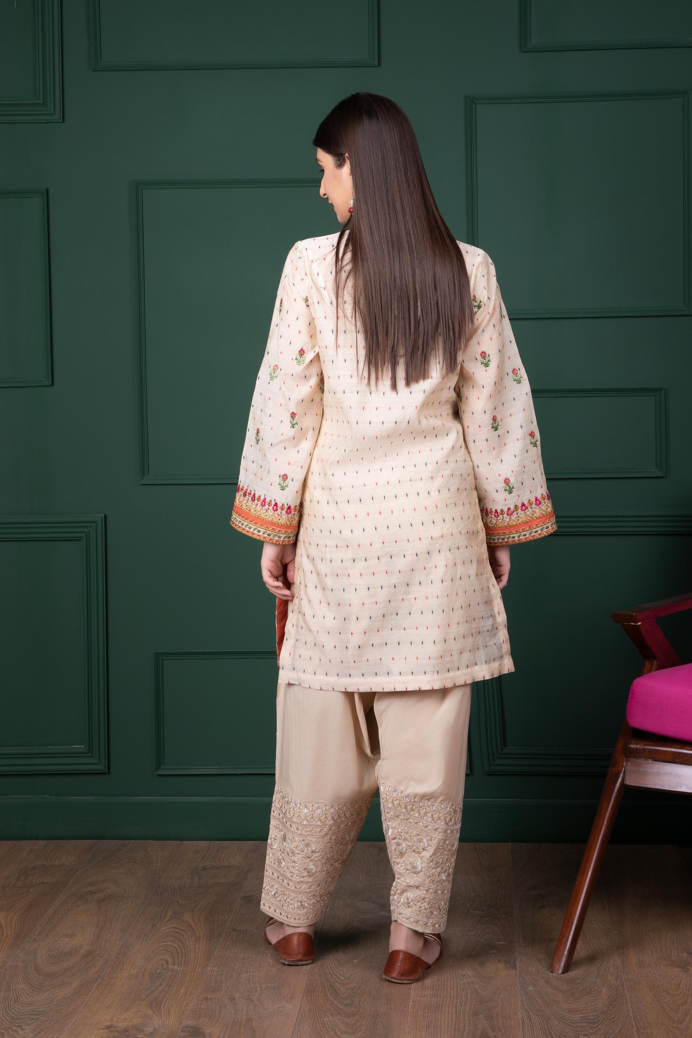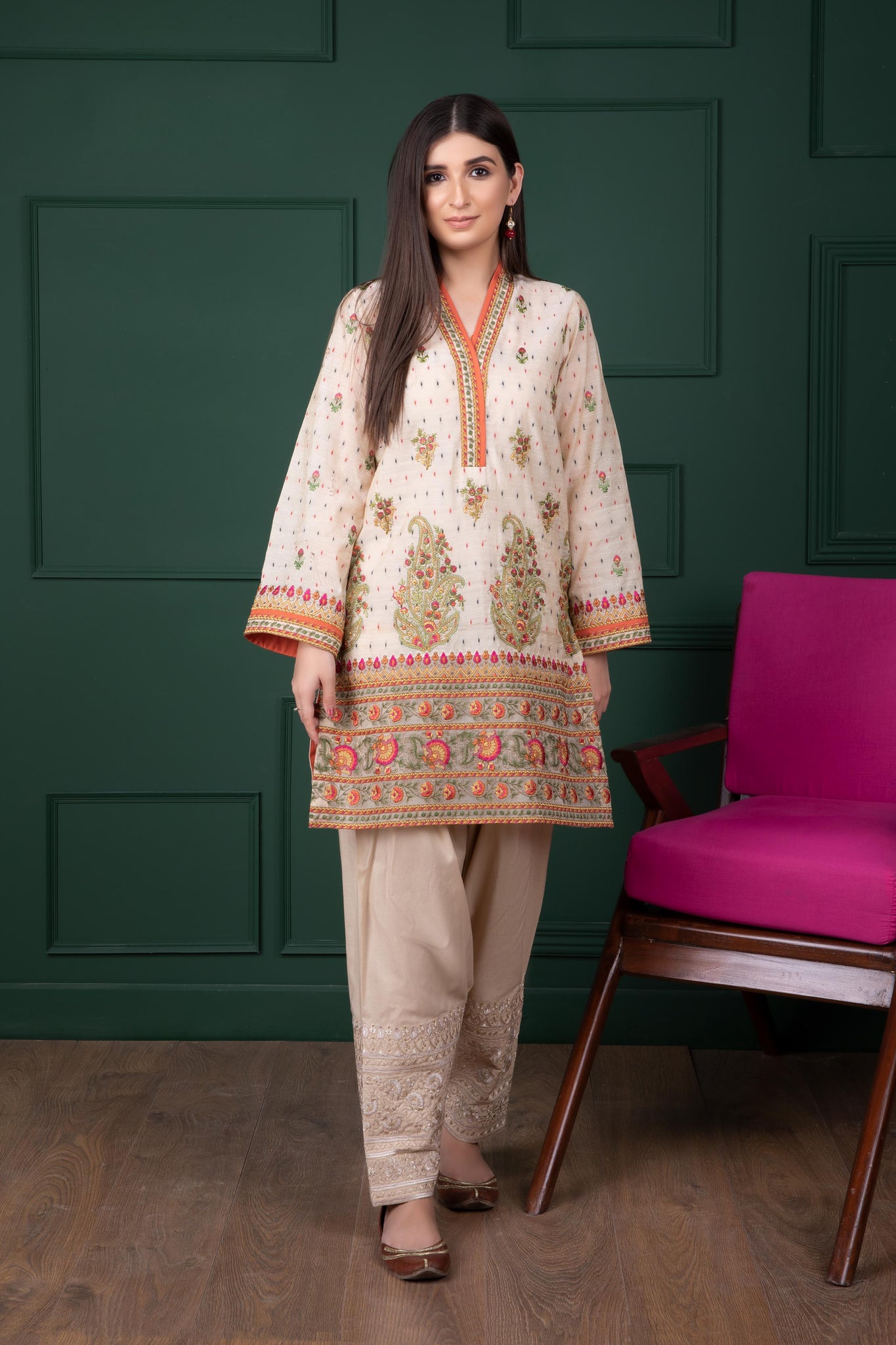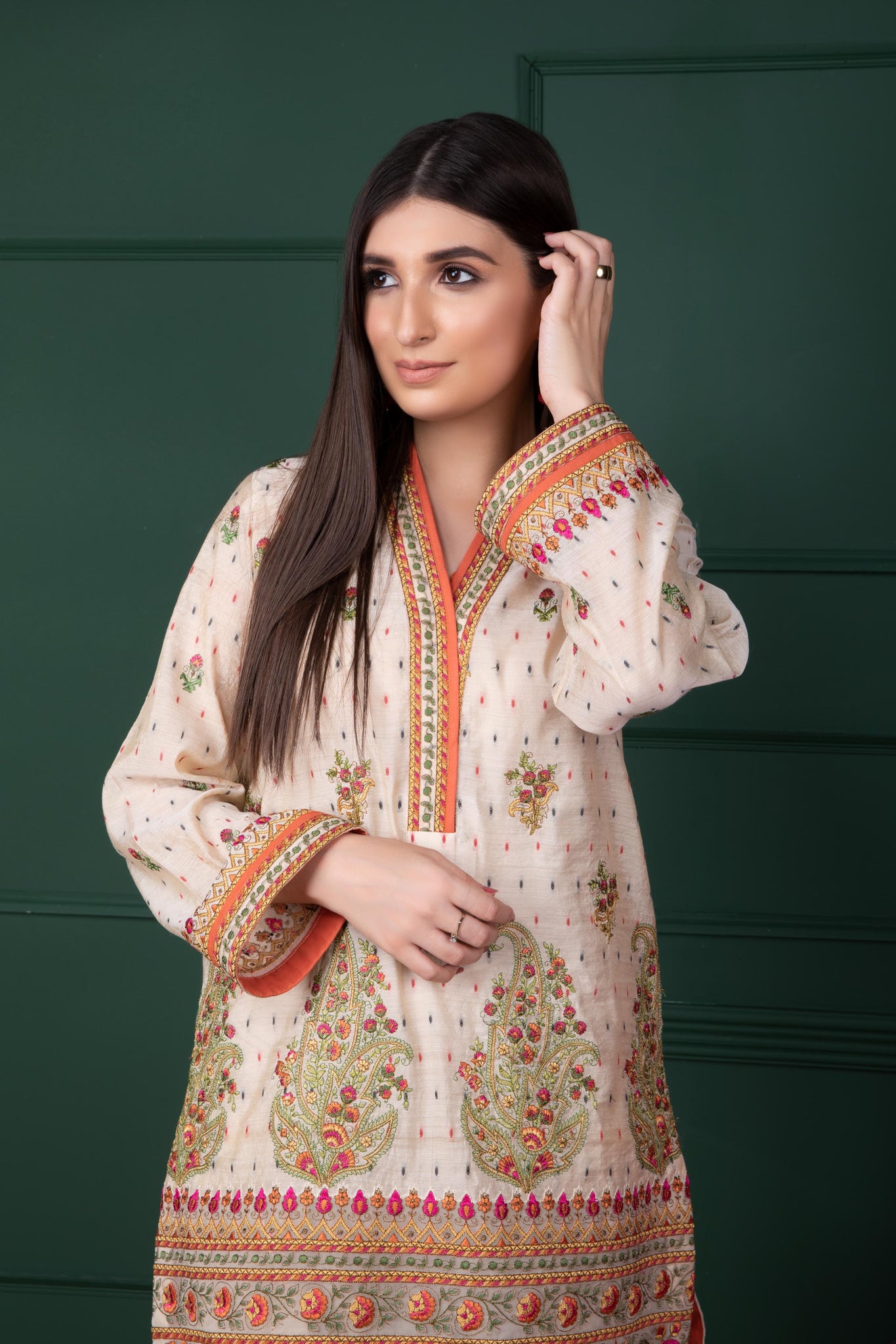 Embroidered Front, Plain Back, Full Sleeves with Embroidery, Y Neckline