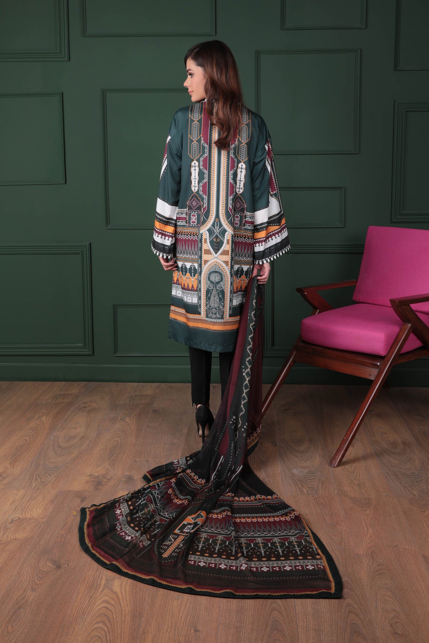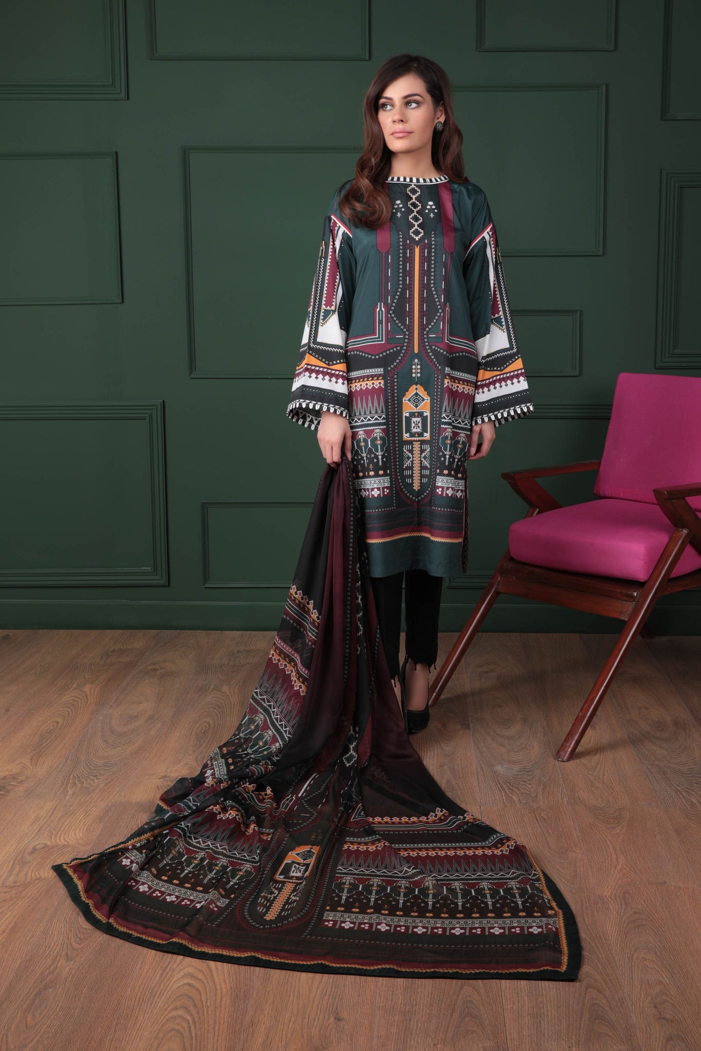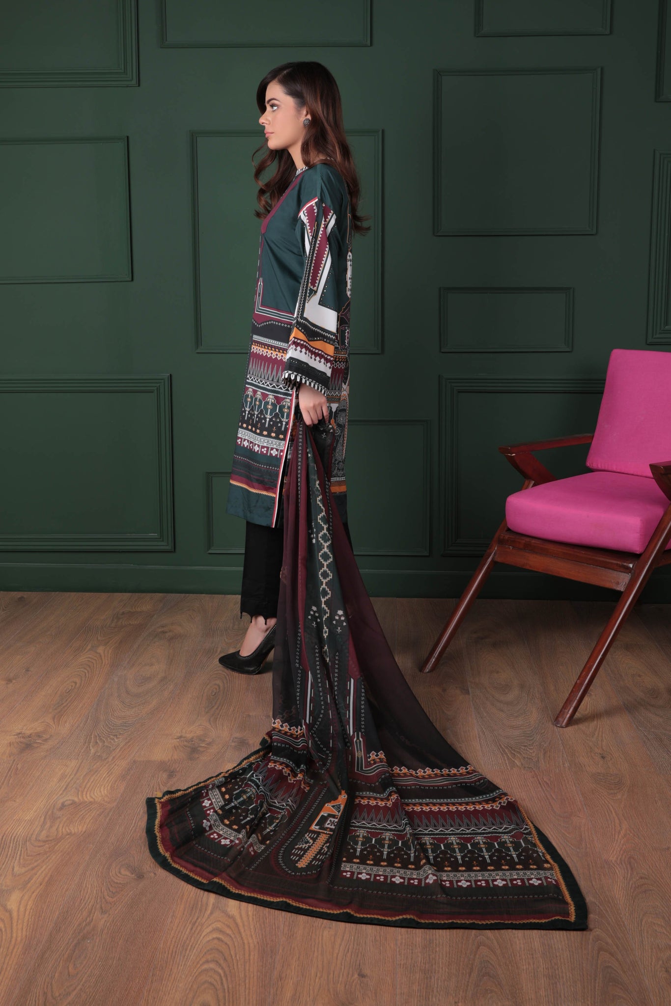 This luxe silk tunic paired with gorgeously printed chiffon dupatta can surely become a stunning outfit at a nice dinner party.