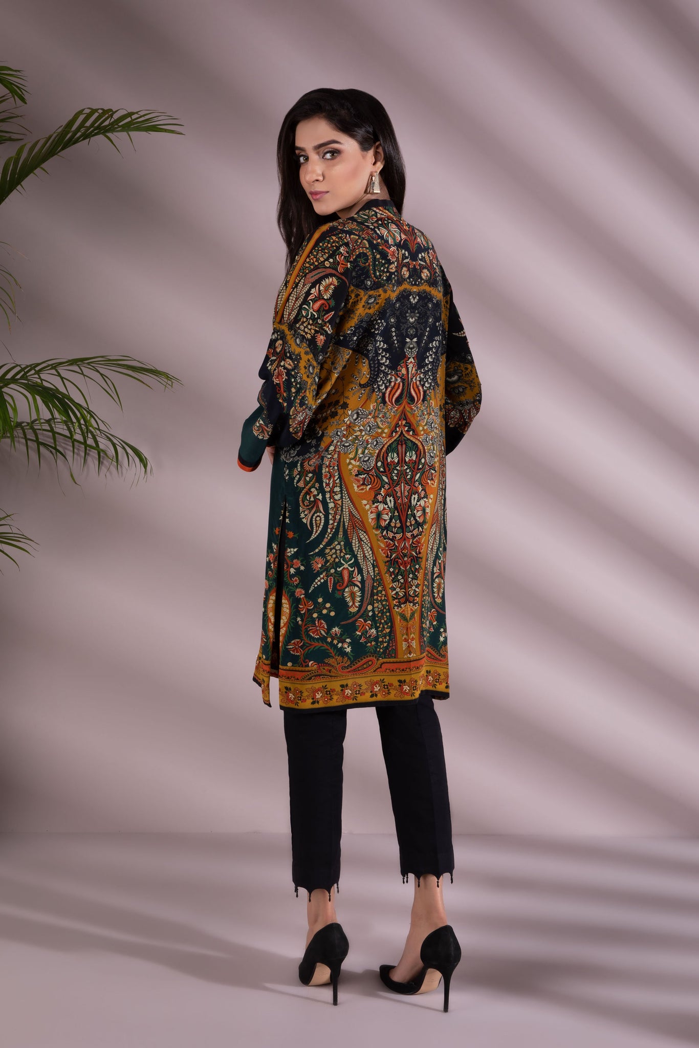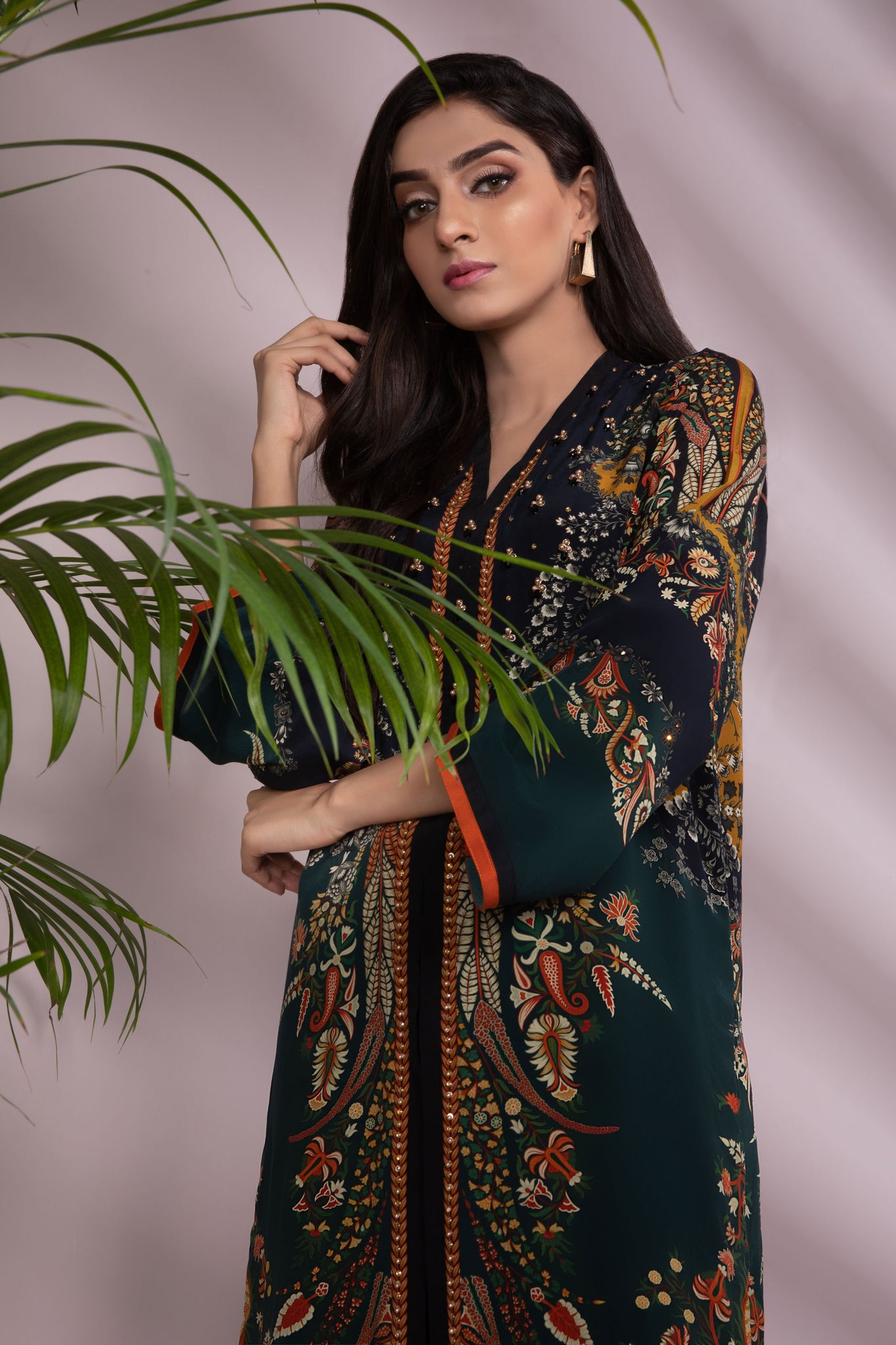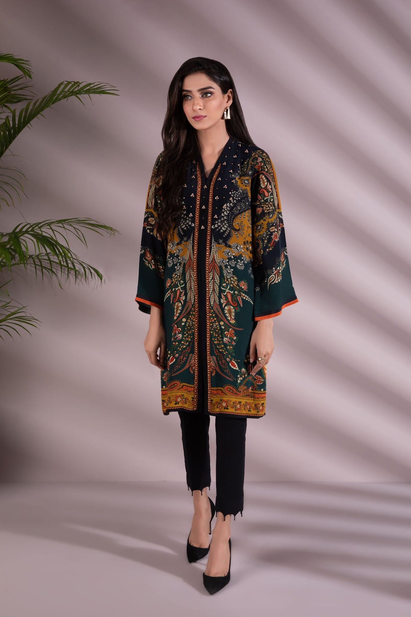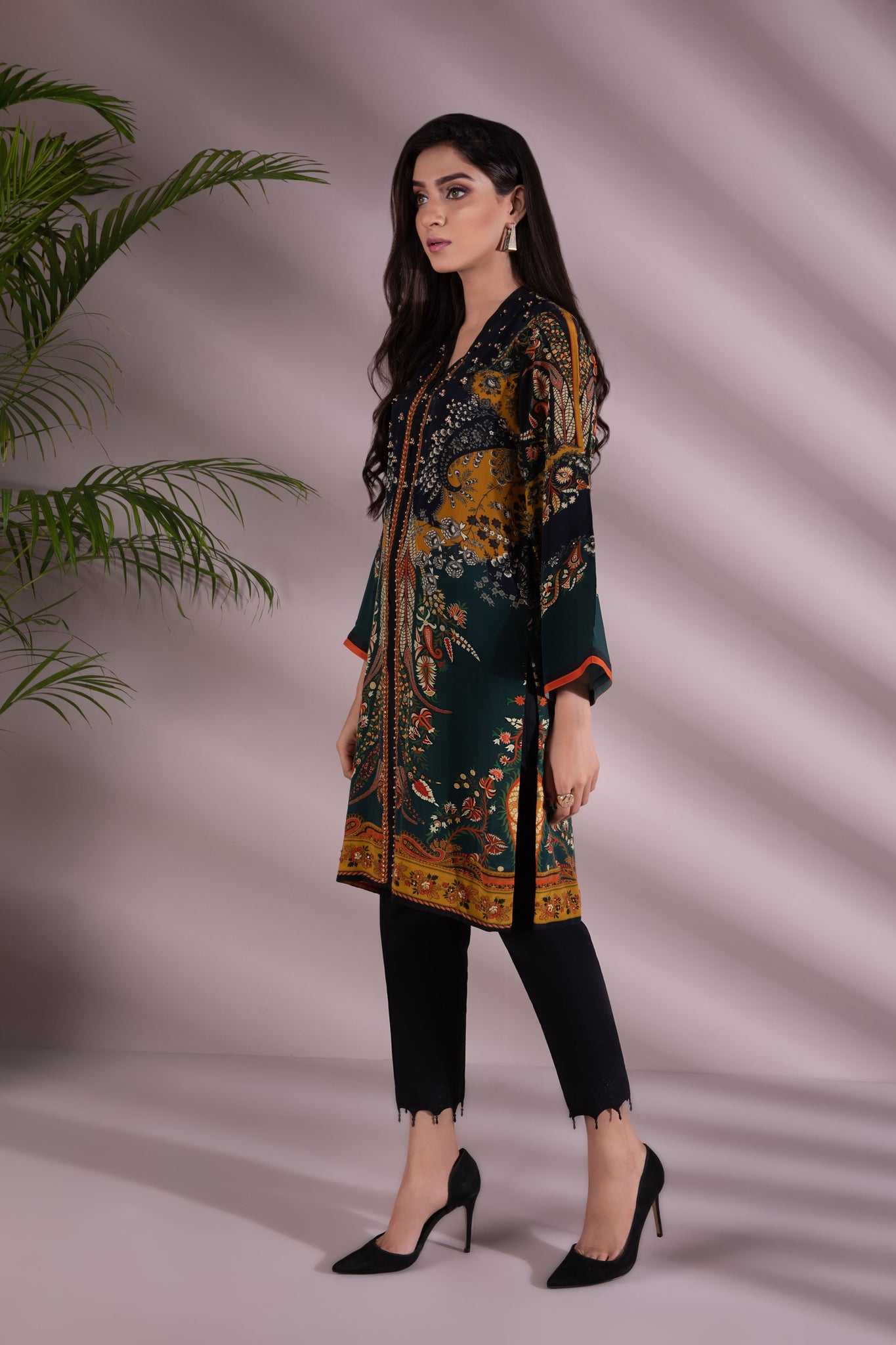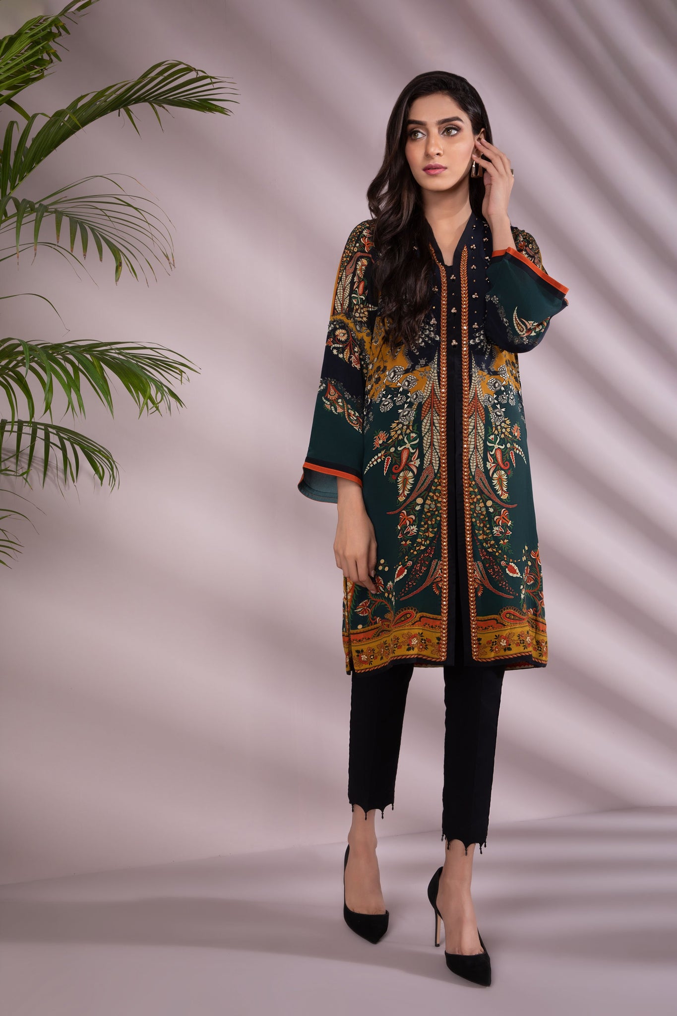 Printed front with Embellishment, Printed Back, Full Sleeves, Y Neckline