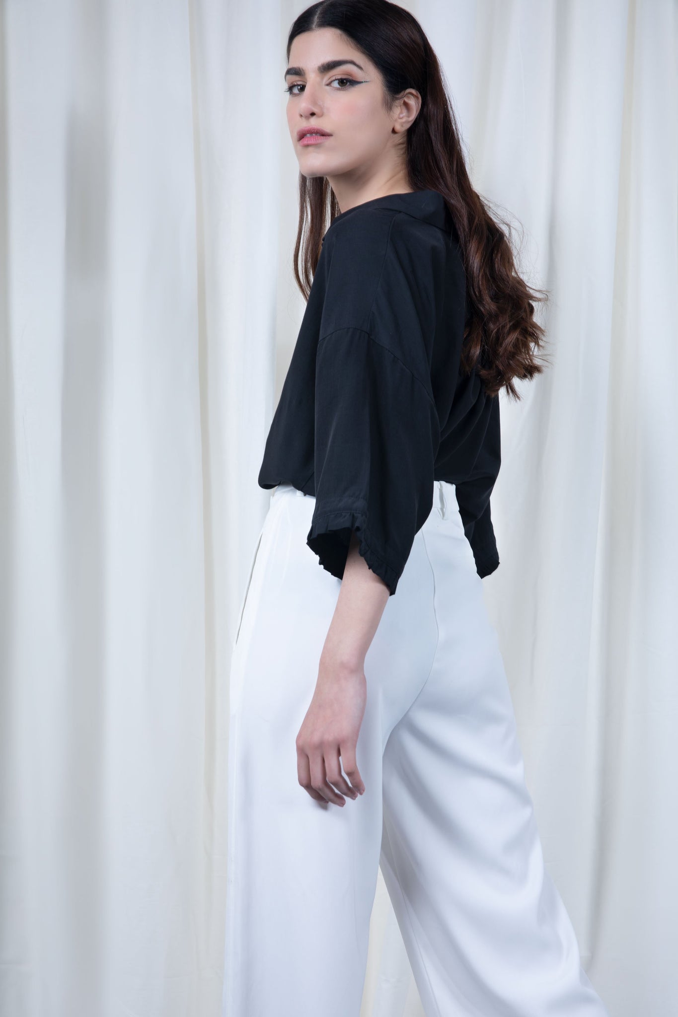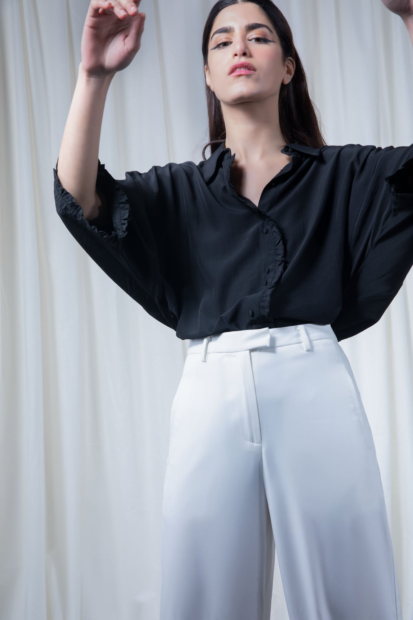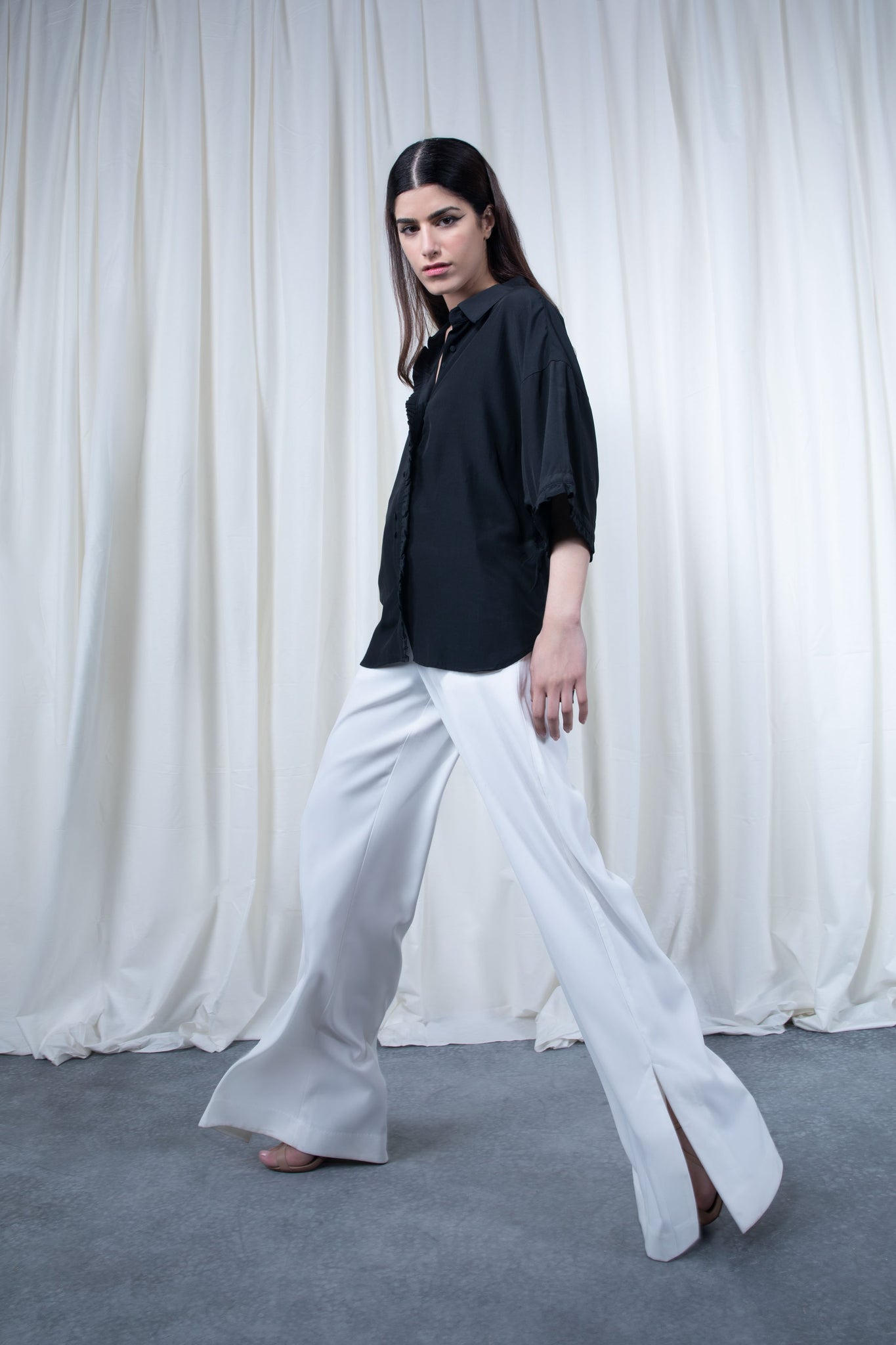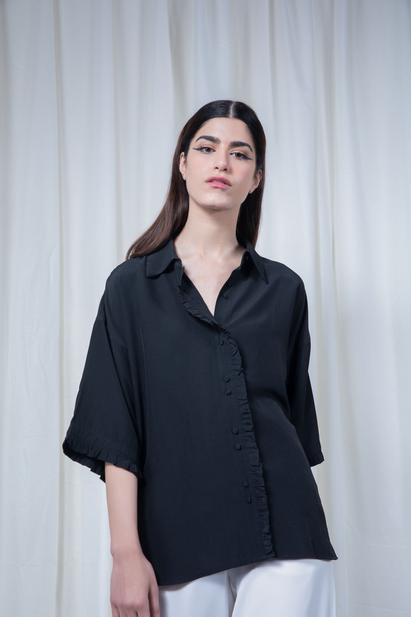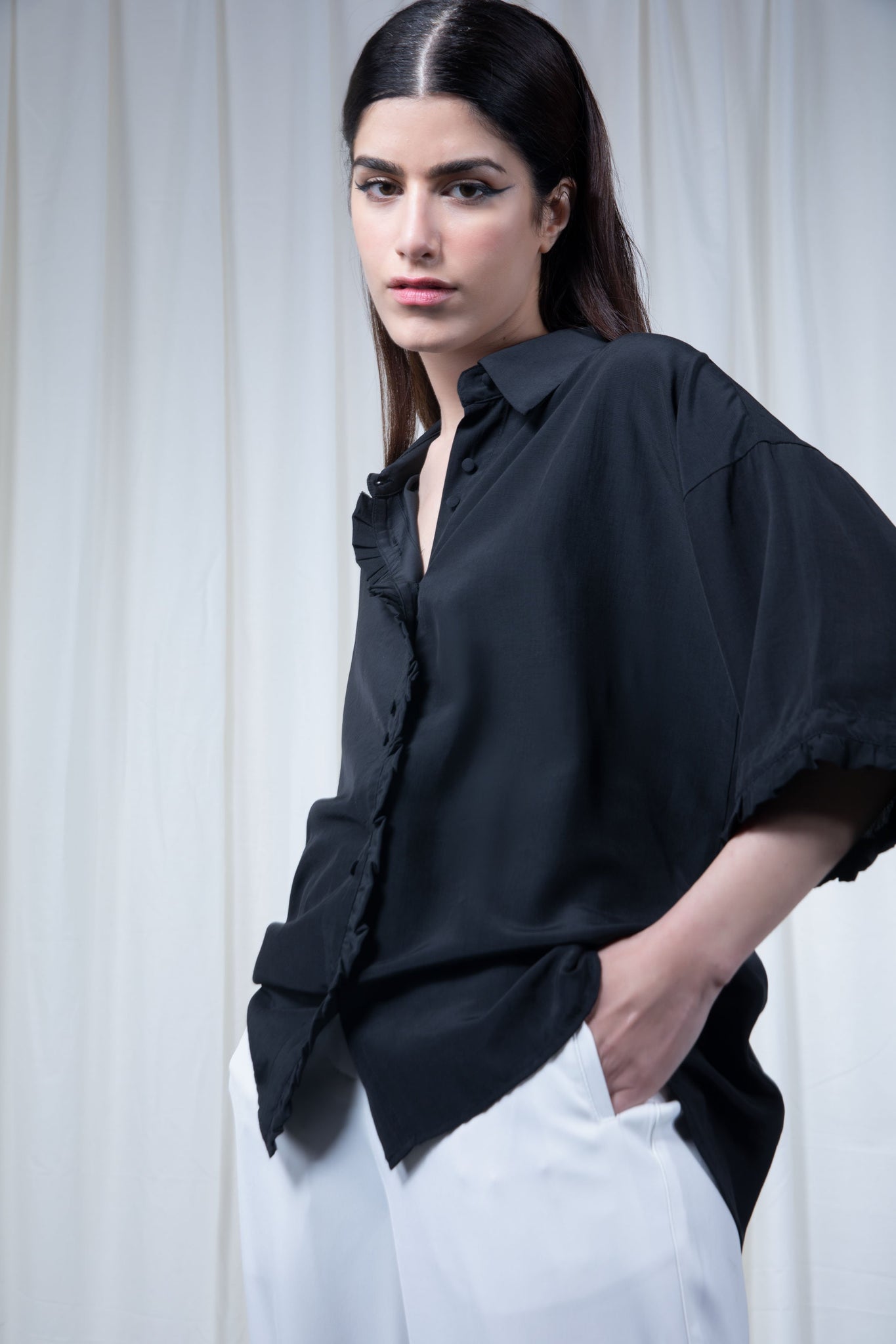Lapel collared shirt with short sleeves and loose fit. Front button closure.