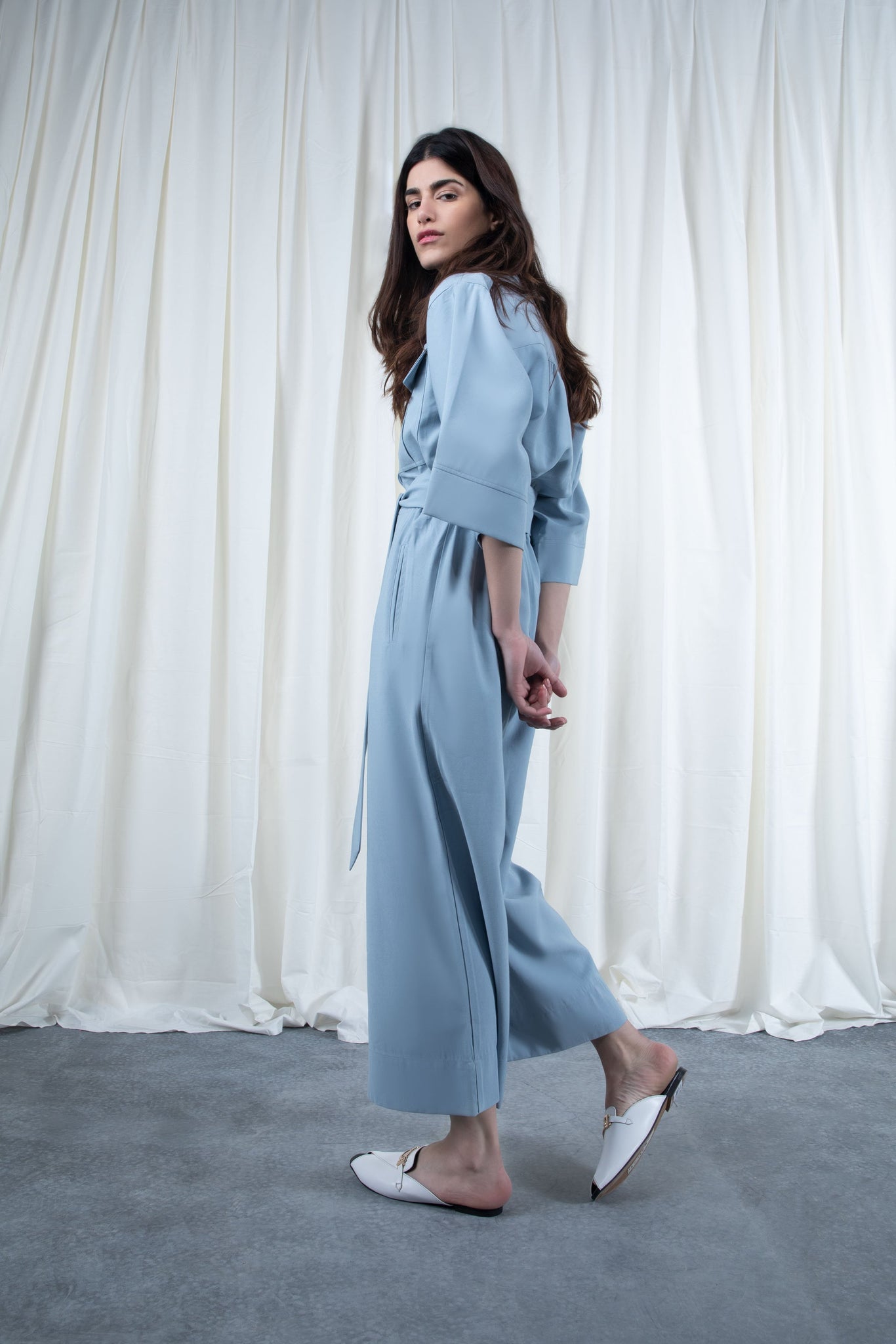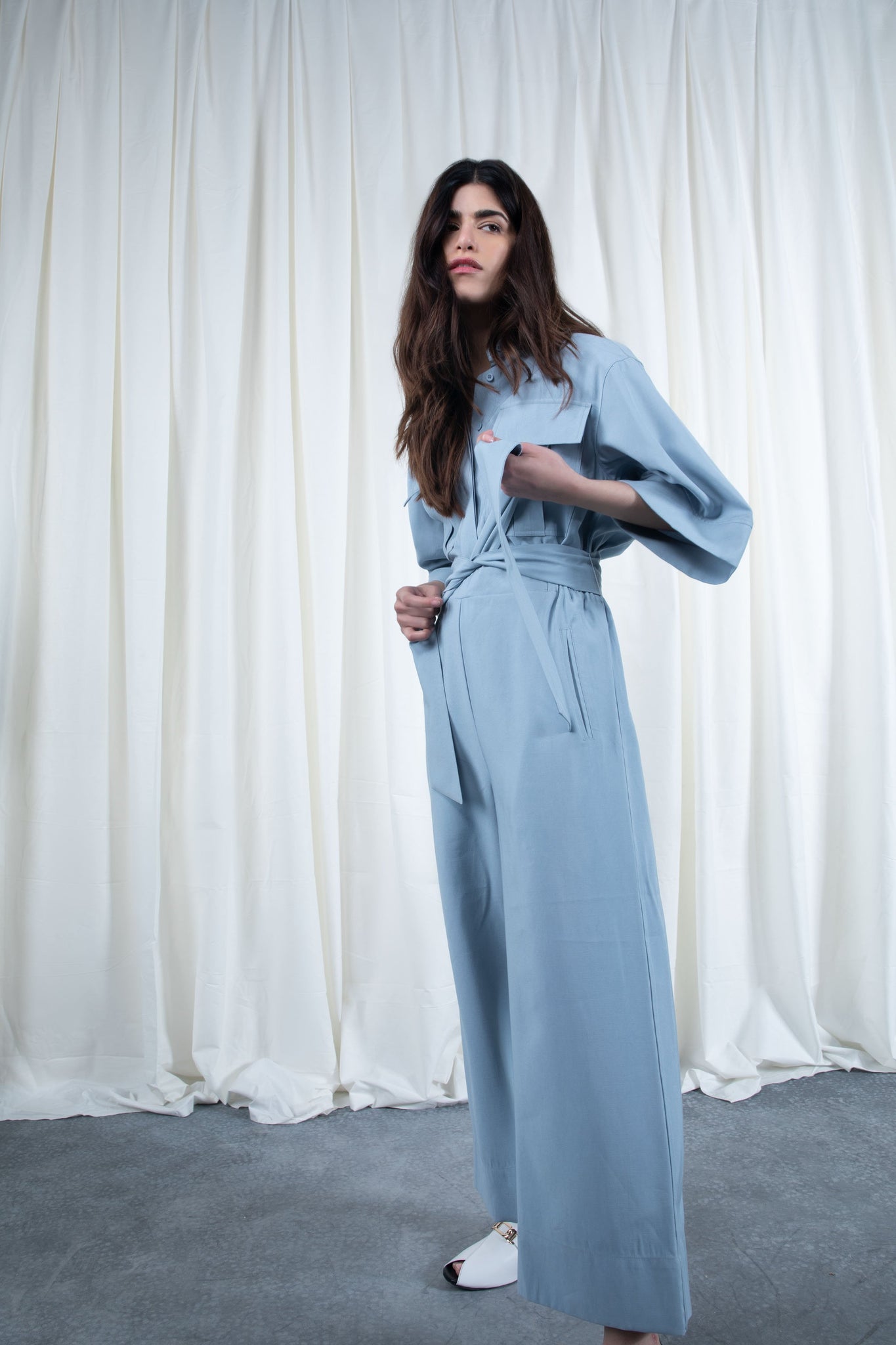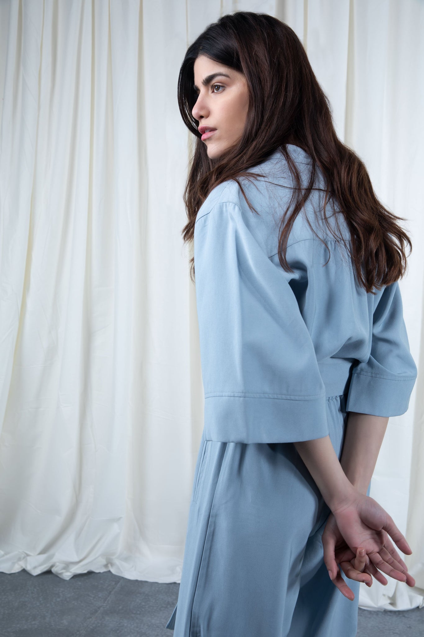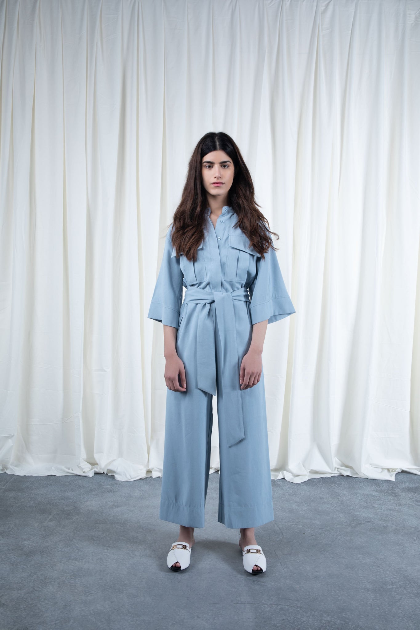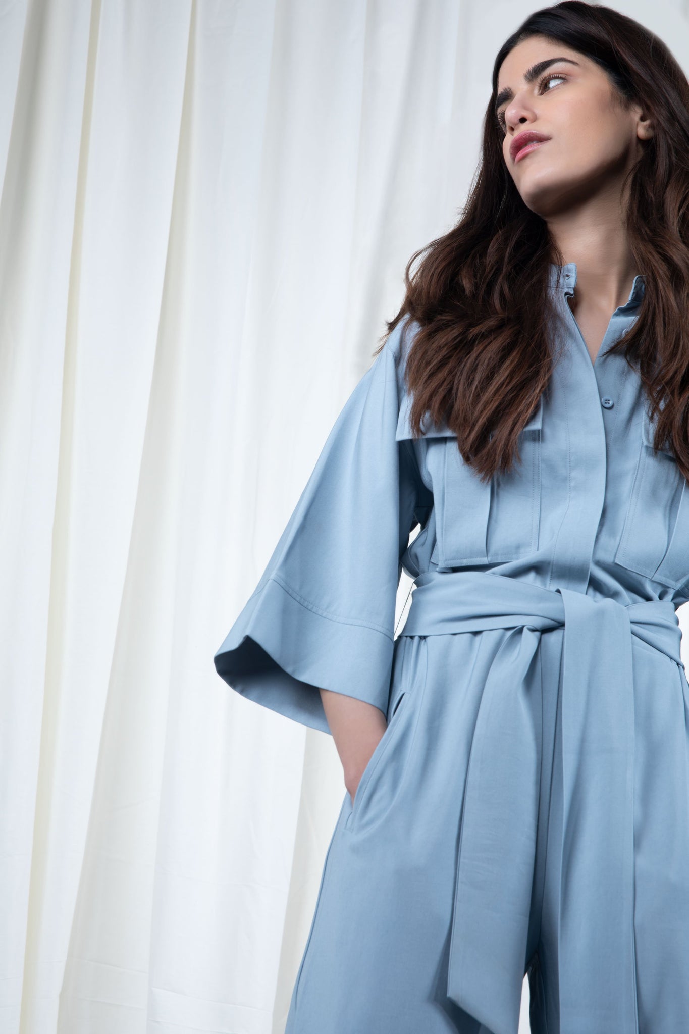 High neck with button down closure and short sleeves. Elastic waistband with adjustable front drawstring.