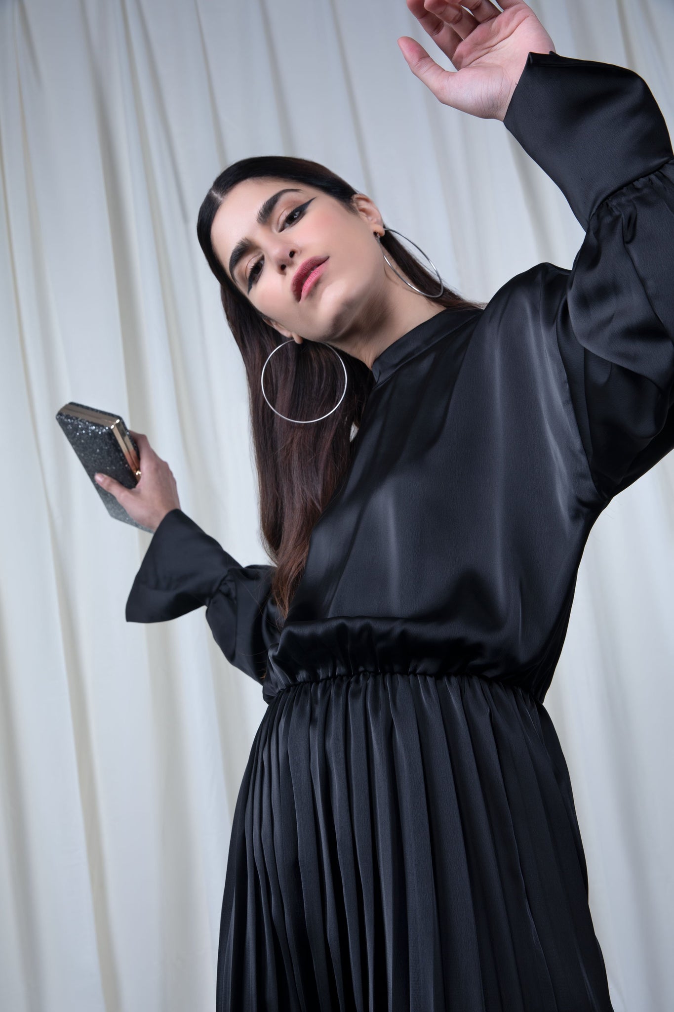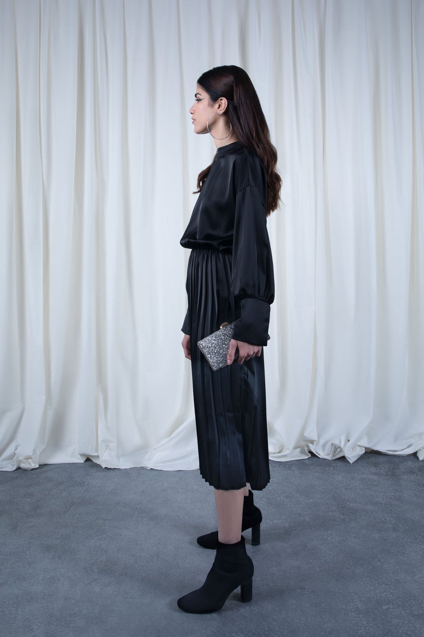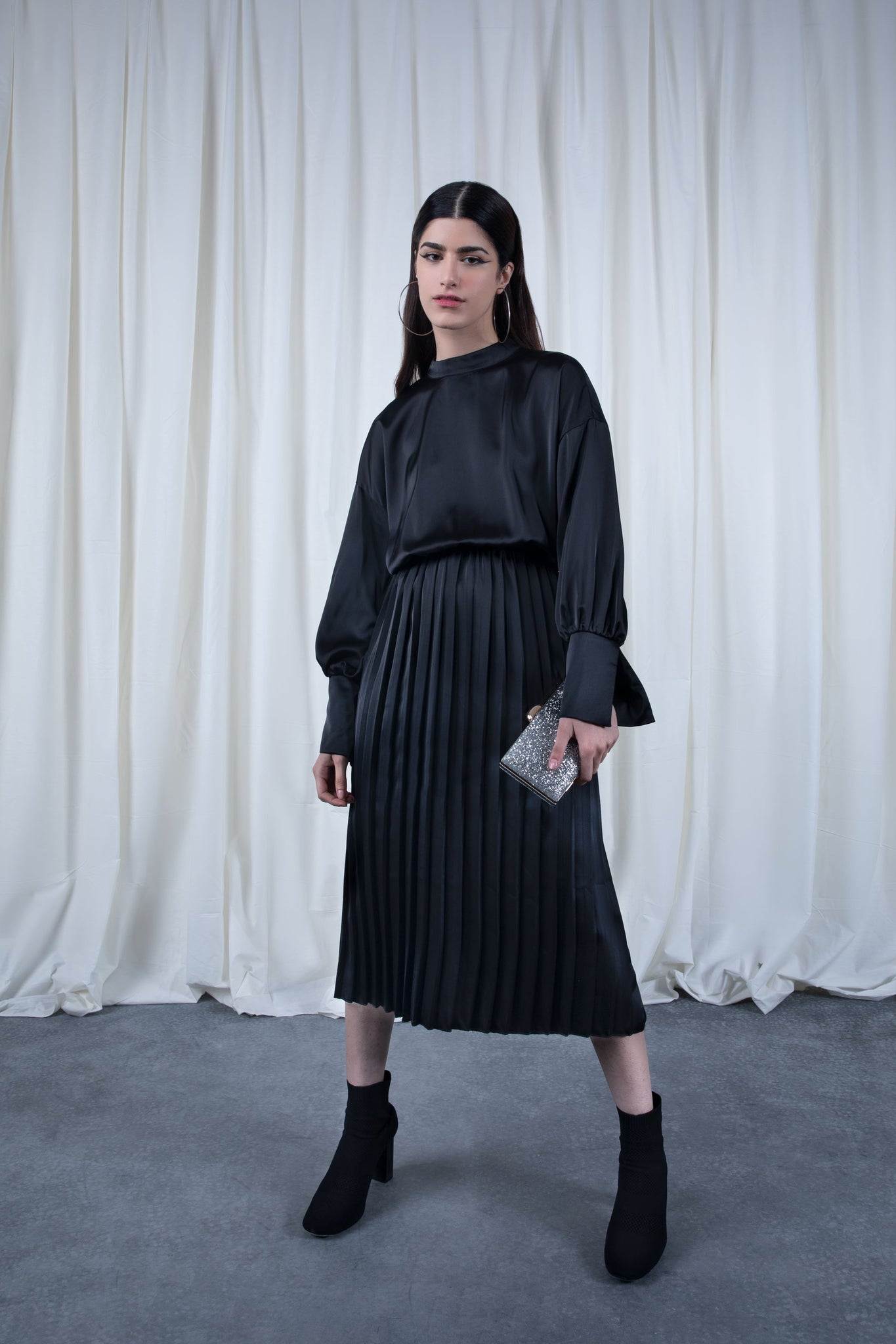 Dress with high collar and long puffed sleeves. Pleated detail at the hem. Elastic waistband.