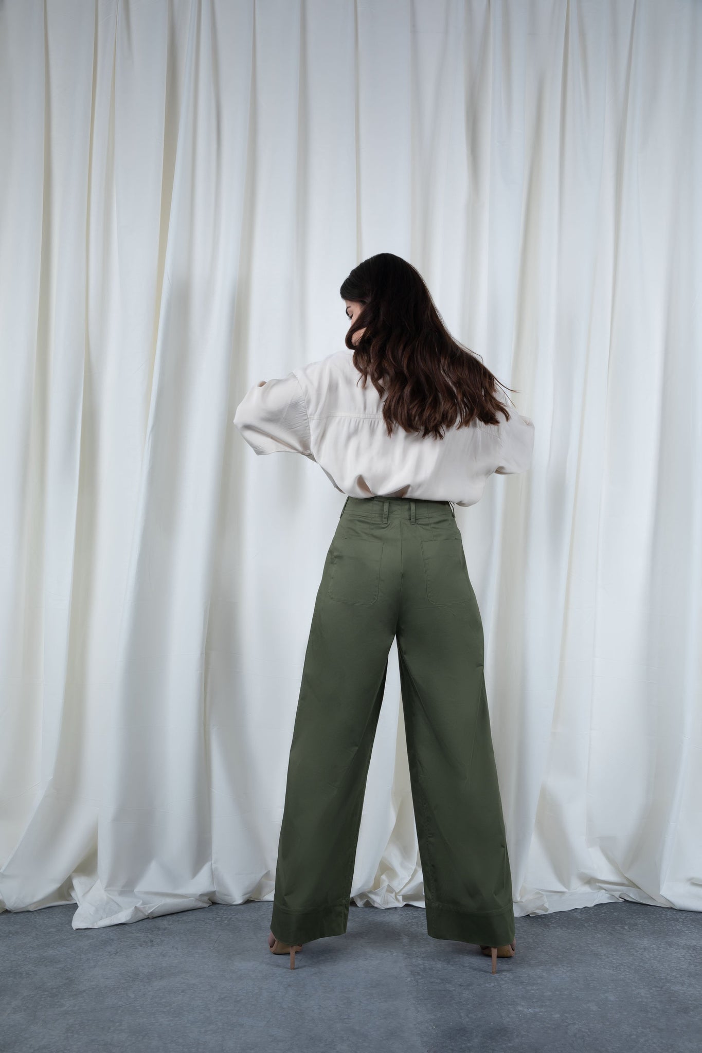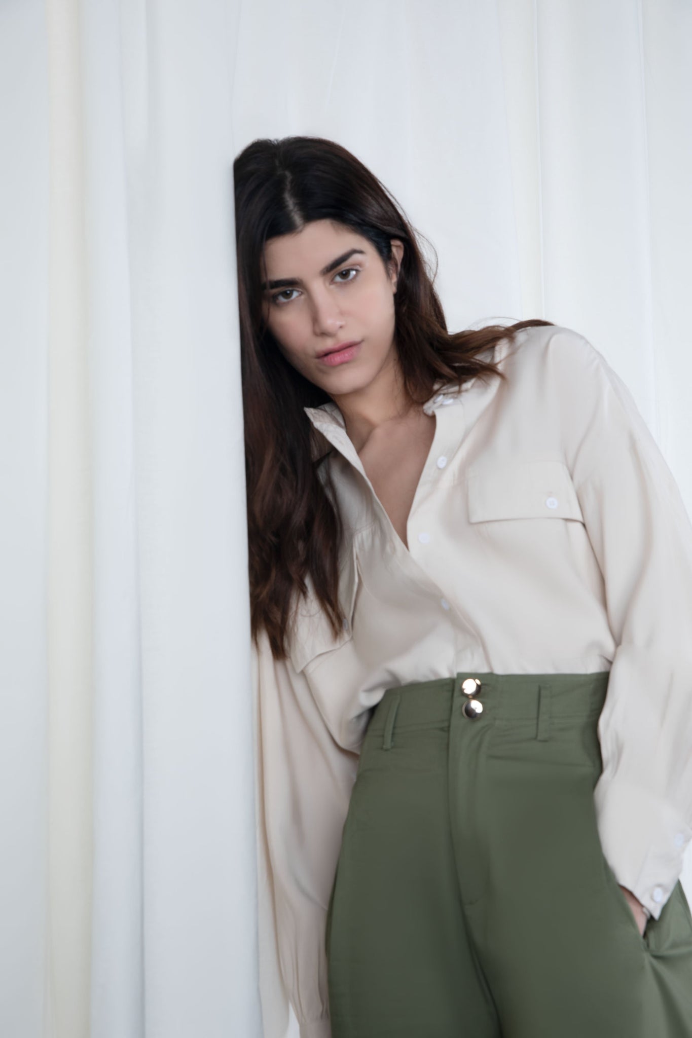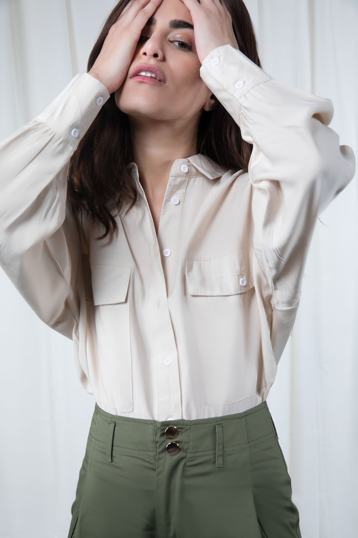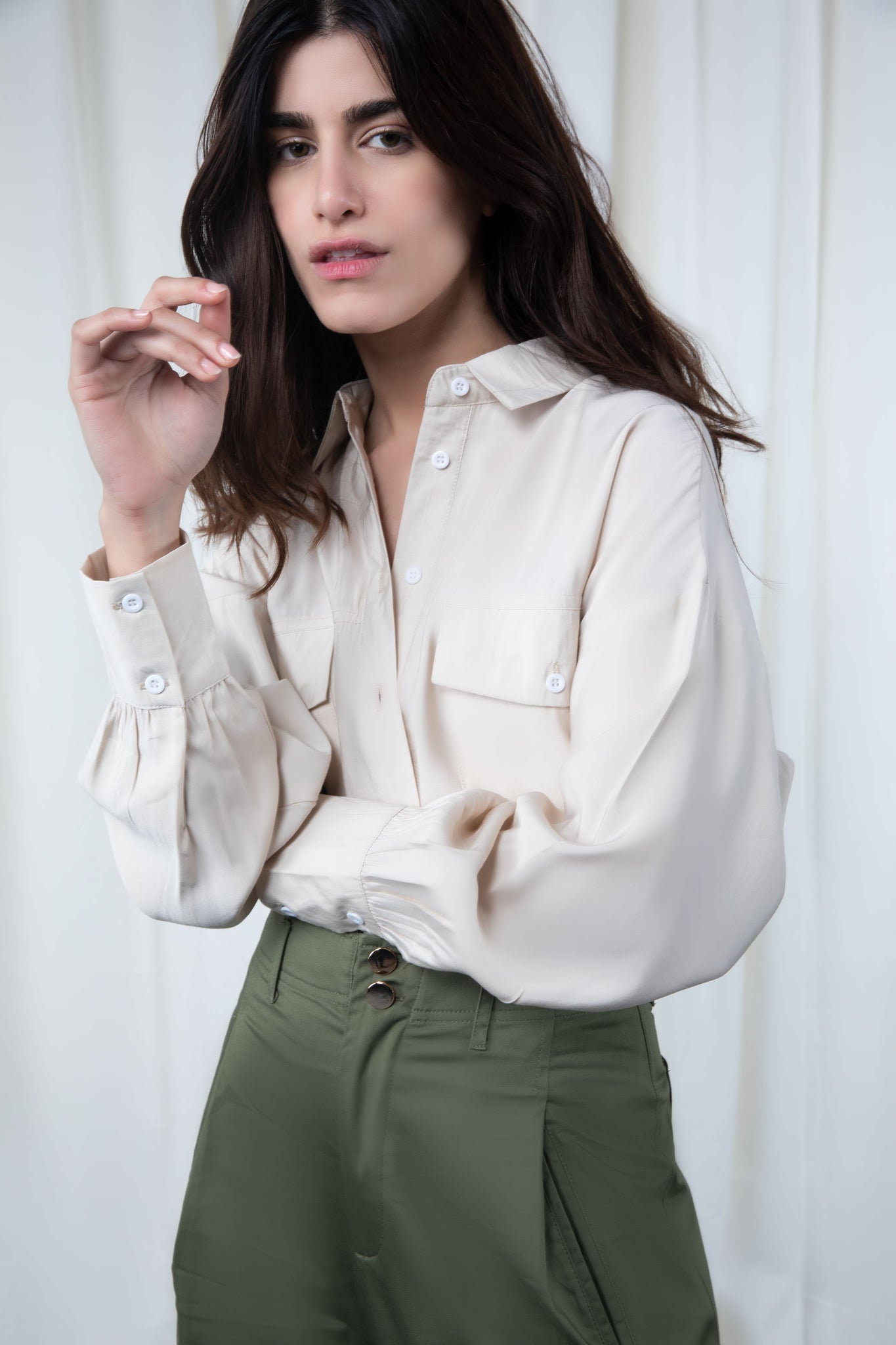 Straight collar shirt with front button closure and puffed sleeves. Front patch pockets with flaps.