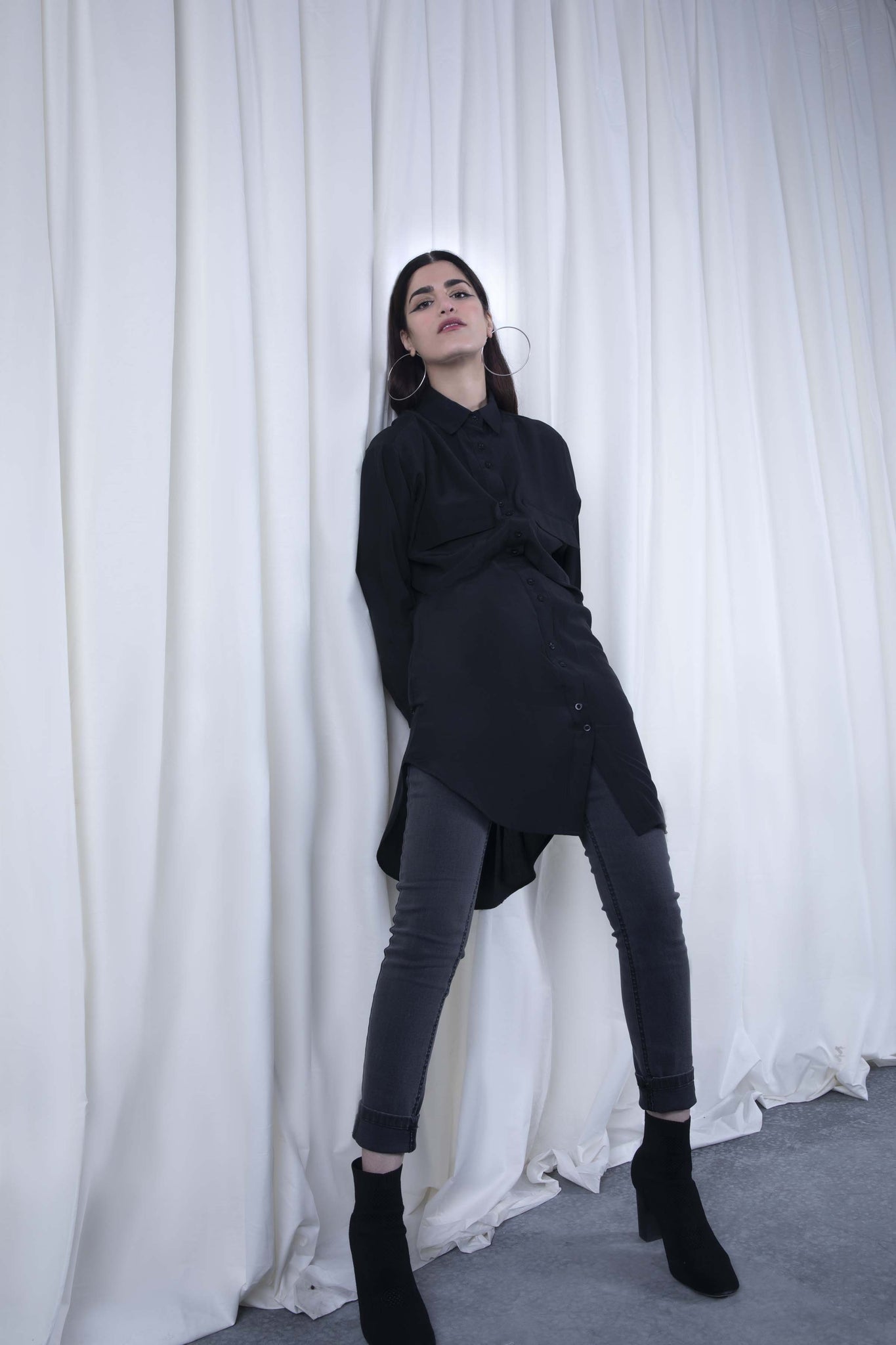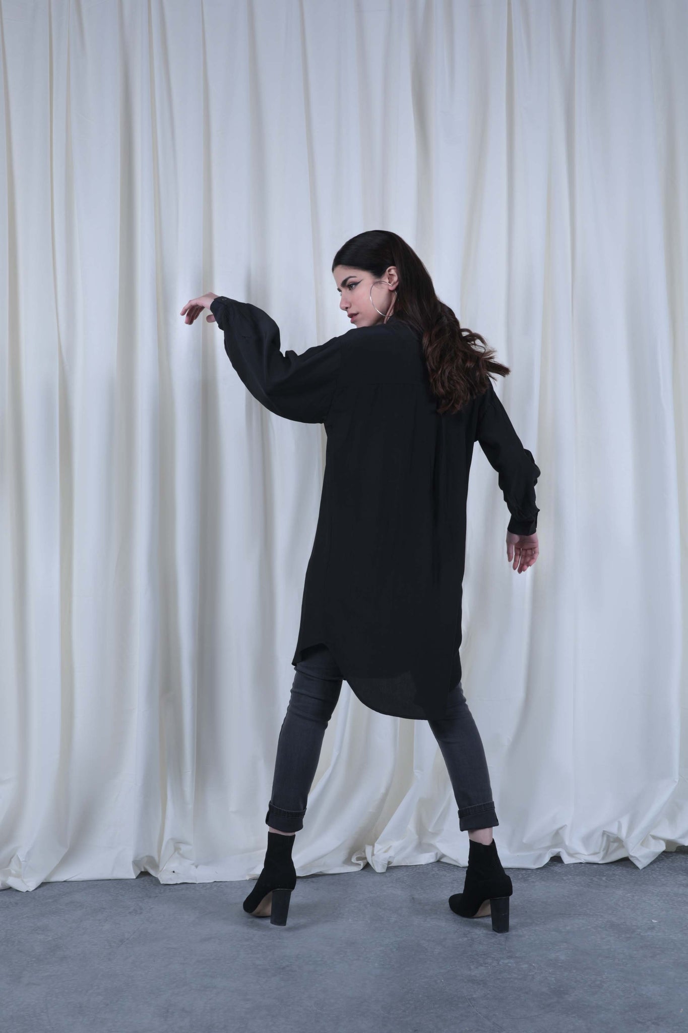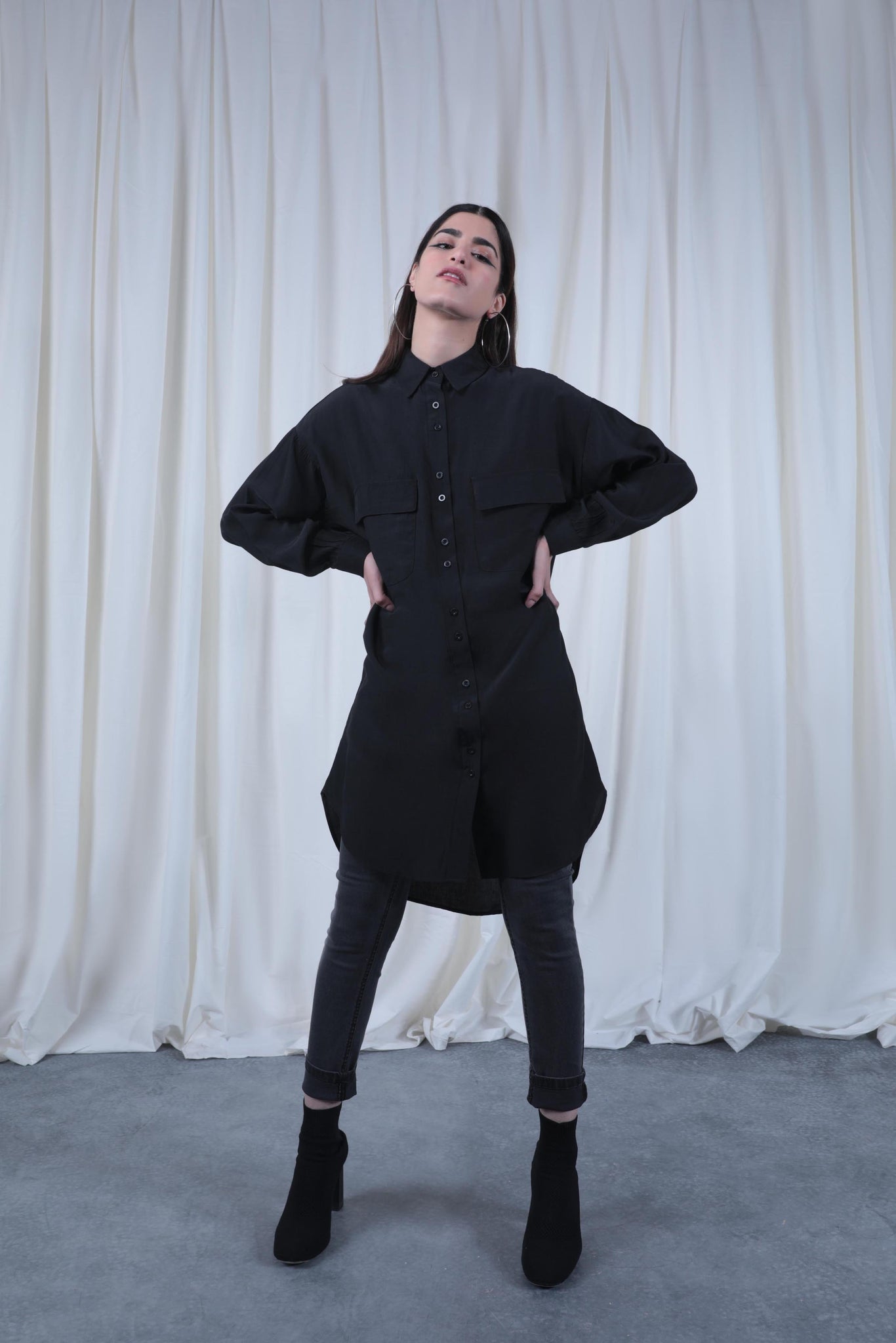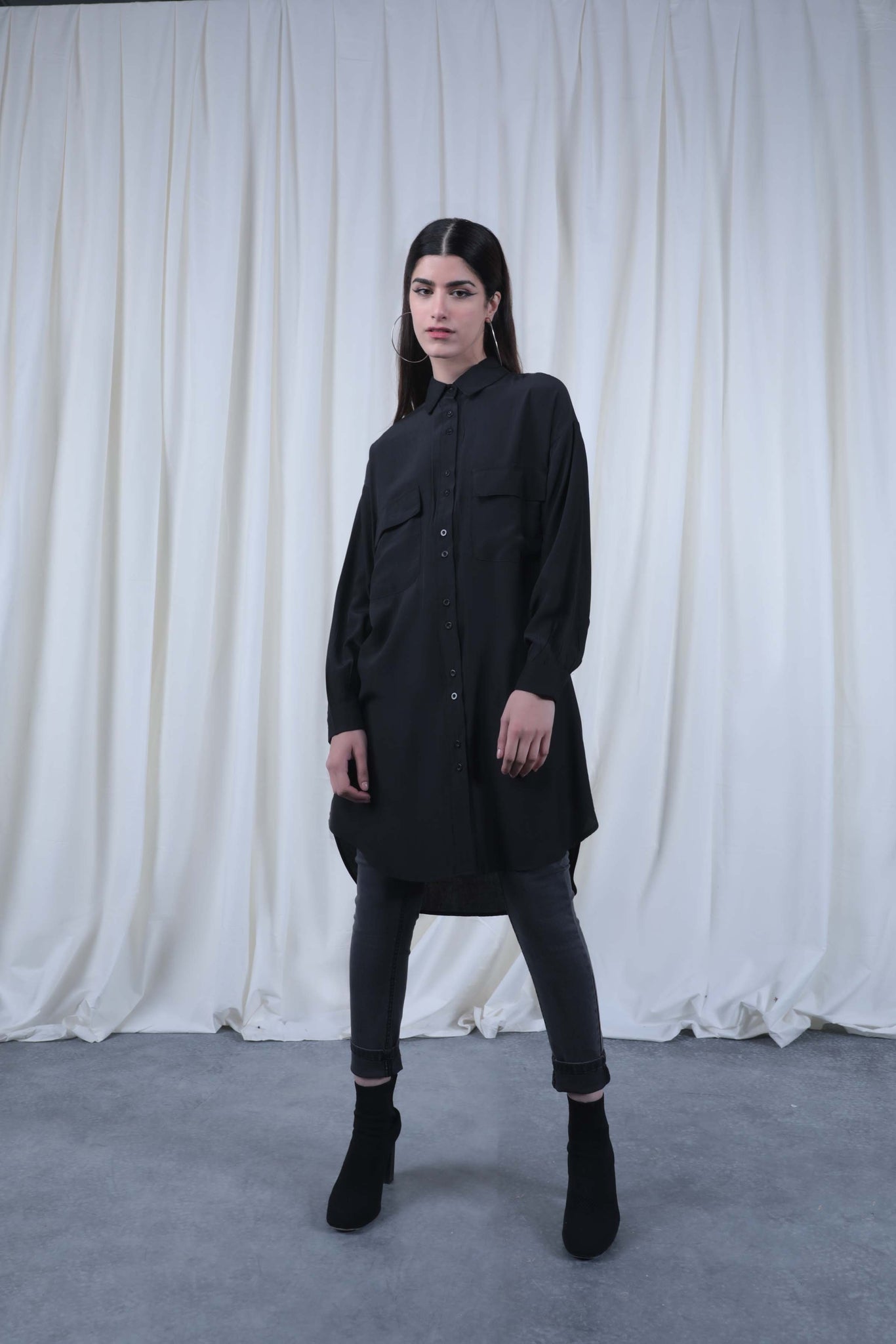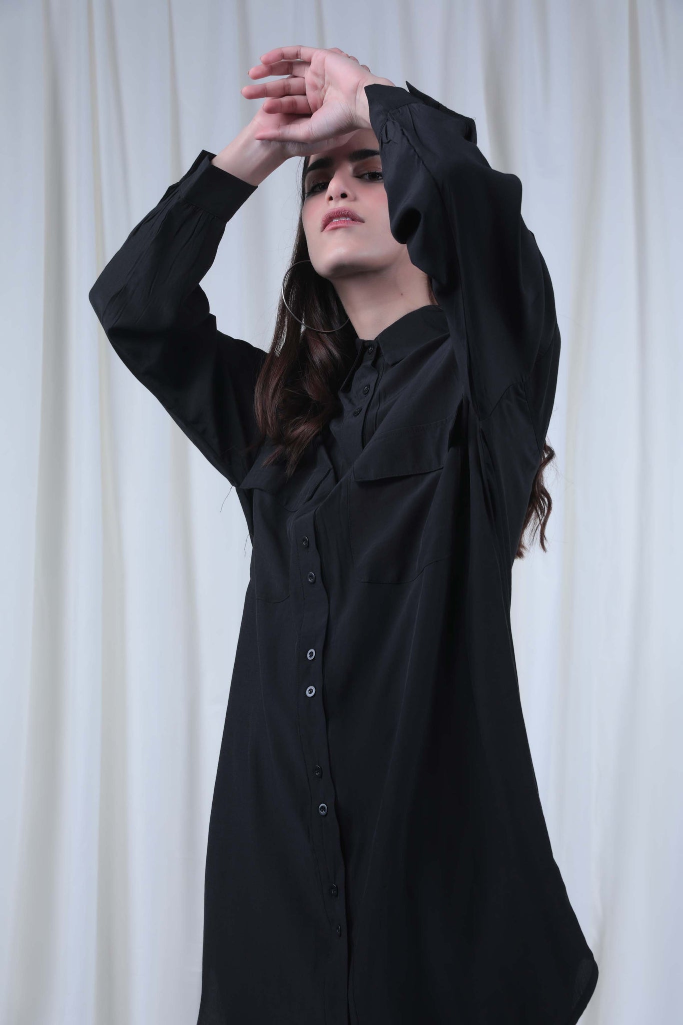 Straight collar shirt with front button closure and puffed sleeves. Long length and front patch pockets with flaps.