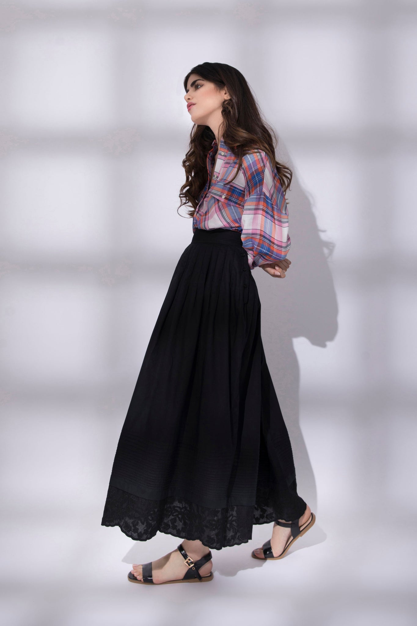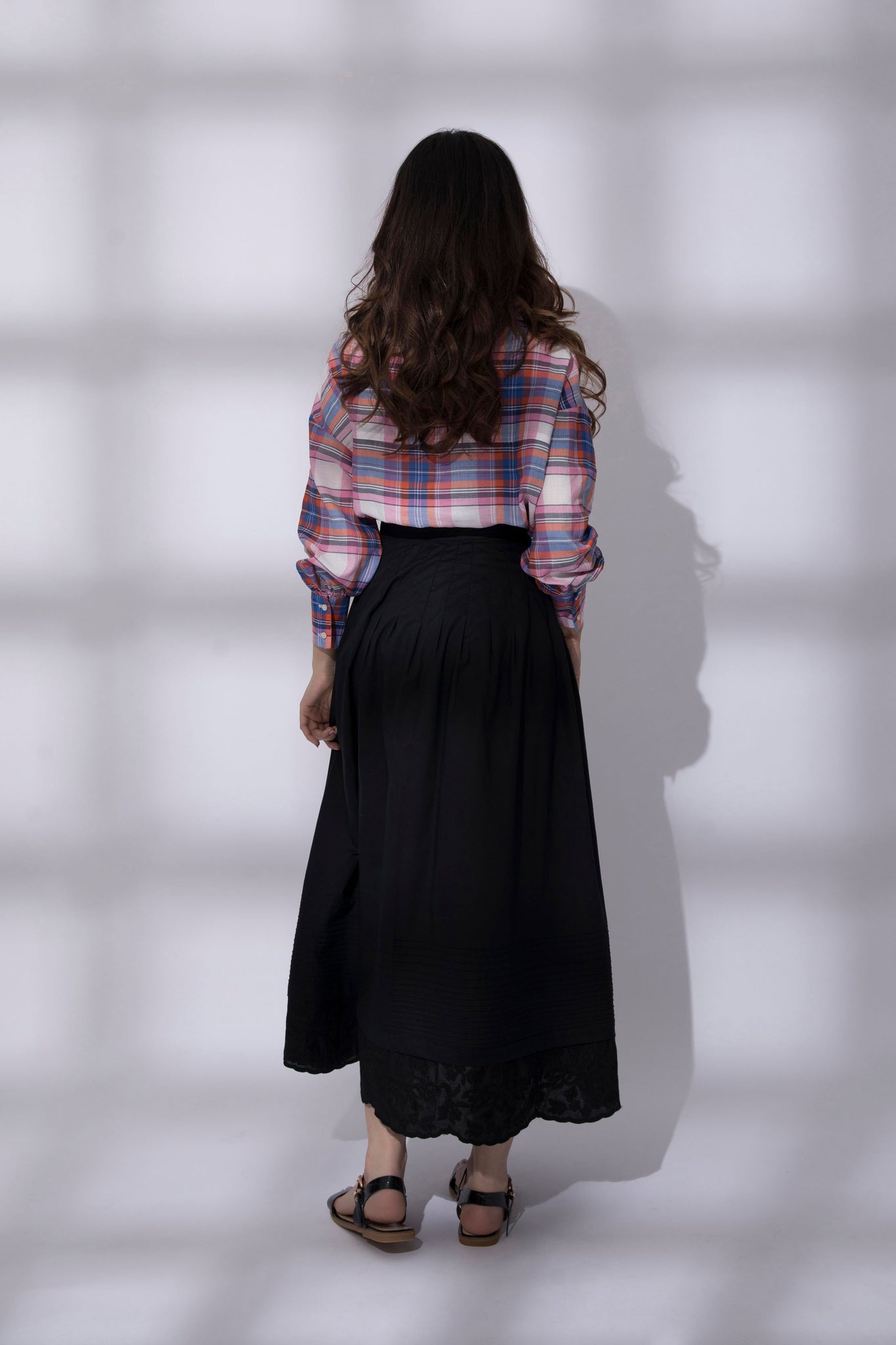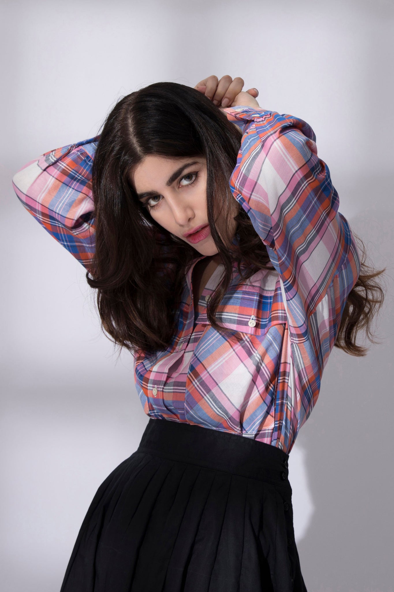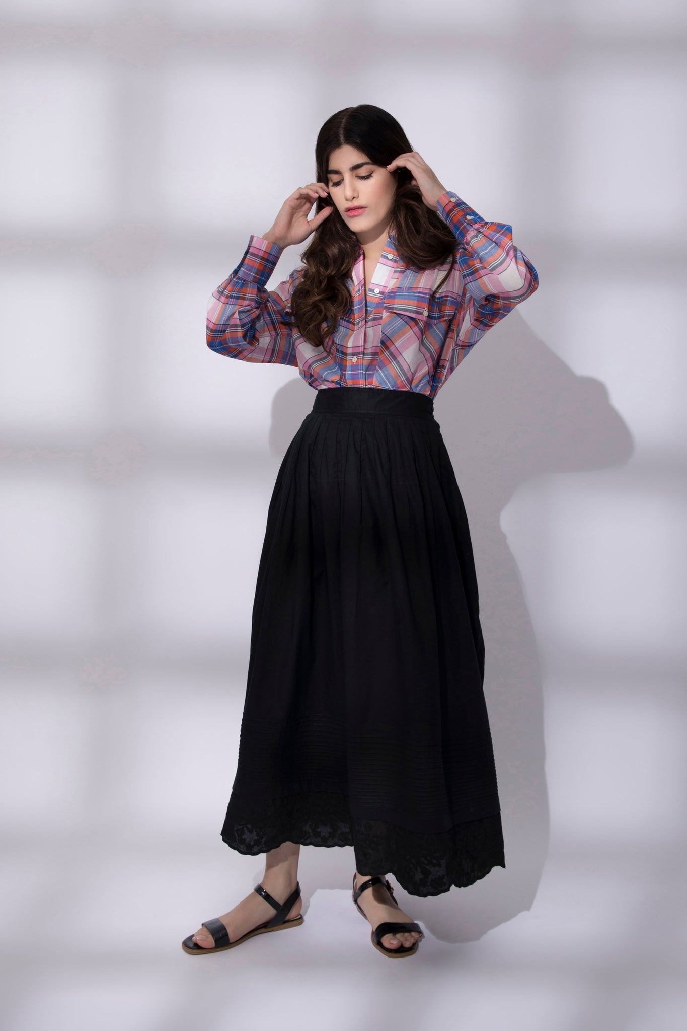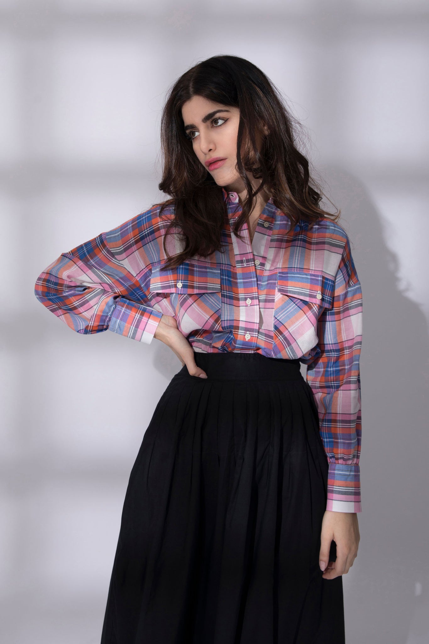 Loose fit shirt with pockets made in check fabric. Point collar and curved hem with longer back.