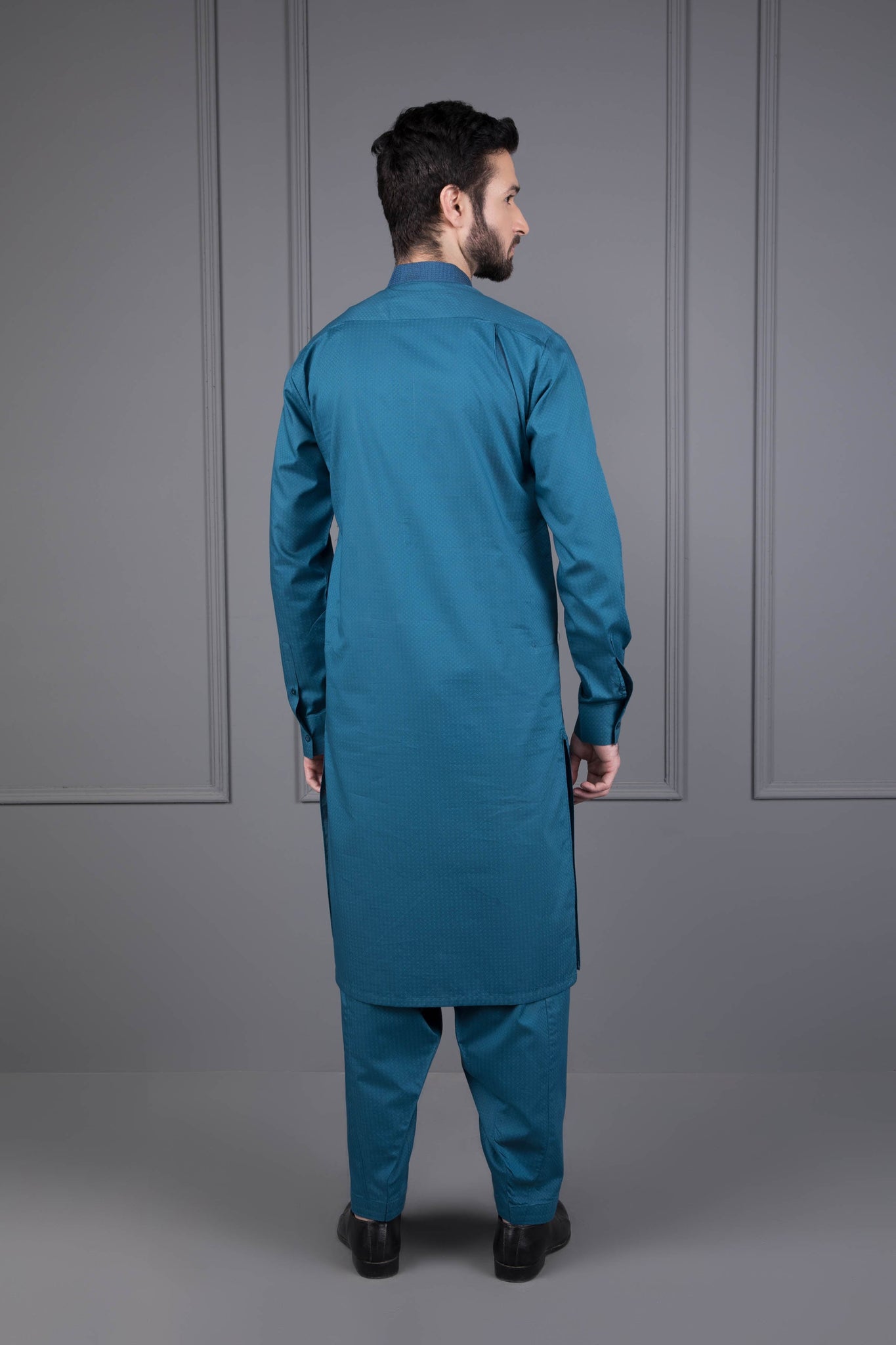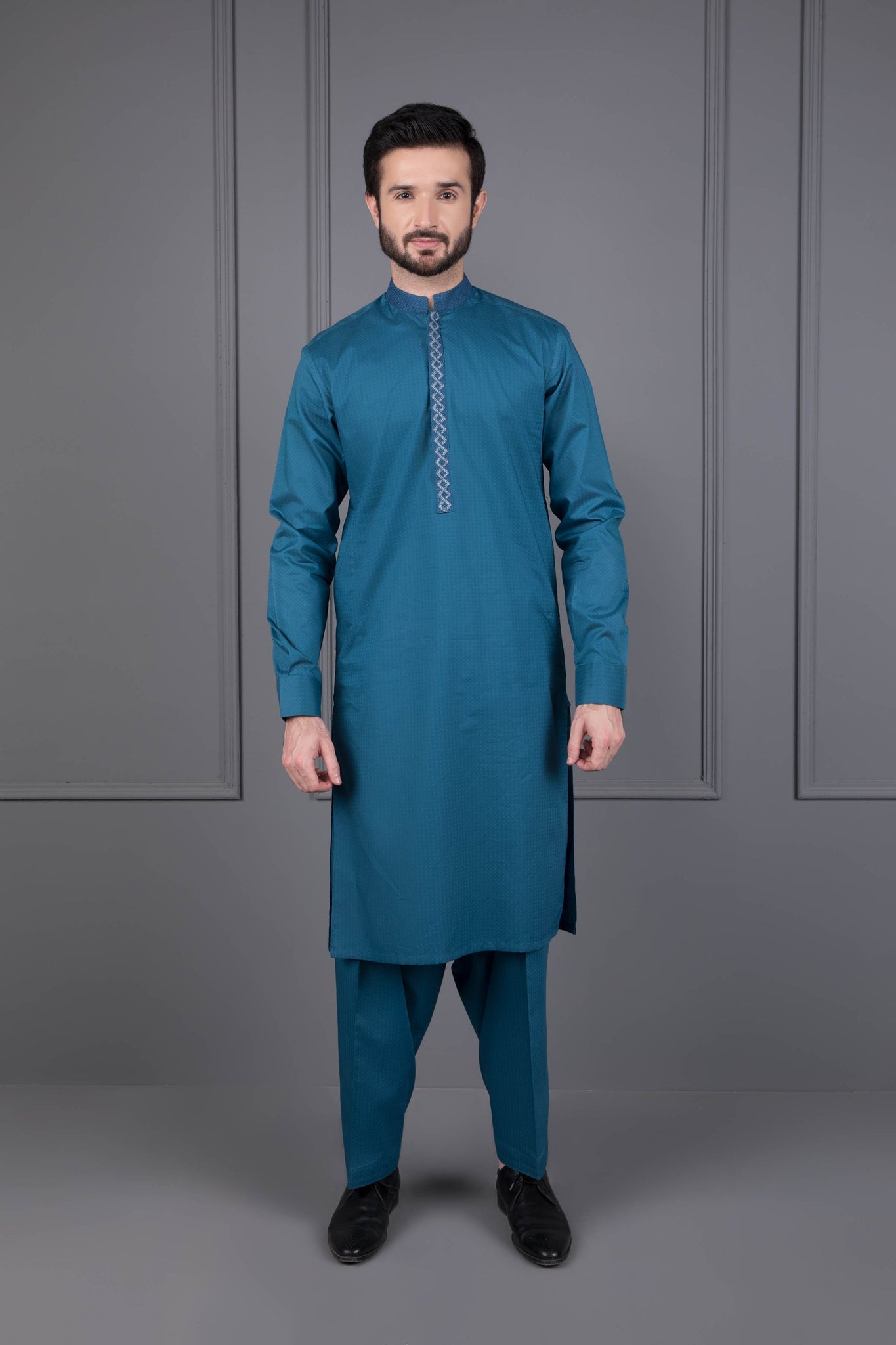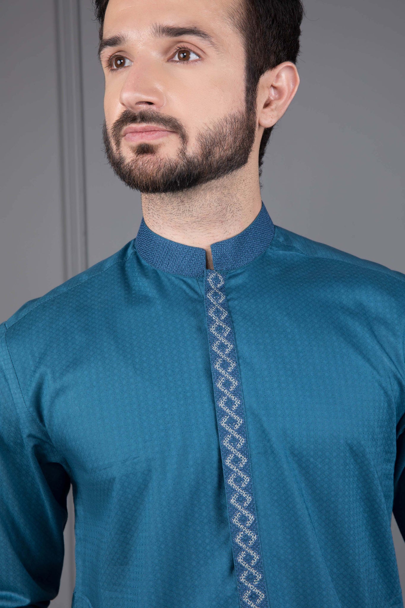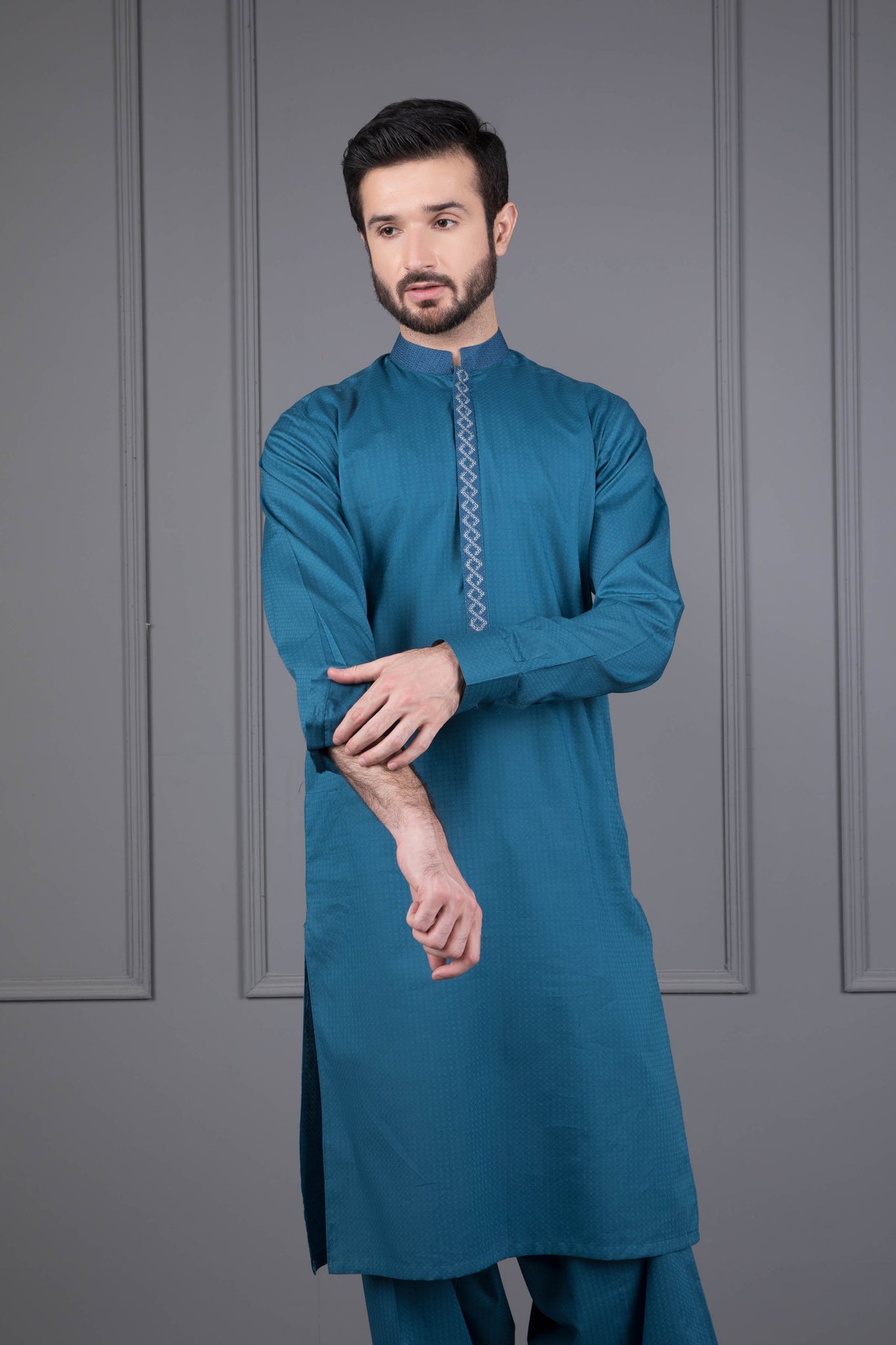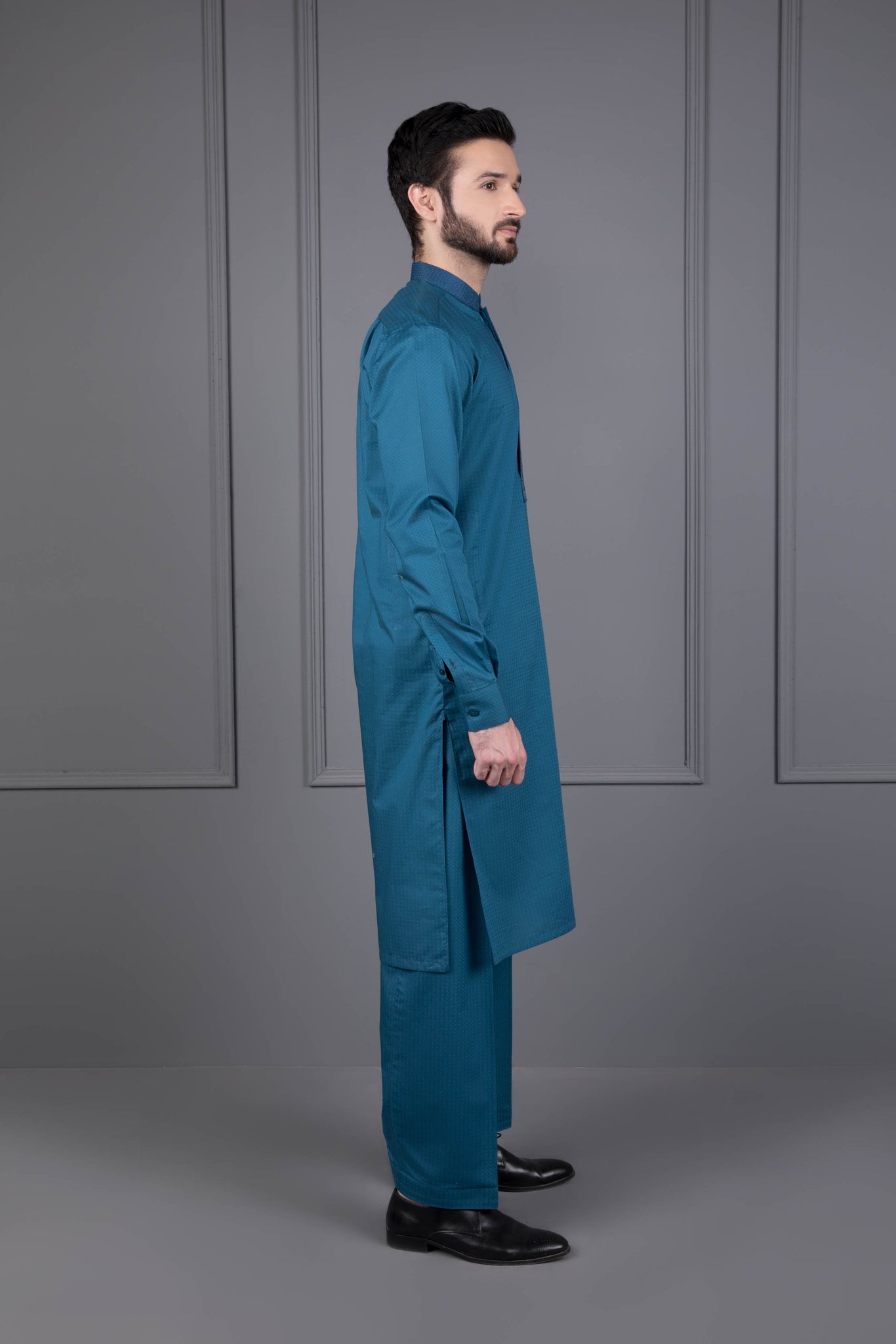 Modern and elegant allure distinguishes this teal hued kurta and shalwar with slim-fit silhouette.