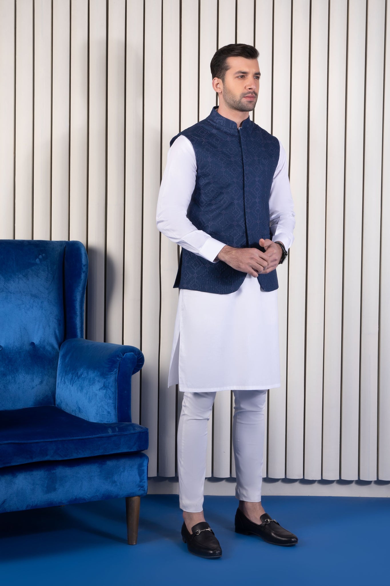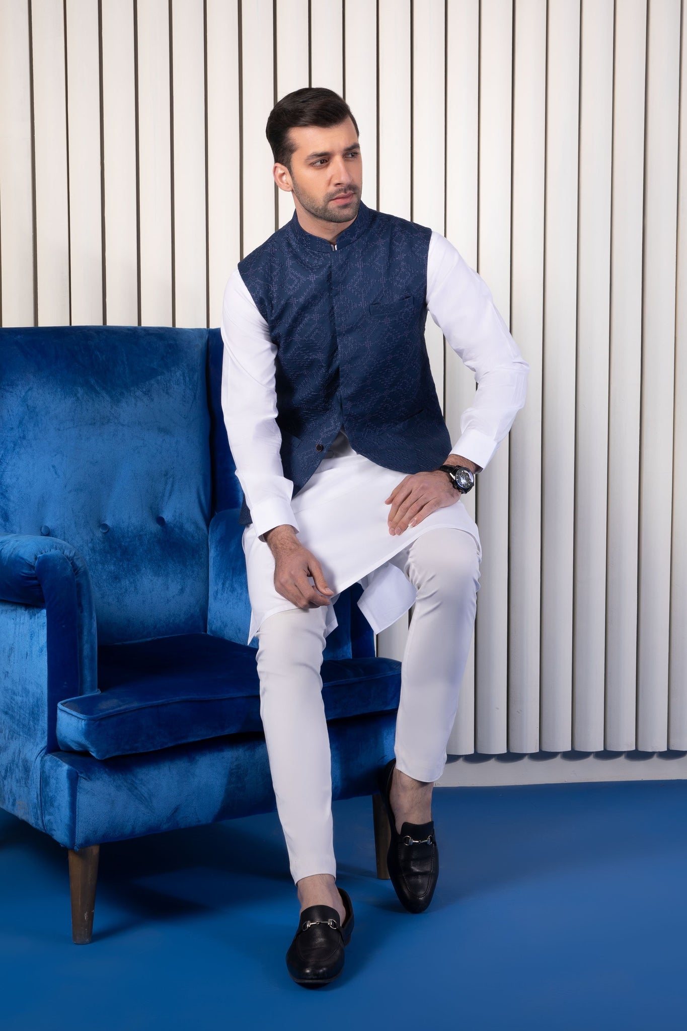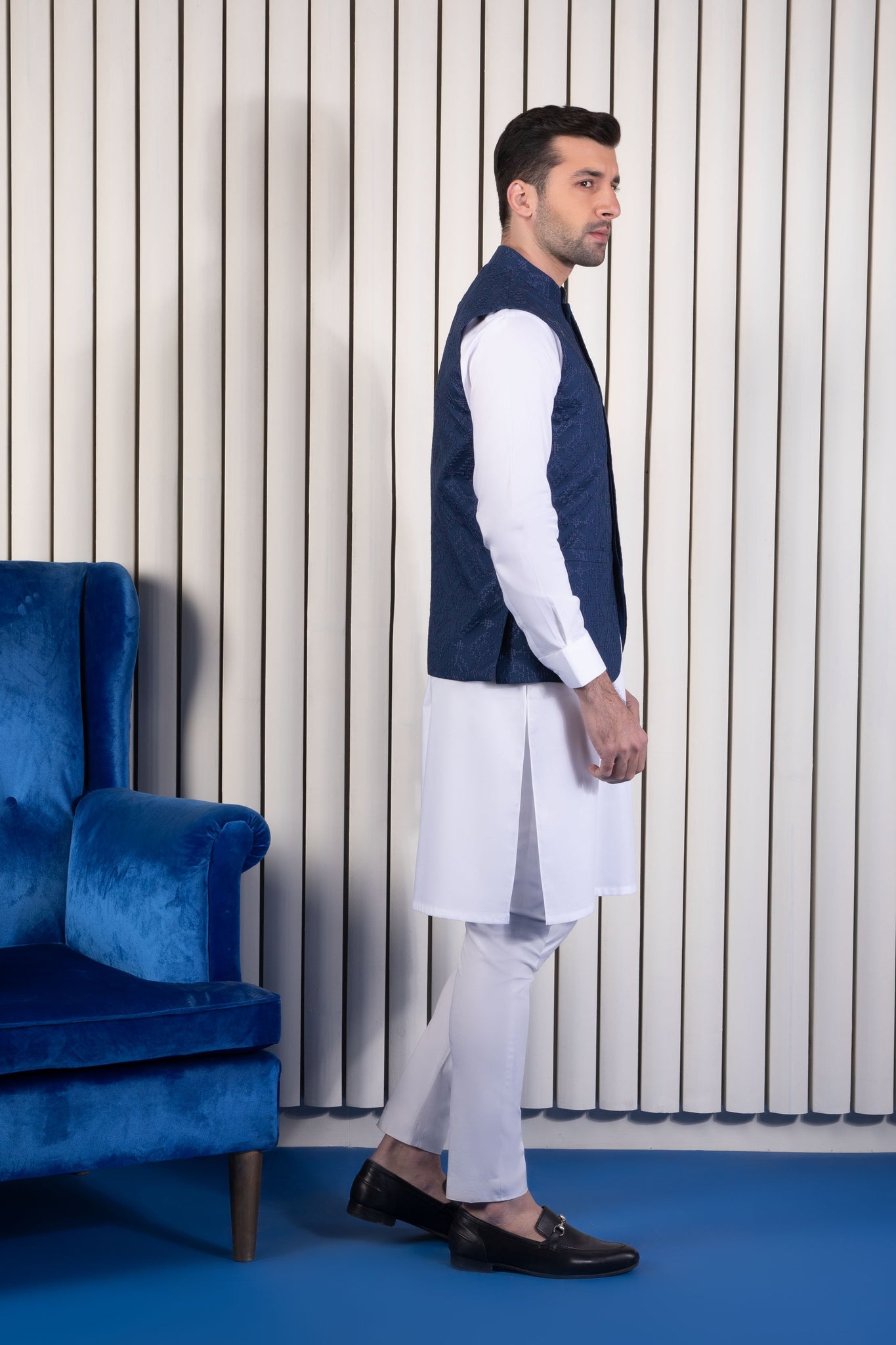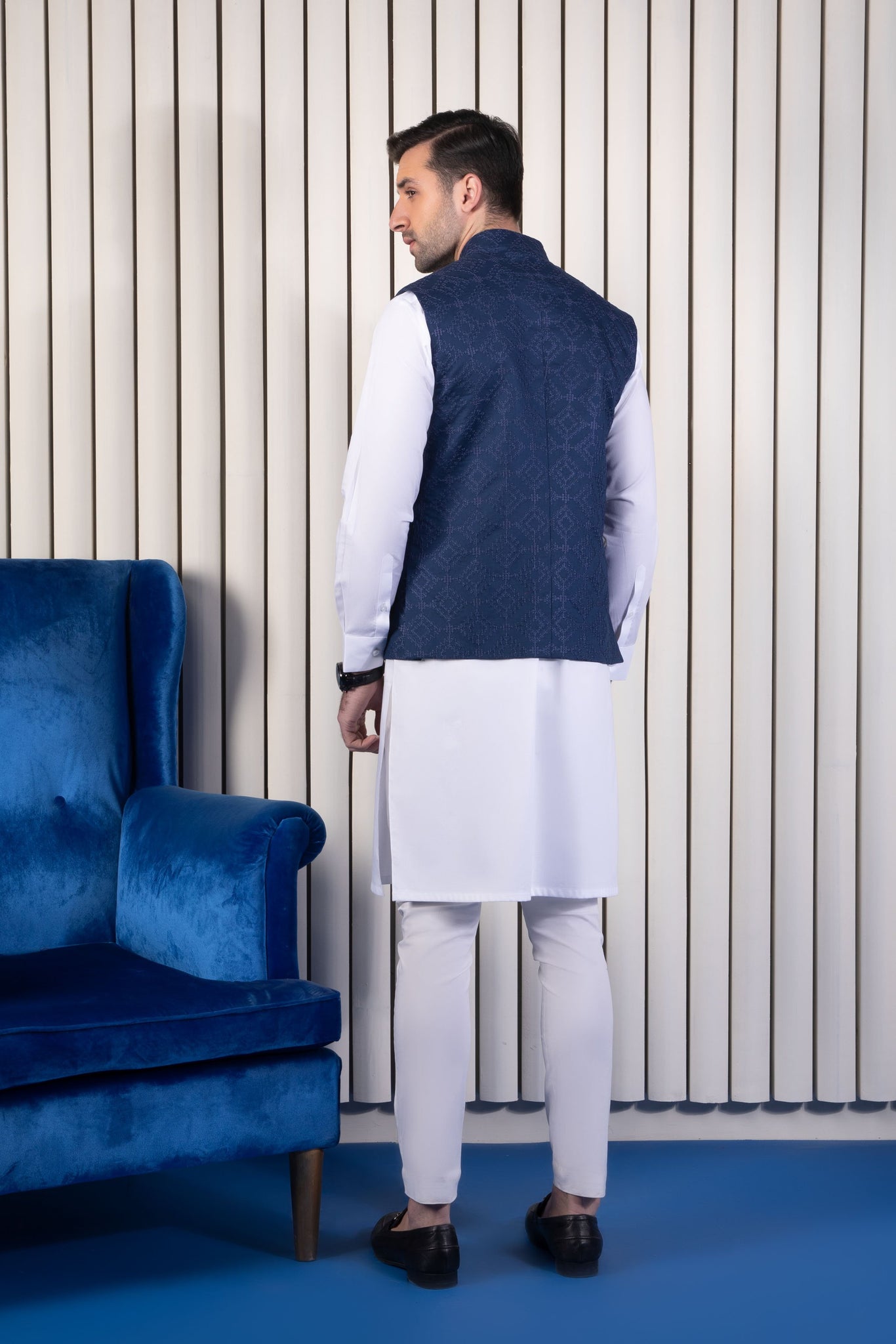 The midnight blue embroidered waistcoat when paired with black suit will look enthralling.