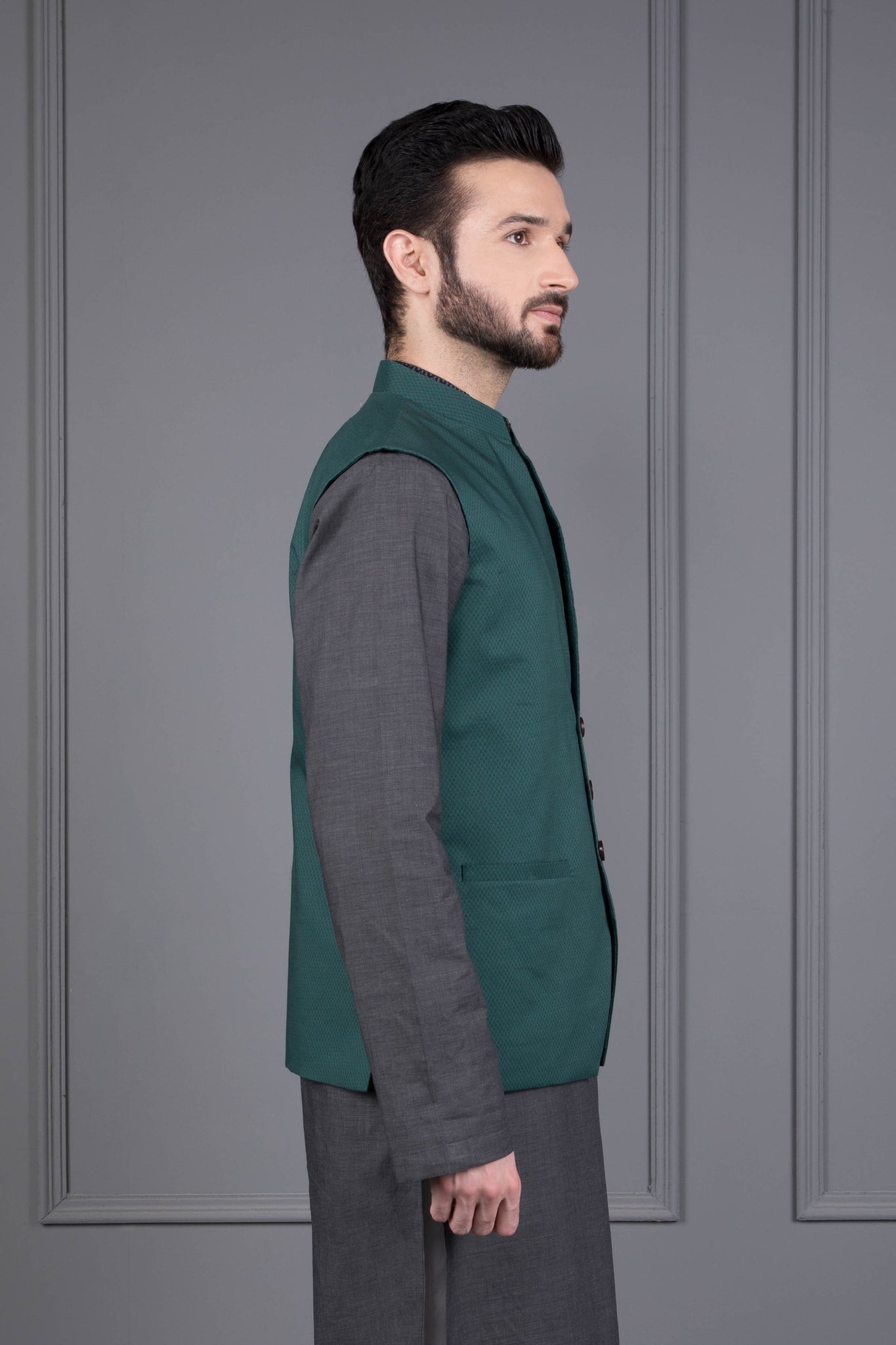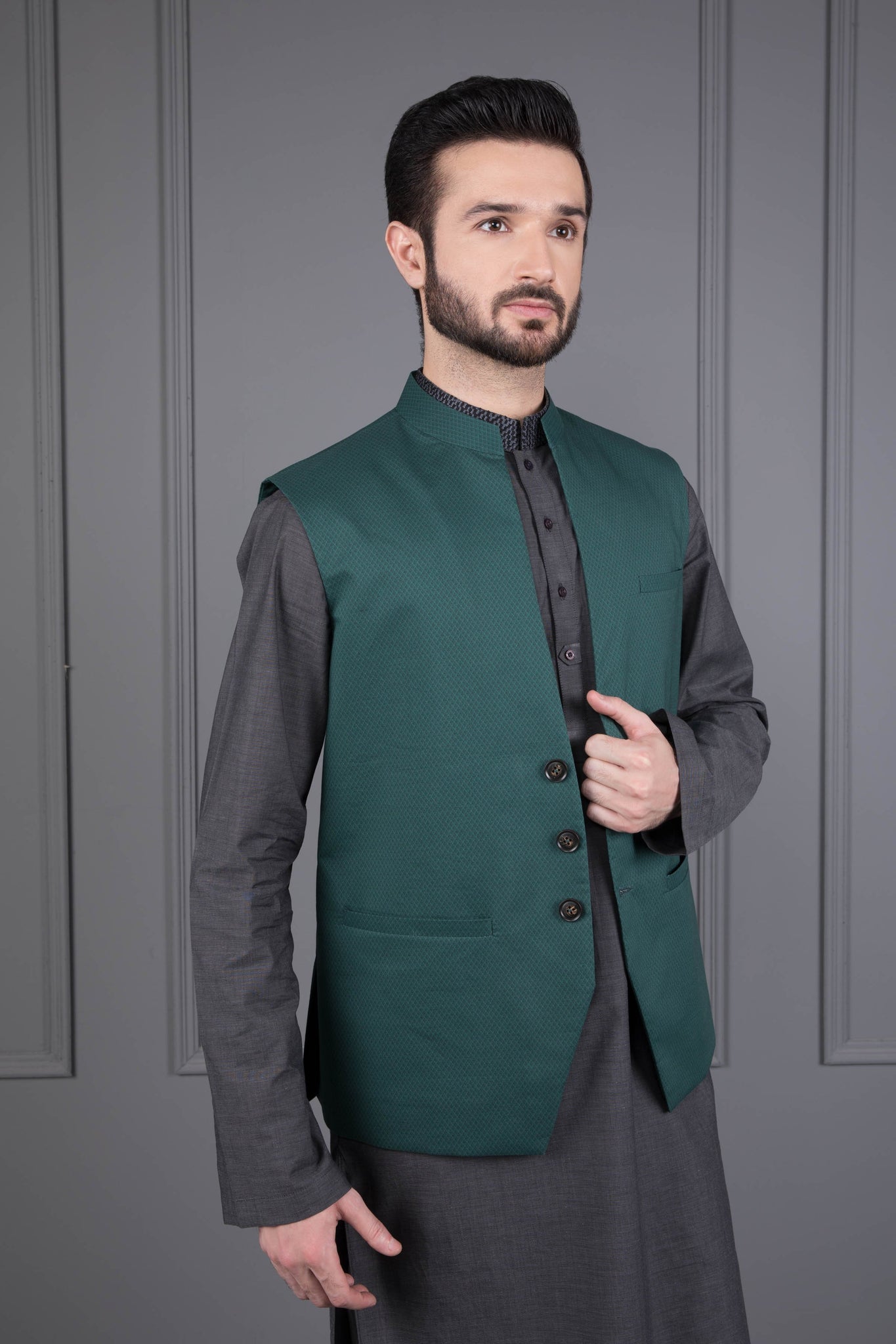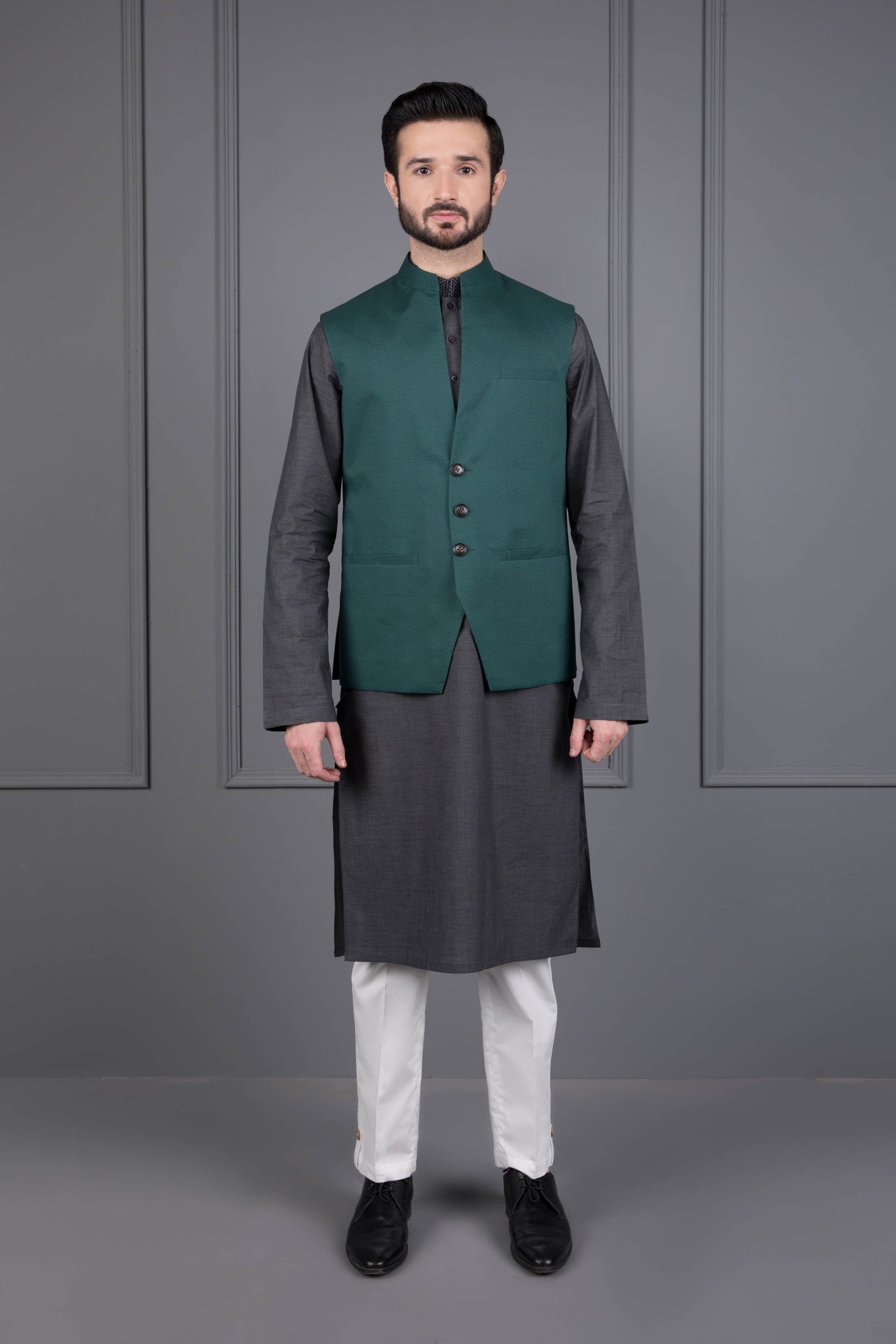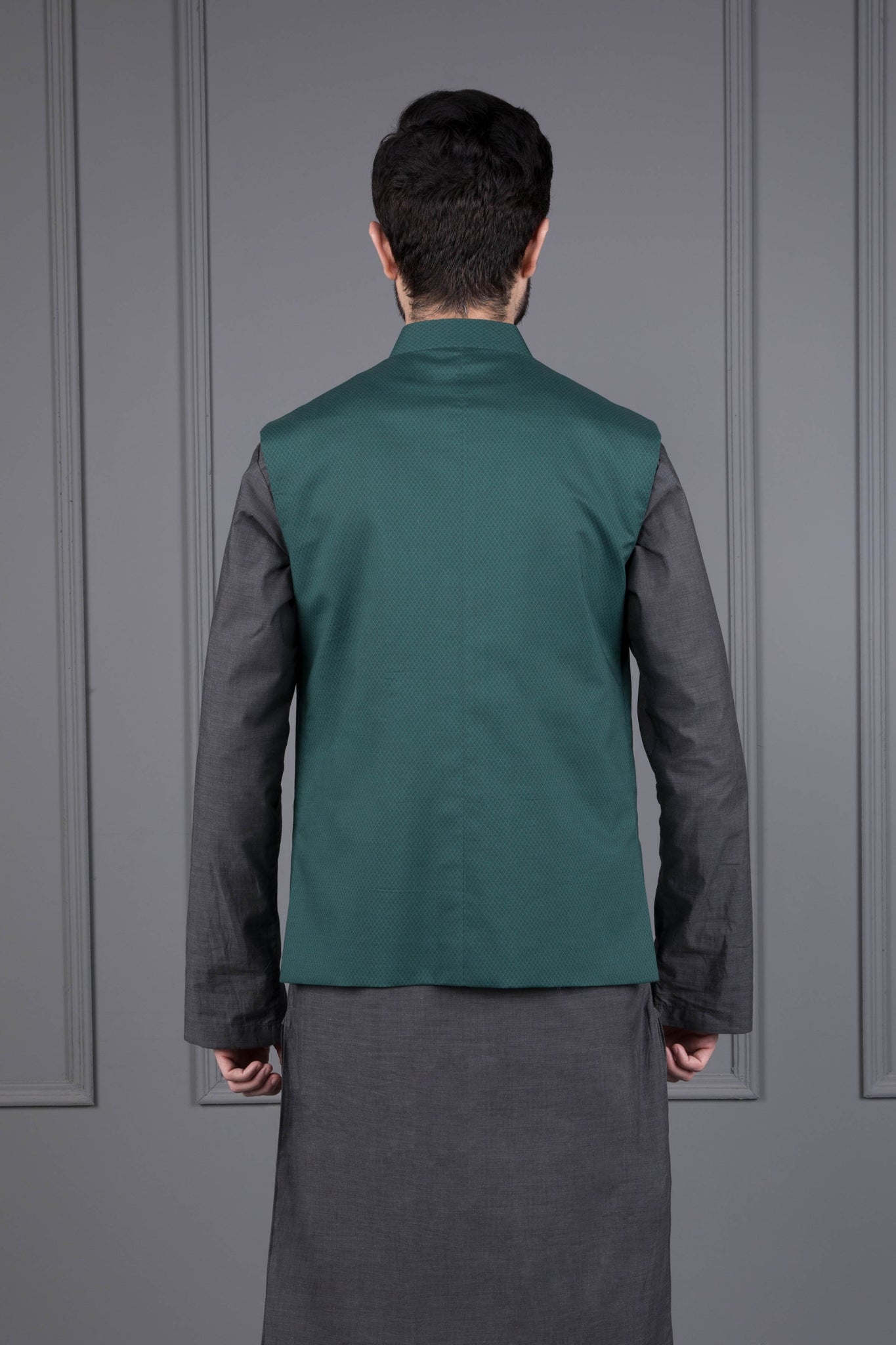 This self-printed green kurta features band collar and full sleeves for a charming appeal.